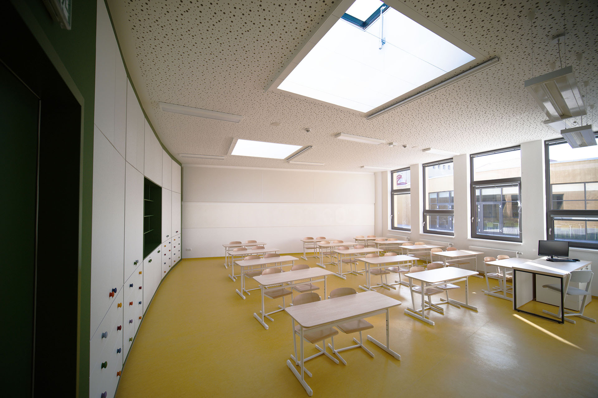 Ve školních budovách, kde je vysoká koncentrace lidí a akustická zátěž, je zásadní vytvořit prostředí, které bude vizuálně příjemné, hygienické a zároveň podpoří soustředění. Právě akustický komfort je v učebnách i společných prostorách jedním z nejdůležitějších parametrů – ovlivňuje nejen srozumitelnost řeči, ale i celkovou pohodu dětí a pedagogů. Architekti proto věnovali velkou pozornost jak prostorovému uspořádání, tak výběru materiálů, které přispívají ke snížení hluku a zlepšení kvality vzduchu.