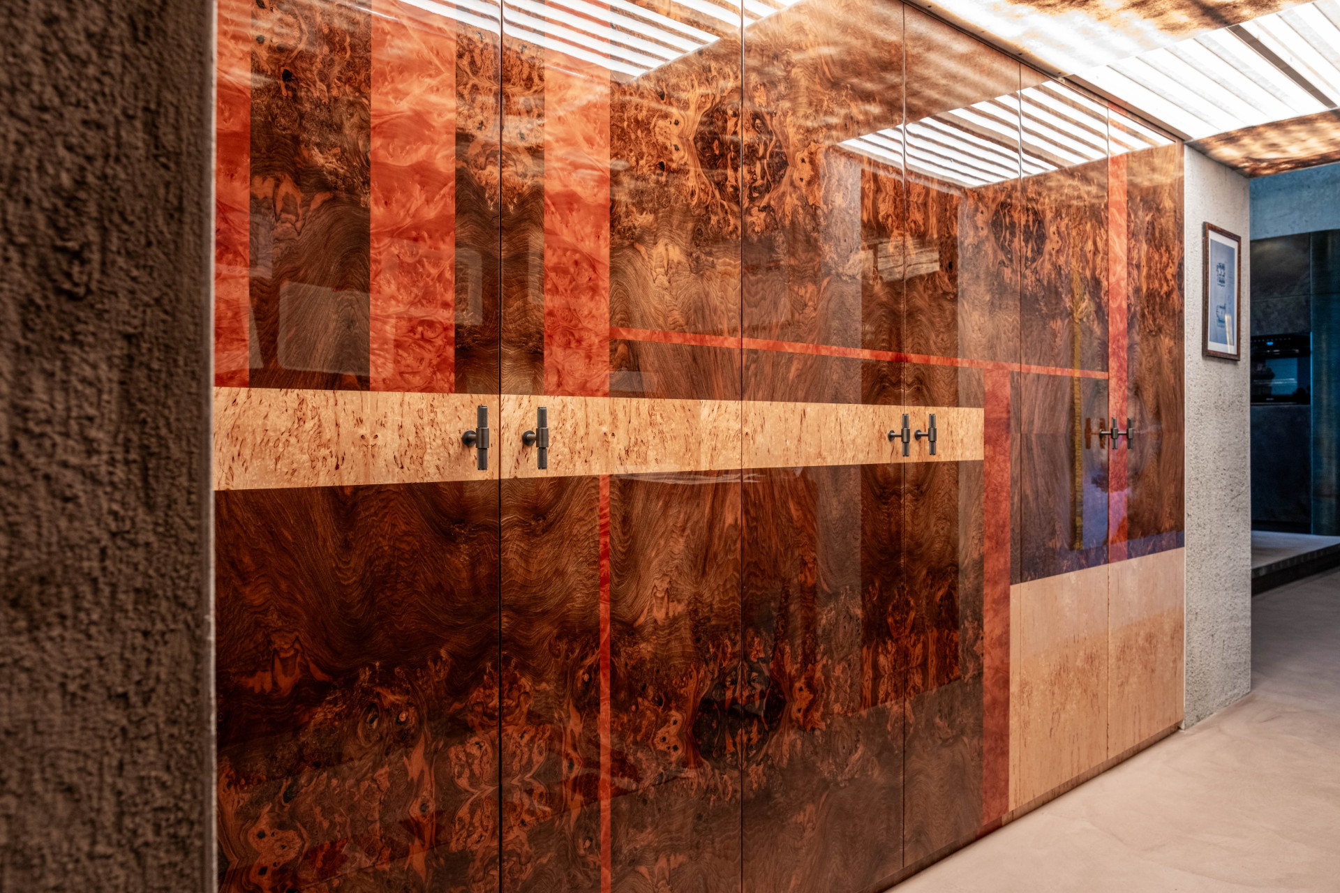 Byt od SKULL Studio je postavený na výrazných strukturách, kromě výrazných brynýrovaných plechů je mají i nahrubo ponechané zdi, podlahy z betonových stěrek a třeba taky šatní skříň. Má oboustranně dýhované dveře lakované do vysokého lesku, uvnitř se pak nachází semiš, kterým jsou pokryty police. Loft od SKULL Studio pracuje se surovou estetikou, jemné momenty se v něm ale najdou taky, vše se tak vyvažuje.