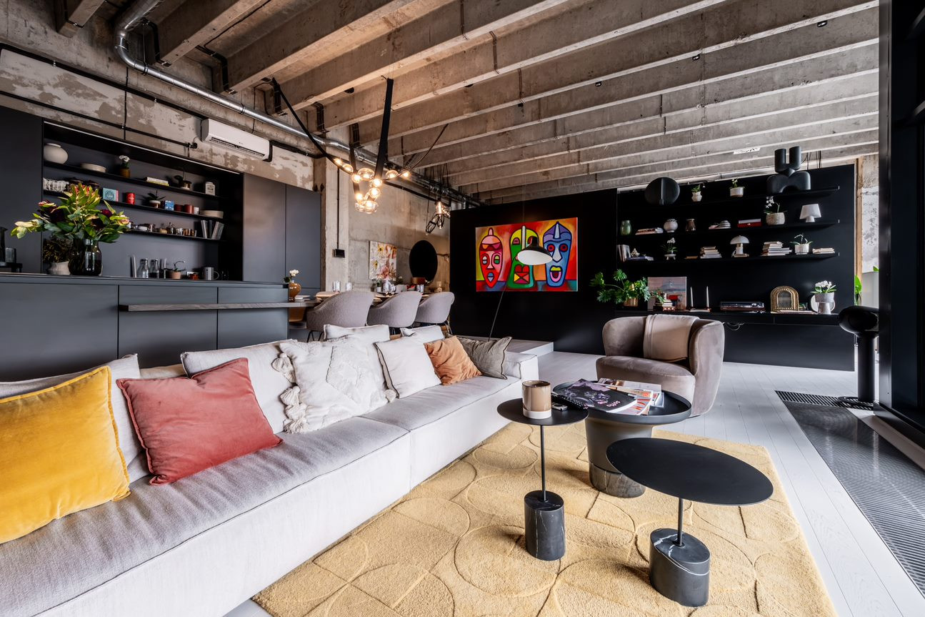 Lofty v bývalé tovární budově pracují s industriální estetikou. Jsou vybavené nábytkem na míru a nechávají vyniknout železobeton