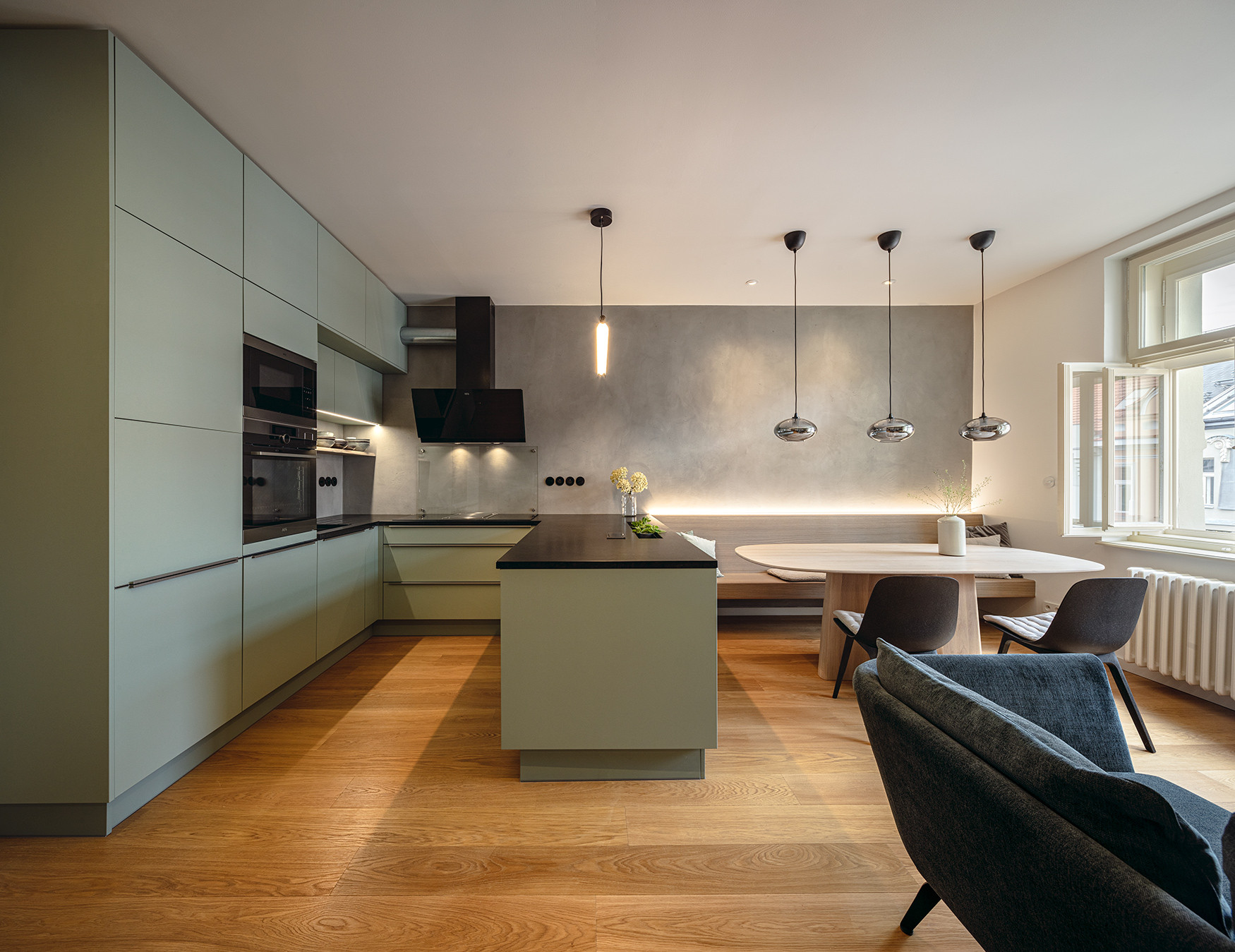Světlý obývací prostor oživuje kuchyňský segment pojatý ve světle zelené barvě. Na kuchyň pak navazuje jídelní část, kde najdeme lavici s LED podsvícením i zakulacený jídelní stůl. Na druhé straně obývacího prostoru se pak nachází velká černá knihovna z probarvených MDF desek rozprostírající se přes celou stěnu.