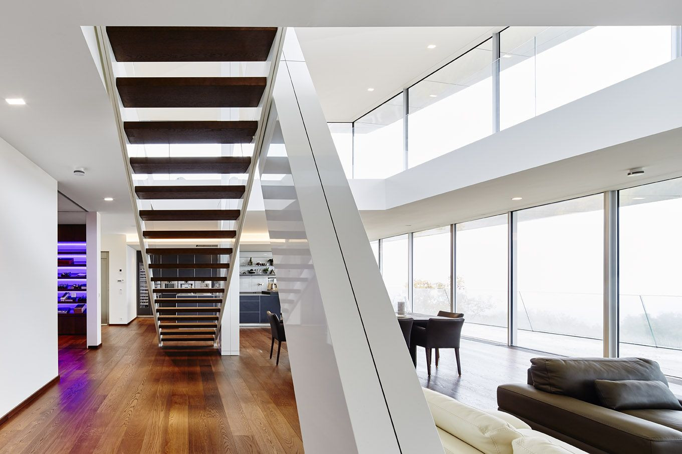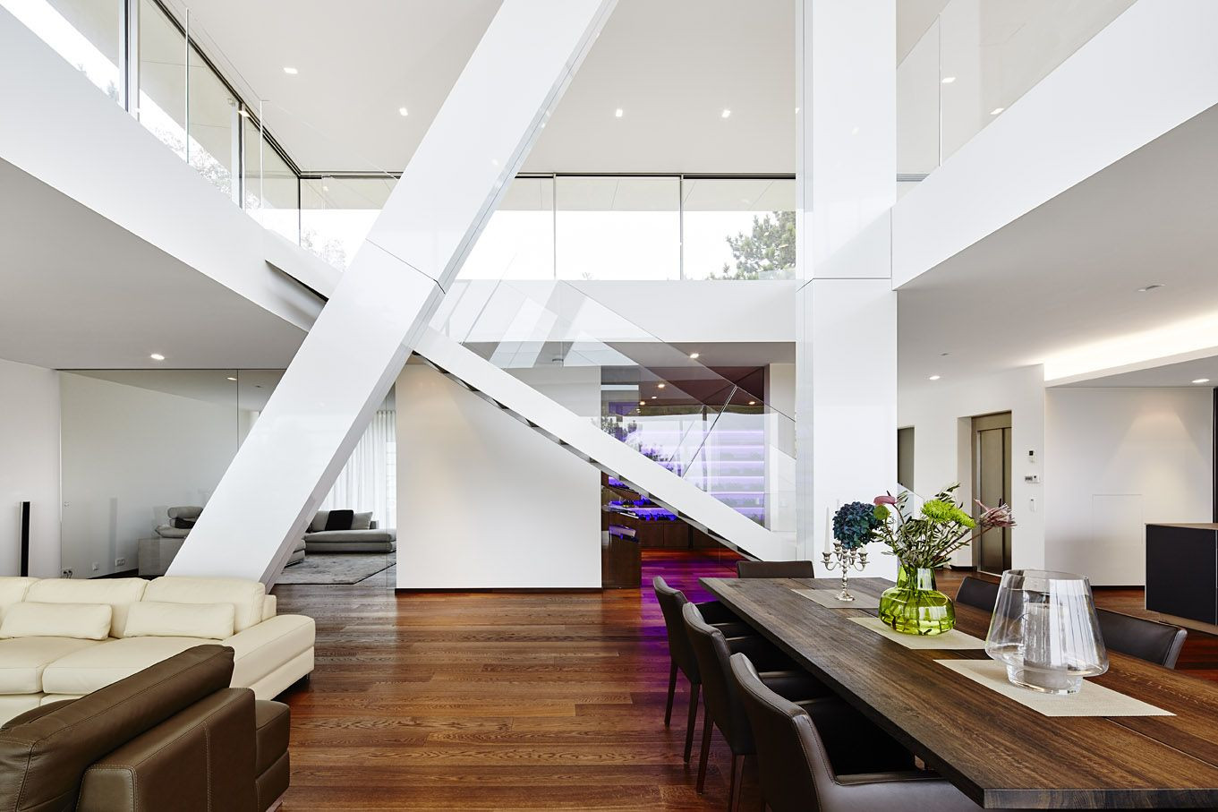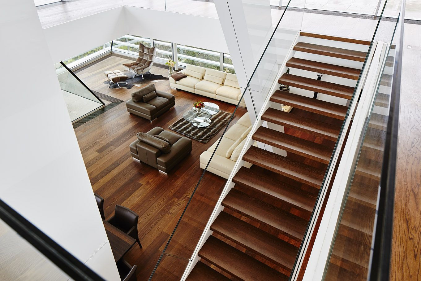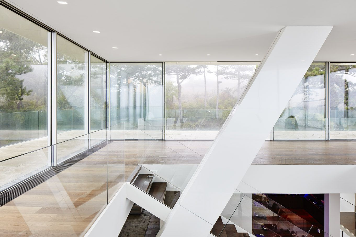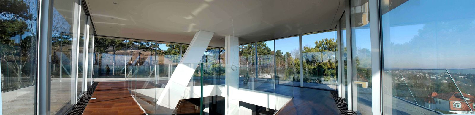 Na vrchol budovy byl přidán samostatný prvek, obývací patro, z něhož se tak stává „dům v domě“. Bílá fasáda z desek Alucobond podtrhuje vzdušný, lehký dojem. Prostory interiéru jsou rozměrné a světlé, samostatné těleso schodiště potom vede k prosklenému pavilonu na úplném vrcholku domu. Prostory plynule přechází jeden v druhý, svažující se sloupoví podtrhuje charakter modernizovaného loftu. Vila ve svahu tak nechává dědictví ze 60. let za sebou a s patřičným uživatelským sebevědomím kráčí vstříc 21. století.