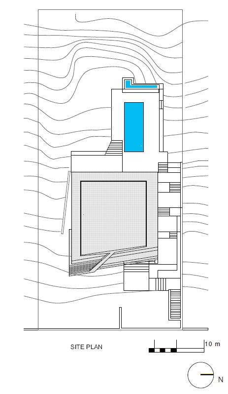 Vila je orientována východo-západně a stojí na poměrně úzké a příkré parcele, přístupné dvěma silnicemi. Hlavní vchod na nižší úrovni byl ponechán, prostory soklu budovy jsou soukromějšího rázu a lépe chráněné. Ložnice, koupelny a wellness se nachází v prvním patře, odkud lze také vstoupit na terasu a k bazénu. Původní vstup do budovy byl z této strany taktéž ponechán.