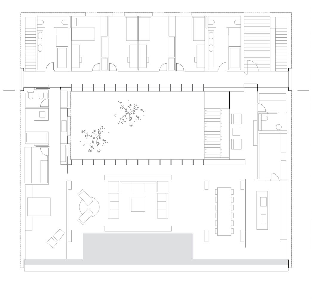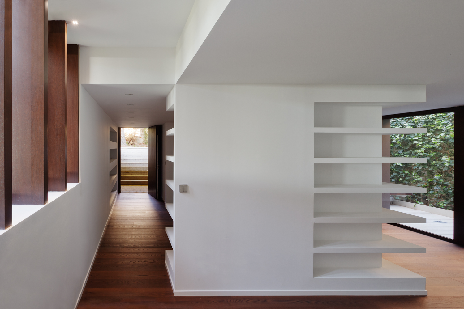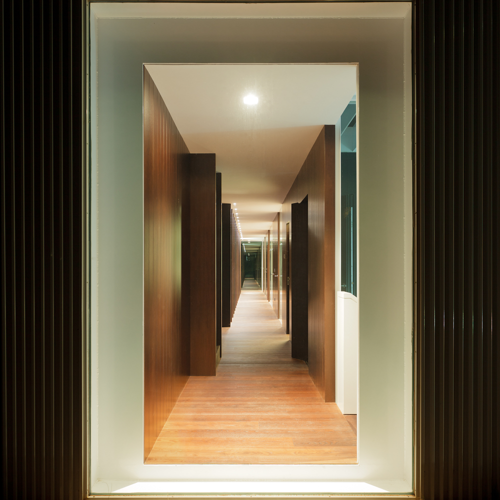 Jak materiály, tak dispozice domu jsou neskrývaným vyjádřením luxusu. Tmavě hnědé dřevo pokrývá podlahy a schody vedoucí do atria, tvoří také okenní rámy a strop nad krytou terasou. Zaujme i prostorná kuchyň z nerezové oceli. Neviditelné posuvné dveře nechávají prostor volně plynout a umožňují uživatelům projít celým domem kolem dokola.