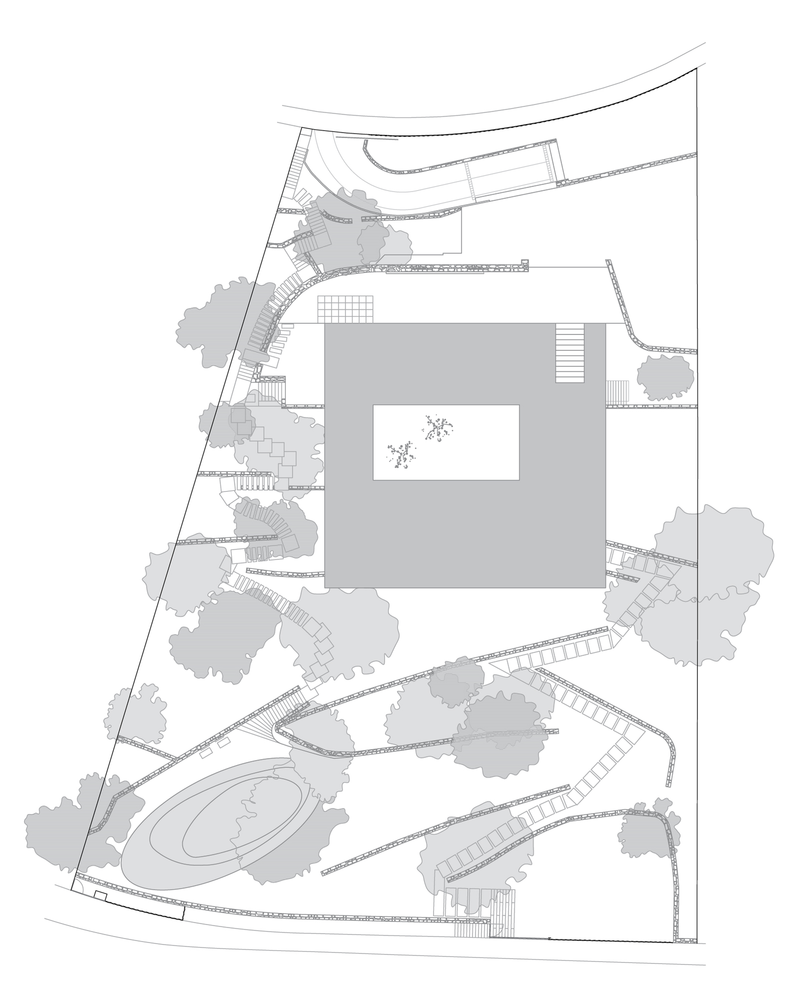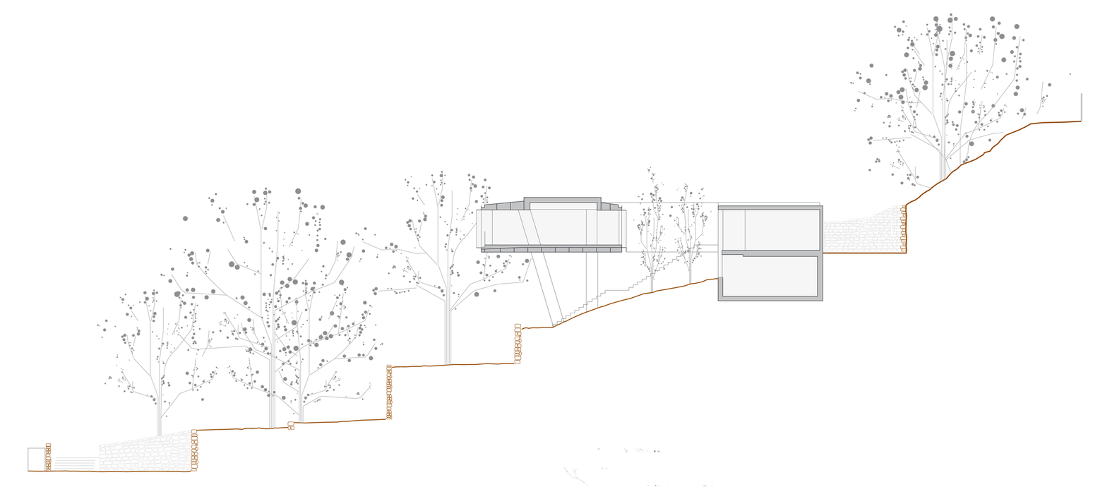 Pozemek ve svahu je dělený na několik teras, přičemž ho zpevňují kořeny borovic a rohovníků. Právě specifická povaha místa vedla architekty k rozhodnutí nezasahovat do terénu a nekácet stromy. Namísto toho využívají prefabrikovanou konstrukci, která levituje nad svahem. Provozní části a garáž jsou skryté a s domem propojené v podzemí.
