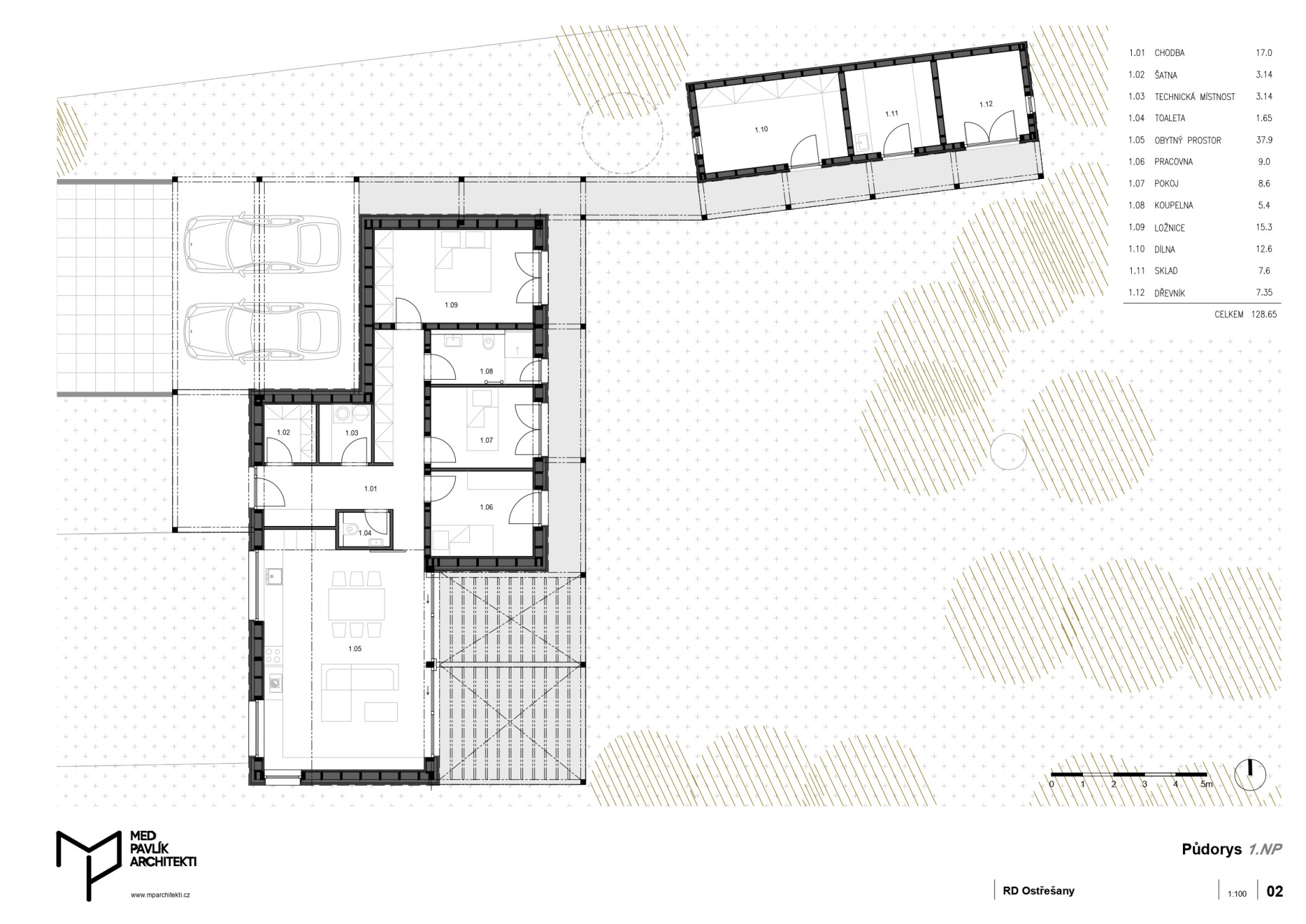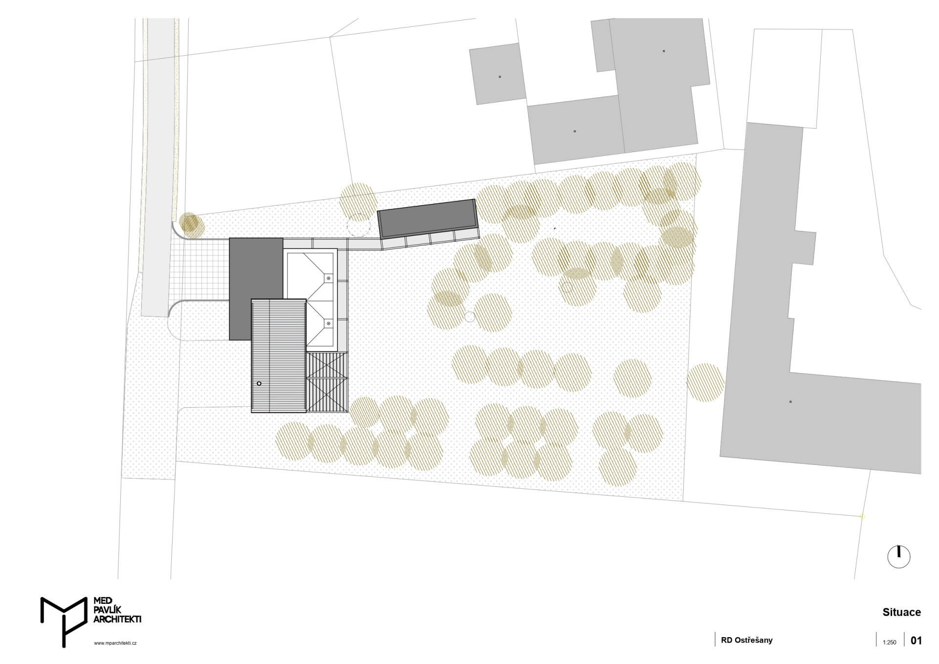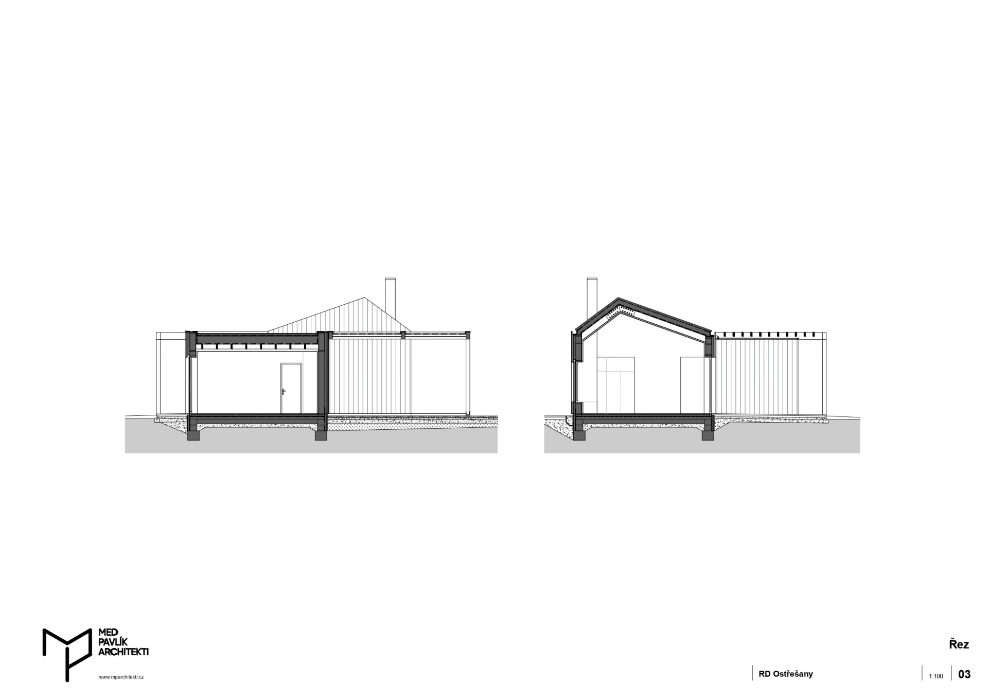 Rodinný dům obci Ostřešany blízko Pardubic definuje především dřevo – a to jak navenek, tak zevnitř. „S ohledem na minimální uhlíkovou stopu je dům navržen jako dřevostavba v systému two-by-four s dřevovláknitou tepelnou izolací,“ objasňuje studio Med Pavlík architekti konstrukční řešení domu. V exteriéru je pak dům opláštěn dřevěnými laťkami, které ve stejném rastru přechází i na sedlovou střechu.