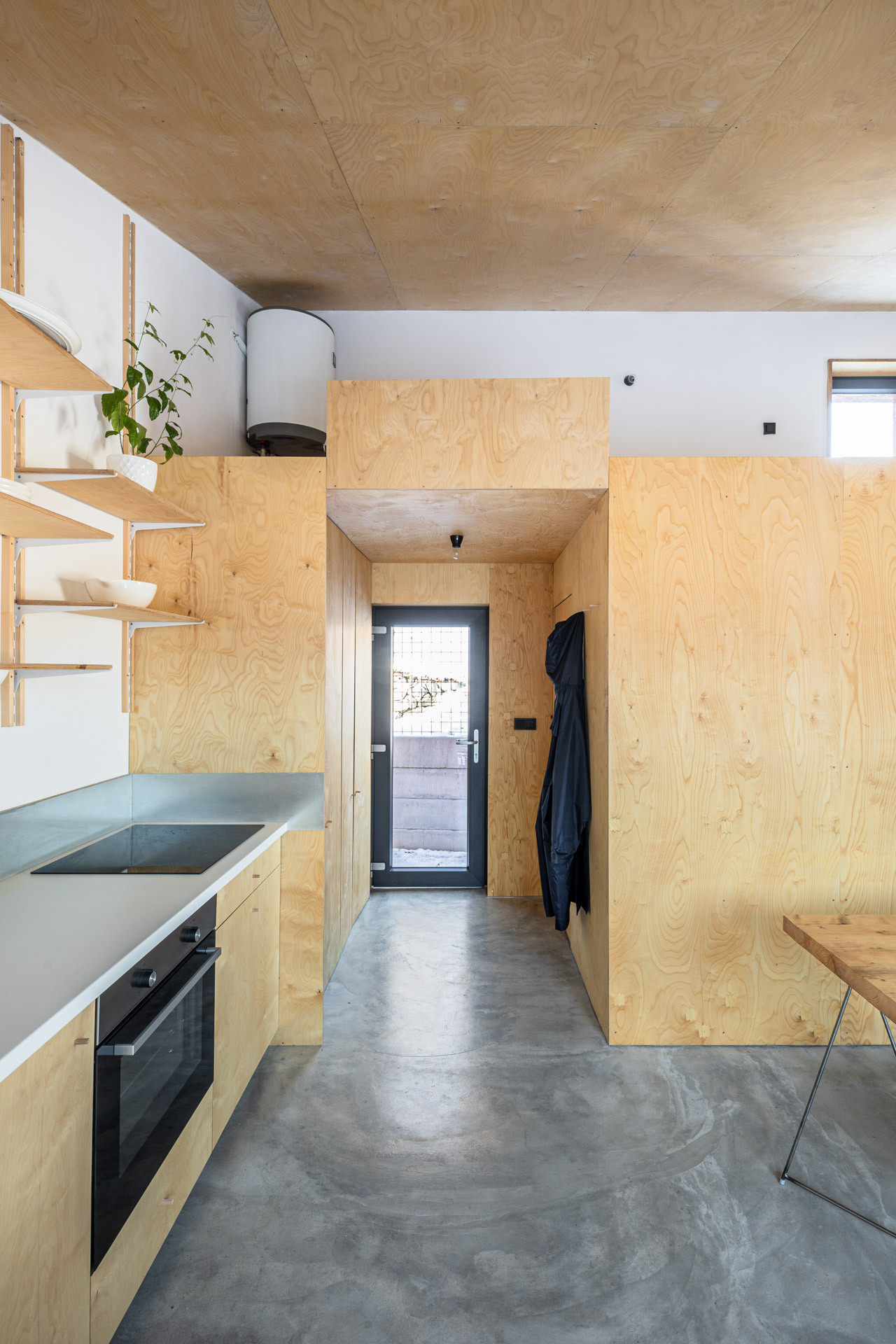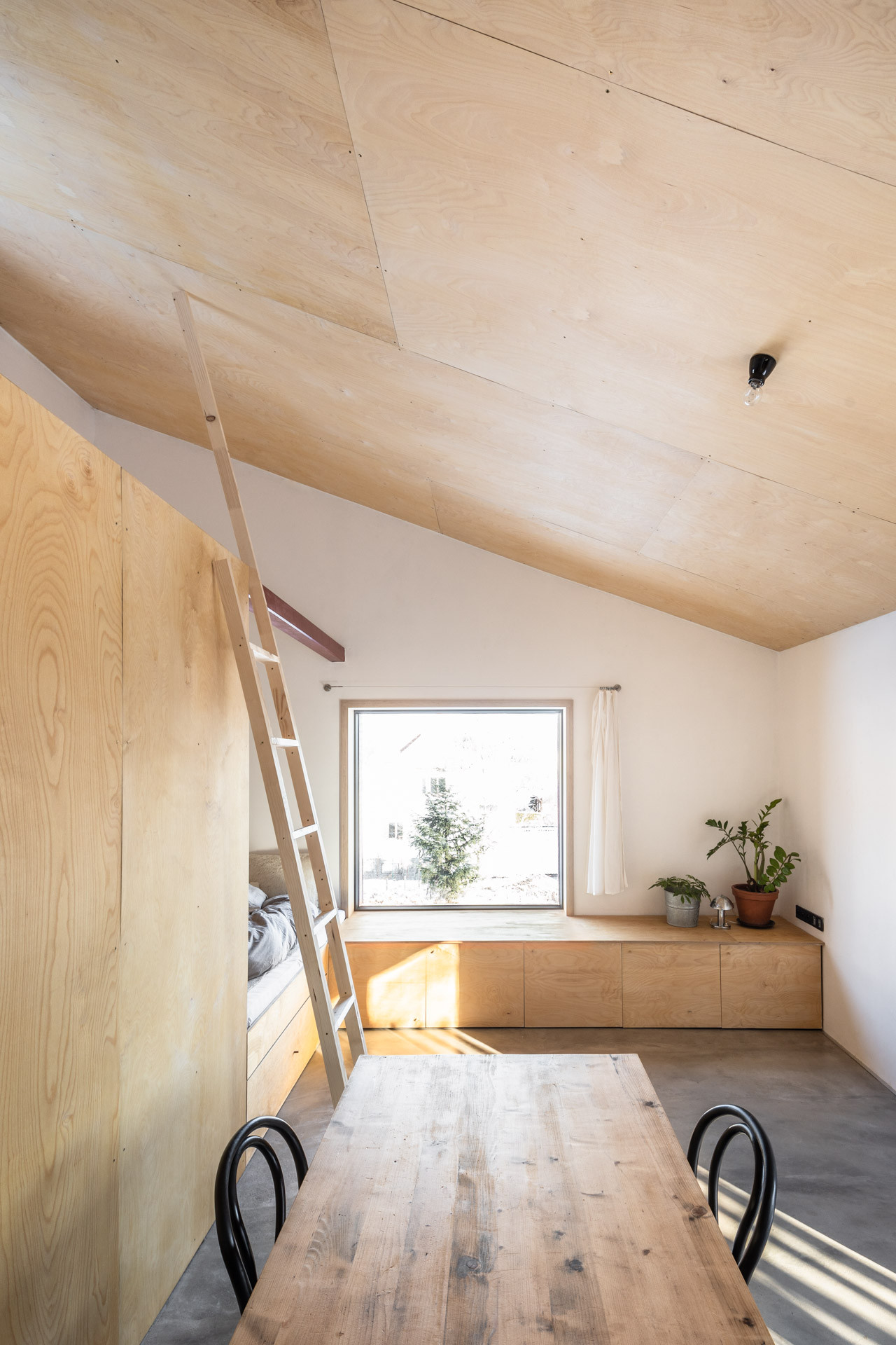 „Byť to na první pohled nejspíš není patrné, dům byl postaven v podstatě z toho nejlevnějšího, co bylo k dispozici,“ říkají architekti. Vedle nehoblovaných střešních latí pro fasádu to jsou třeba plastová okna, betonové podlahy, povrchy v koupelně jsou pokryté průmyslovou gumou, ostatní stěny jednoduše omítnuty nebo pobity překližkou druhé jakosti. Nábytek je sice navržený na míru, ale také nízkonákladový. „Vnitřní korpusy úložných prostorů jsou z nábytkového lamina, pouze dvířka tvoří stavební překližka. V případě kuchyně se jedná o typizované korpusy s překližkovými dvířky, pracovní desku tvoří bílé lamino, konzoly na nábytkové police pochází z hobbymarketu, a tak dále,“ dodávají.