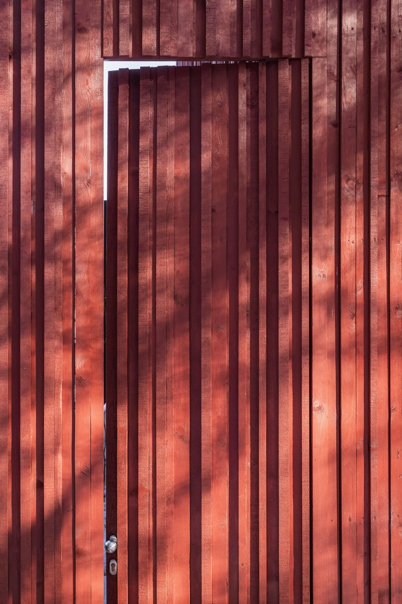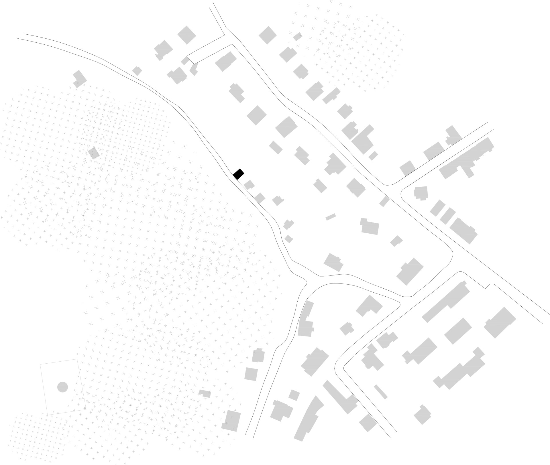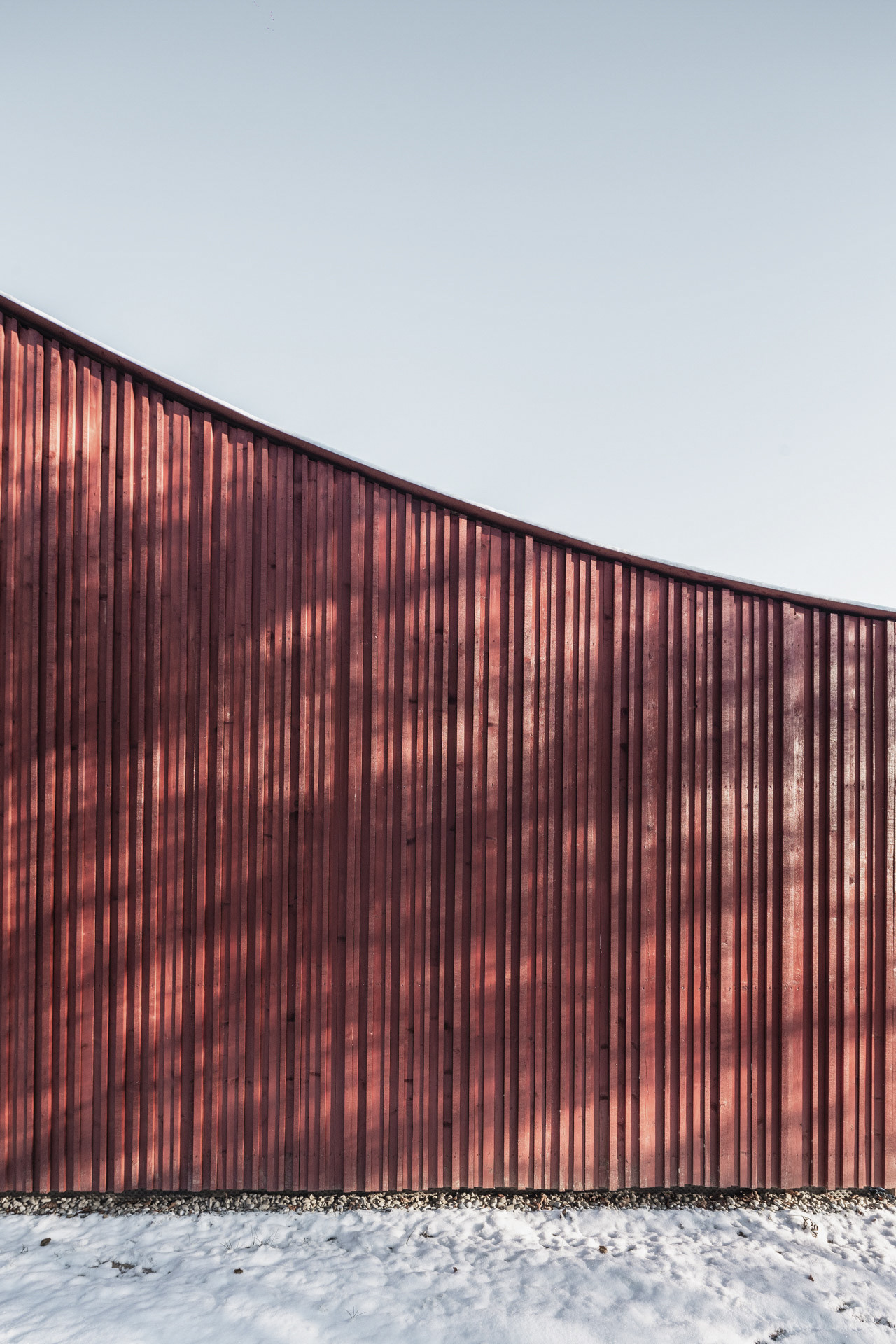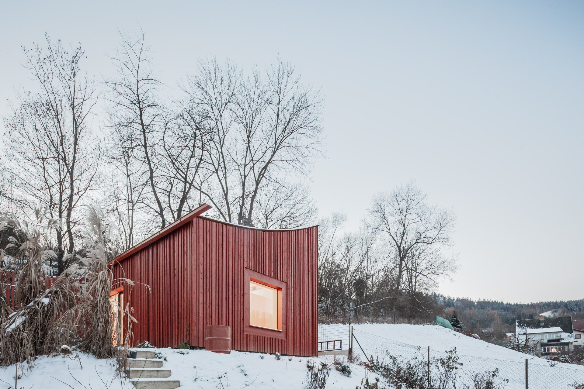 Malý rekreační domek na úpatí kopce Svatobor je působivý už svou siluetou. Směrem dolů ze svahu ji modeluje prohnutá střecha, která navazuje na úroveň sousední chatové zástavby. Do ulice se zase obrací štítovou stěnou postupně se přelévající do standardně vysokého plotu. „Chata si pečlivě chrání své soukromí a zároveň nabízí výhledy směrem do zahrady, na město i nedalekou Šumavu,“ říkají architekti. Celá hmota chaty je obložená nehoblovanými střešními latěmi, které se od sebe v místě plotu postupně oddalují – clona se tak stává polopropustnou a připomíná klasické laťkové ploty.