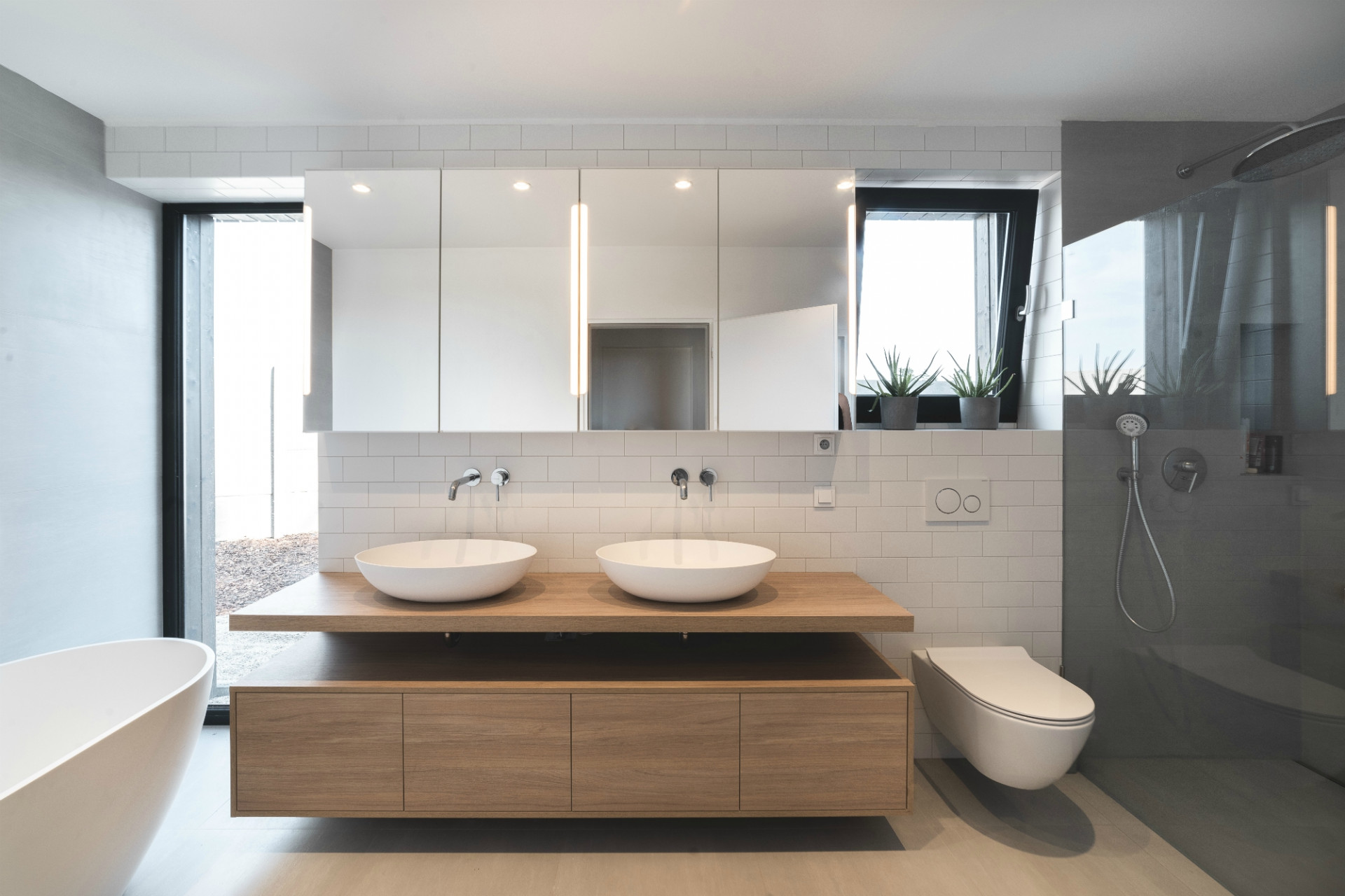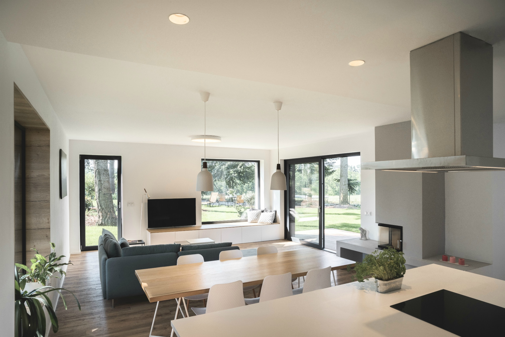 Obklopen přírodou stojí v obci Dolní Břežany nedaleko Prahy rodinný dům nazvaný příznačně Mezi stromy, který navrhl ateliér Mio architects. Jednopodlažní stavba se skládá ze dvou na sebe kolmých křídel, která oddělují obytné prostory od ložnice a dětských pokojů. Architekti se snažili o to, aby stavba zapadla do svého prostředí a tak pro dům navrhli obložení fasády z tmavého dřeva. Velká okna nabízí výhledy do krajiny, do zahrady pak lze vstoupit z každé místnosti prostorově úsporného domu.