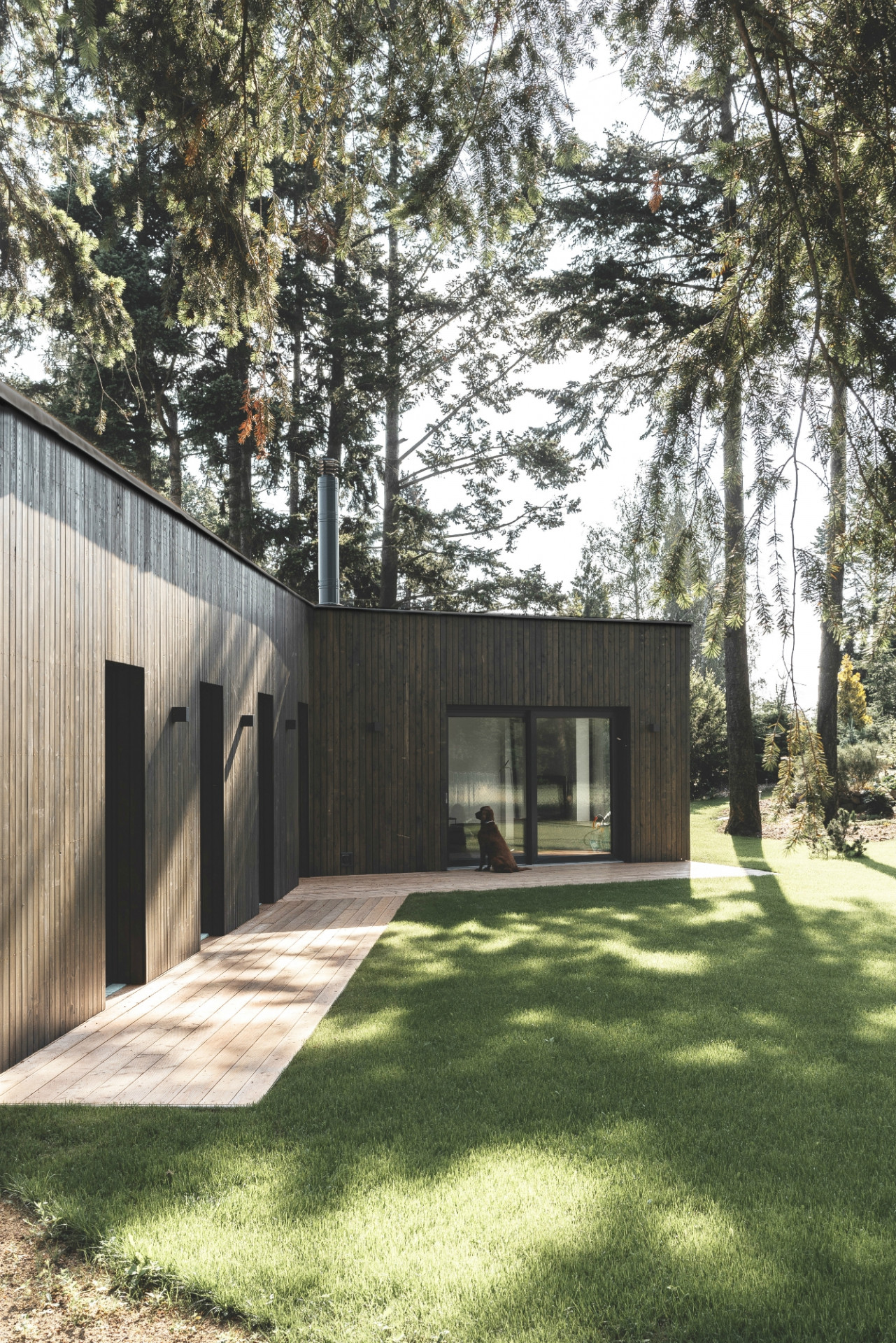 Malý přízemní dům od studia Mio architects se ukrývá mezi vzrostlými jehličnatými stromy