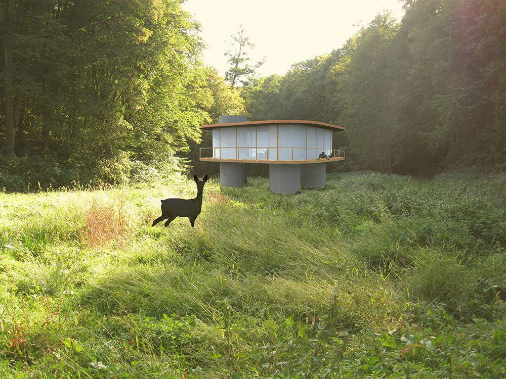 Lokalita se nachází na louce uprostřed lesa nedaleko obce Soběšice, kousek od Brna. Sklo je transparentní, snaží se souznít s přírodou tak, že do ní nezasahuje. Sklo se snaží být nepovšimnutelné, neviditelné. Dům se sestává ze tří dutých železobetonových sloupů, ve kterých se nachází soukromé prostory objektu, a které zároveň nesou zbytek konstrukce - stropní a podlahovou desku, mezi kterými se ve propojeném prostoru nacházejí části společenské. Dům je určen pro extroverta, soukromé prostory jsou tedy minimální, slouží pouze ke spaní ( ve dvou sloupech se nachází postele zabírající celou plochu podlahy) a jako hygienické zázemí (v posledním sloupu se nachází toaleta s koupelnou). Člen této rodiny touží po společnosti, věškerou většinu času tráví v místnosti společenské, jenž plní více funkcí prostřednictvím různých koutů- pracovních, jídelního, obývacího, hracího. Dům navržen pro pár s jedním dítětem. Různé výšky sloupů umožňují různý stupeň osvětlení dle nároku konkrétního prostoru. Objekt je vyzdvižen nad úroveň země- podlaha se nachází v úrovni tří metrů, tak aby provoz v domě nenarušoval provoz v lese. Vchod do objektu je přes zadní schodiště. Jako návratnost lesu za zabraný prostor lze v zastřešeném prostoru pod budovou vybudovat krmelec.