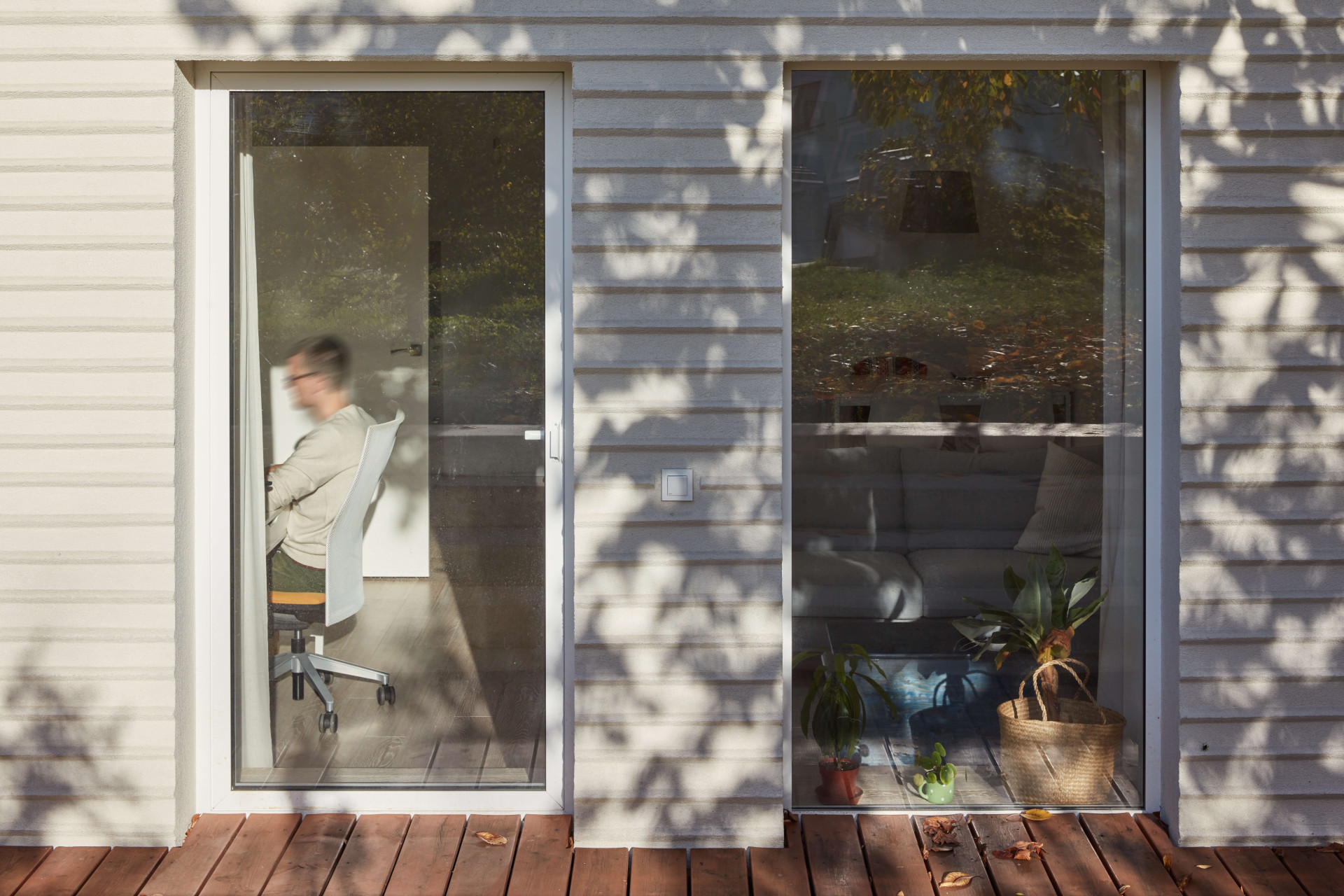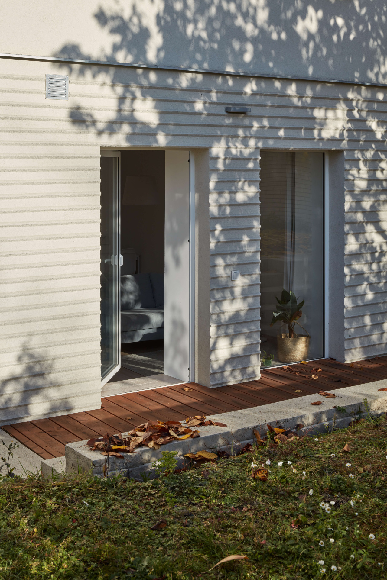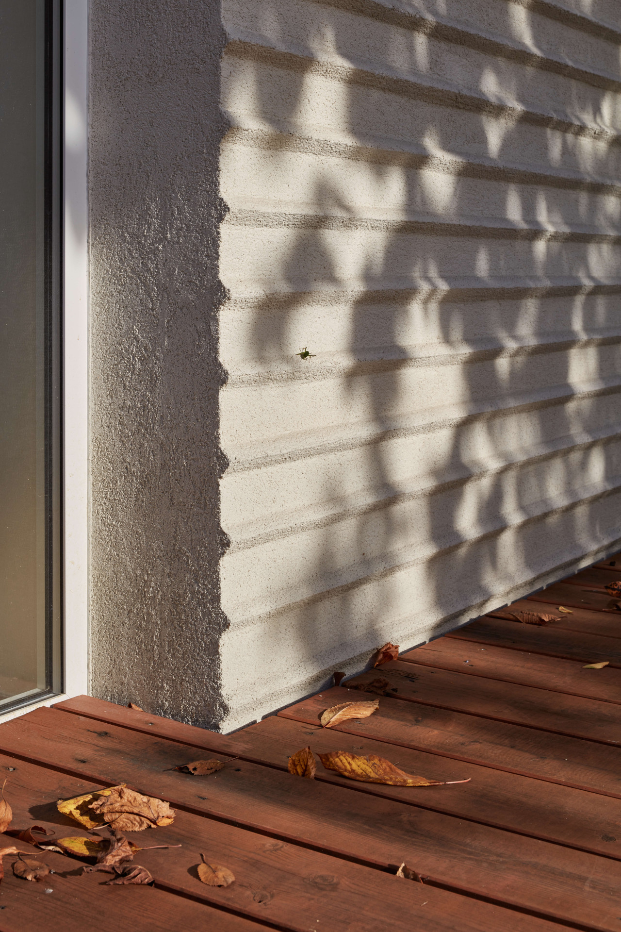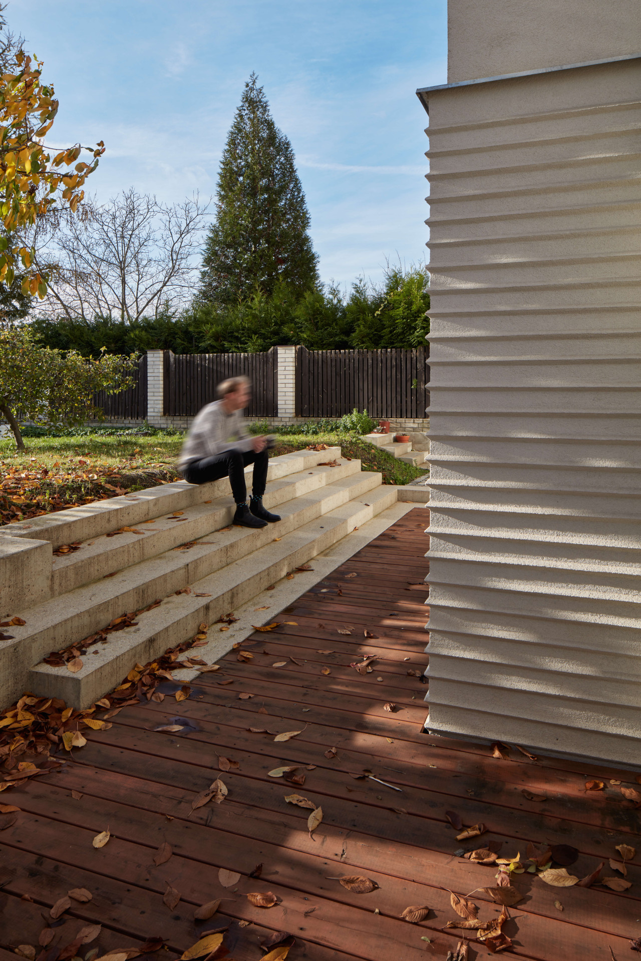 Vedle návrhu terasy se architektovi podařilo docílit také decentního řešení nově zateplené fasády, která díky jemnému profilování v úrovni soklu získala na plasticitě a pozvedává tak celkové působení domu.
