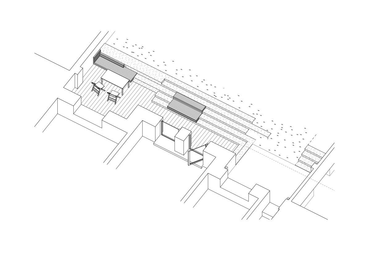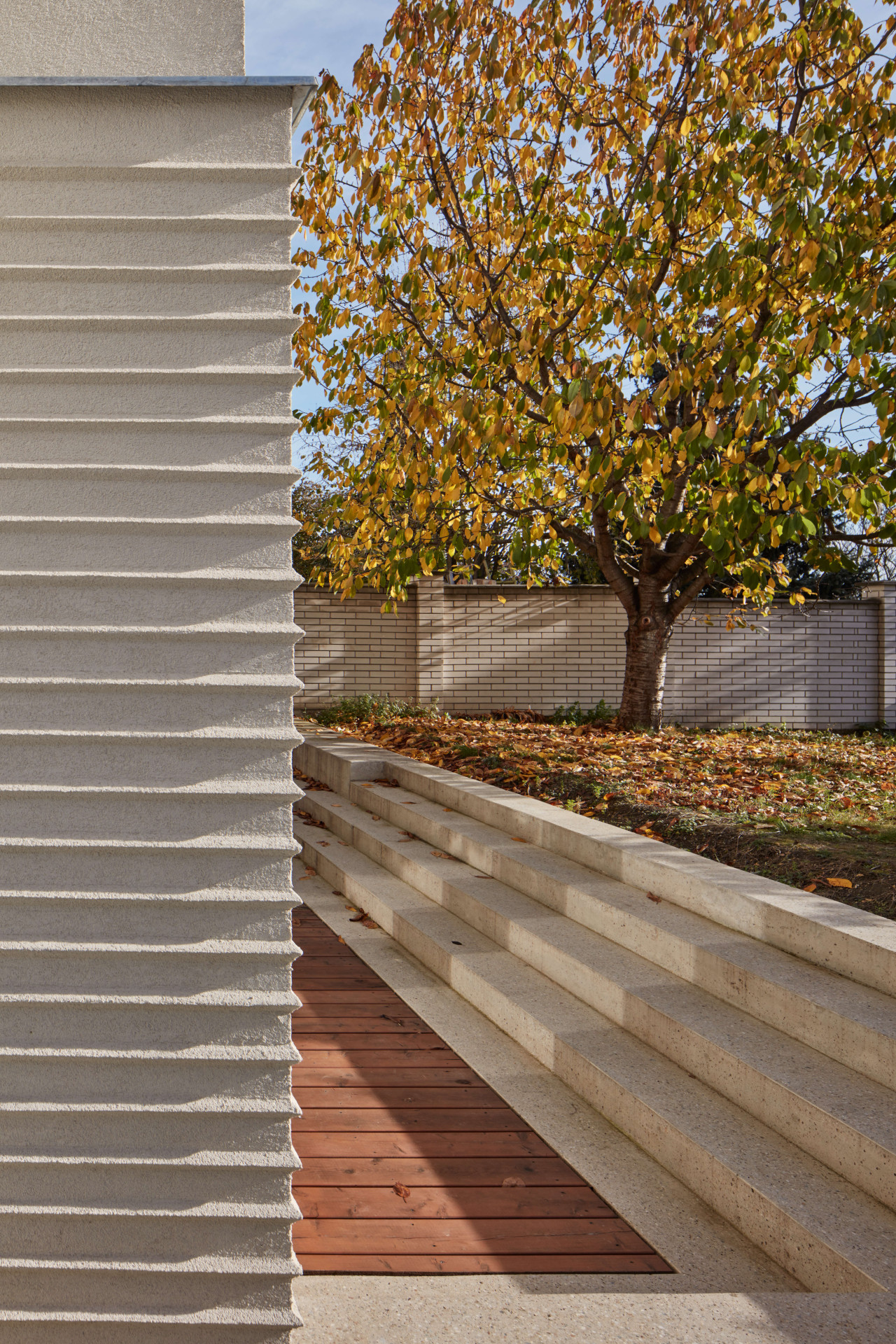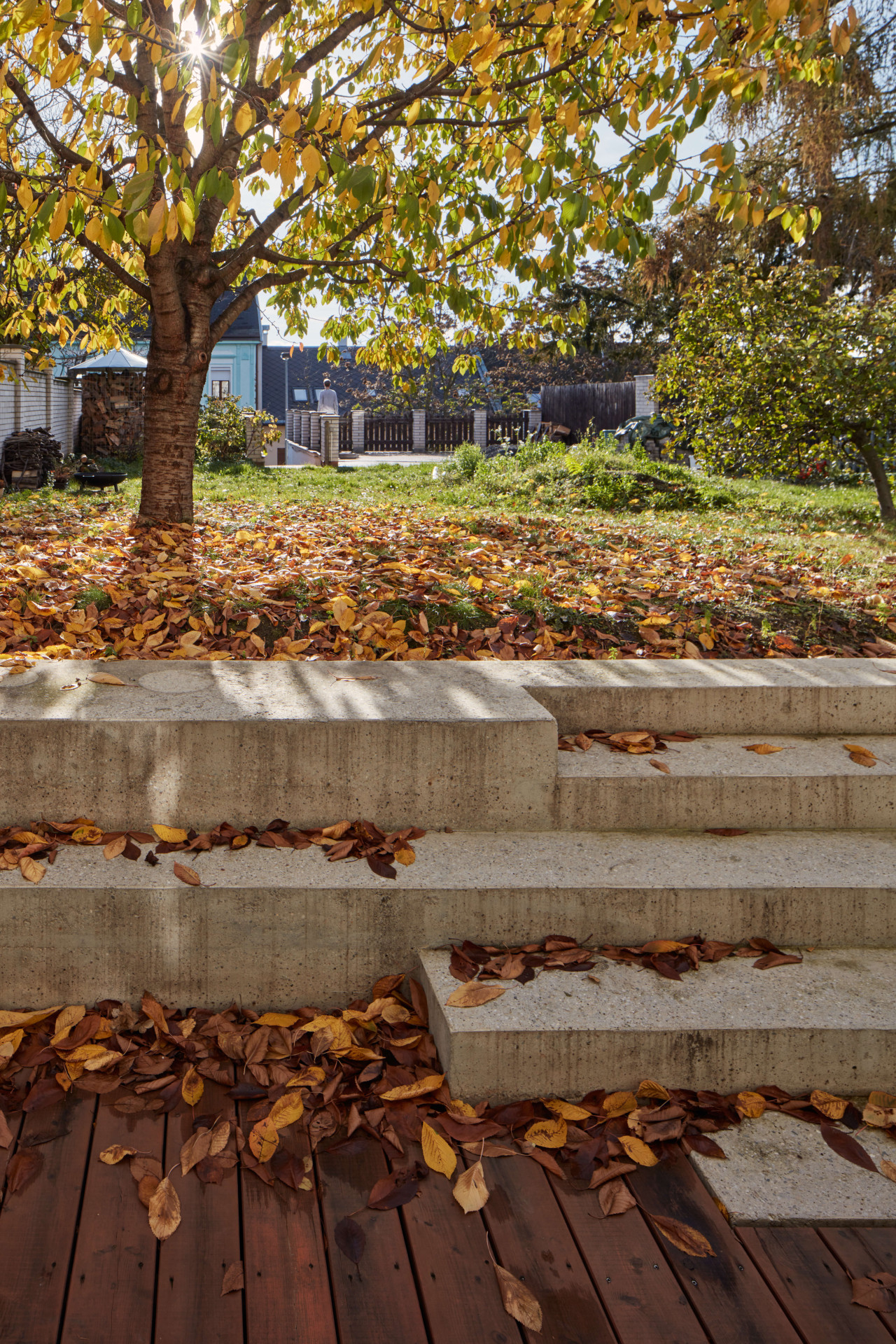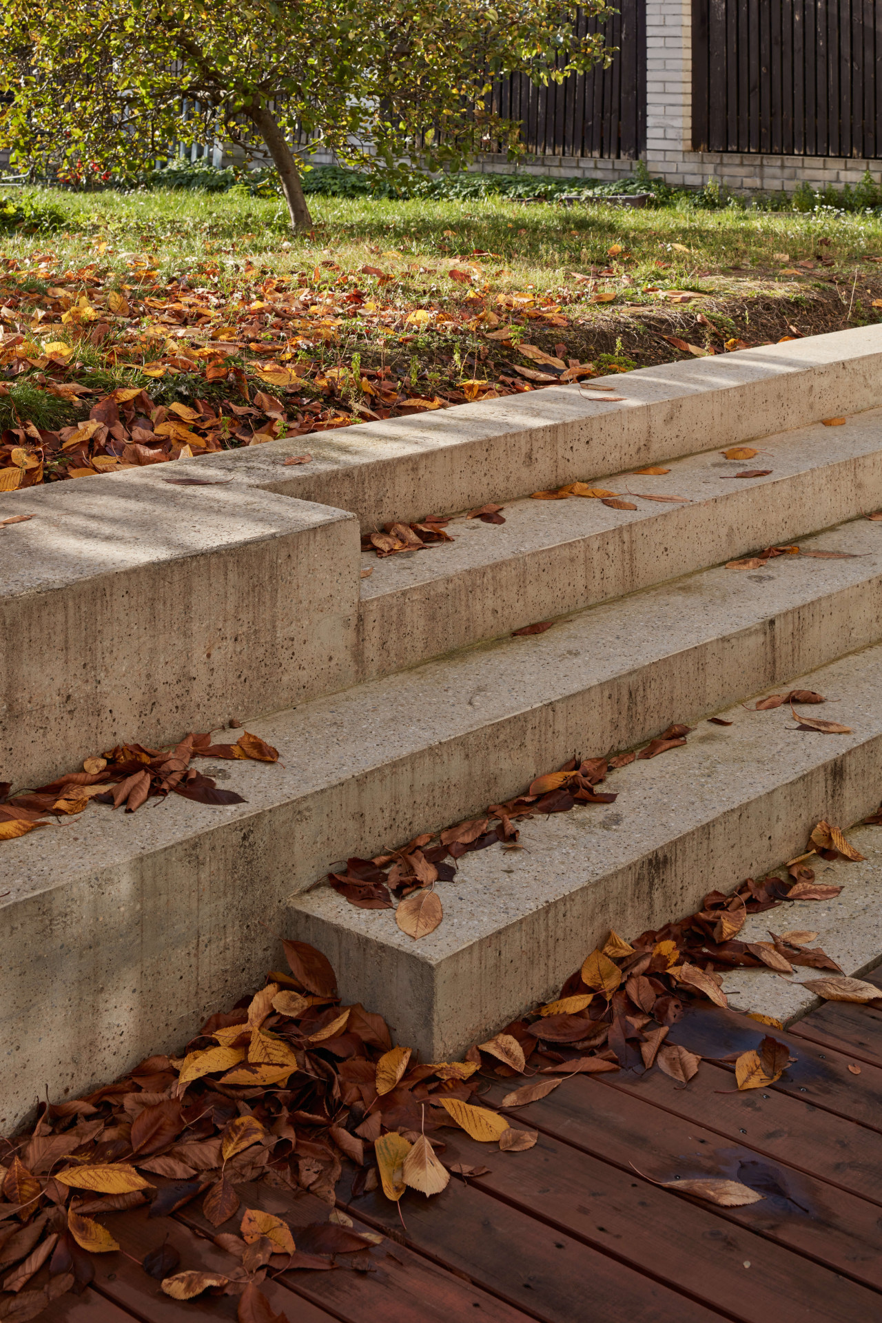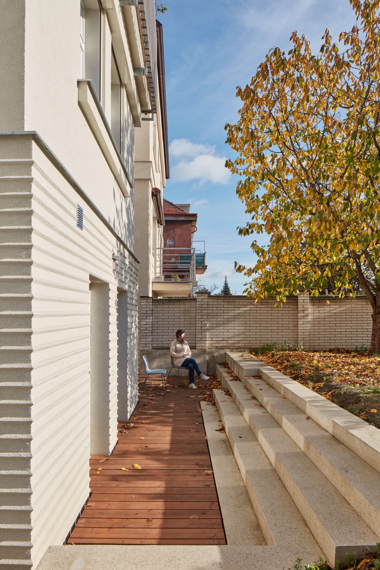 „Stávající mělký anglický dvorek jsme vytěžili a mírně rozšířili tak, aby nabídl přiměřenou venkovní terasu pro dvoupokojový byt. Původní okna s parapetem nahradilo prosklení umožňující přímý vstup na terasu. Ta je vymezená solidními opěrnými schody z broušeného betonu. Masivní stupně se stávají svébytným rozhraním mezi terasou a zahradou. Vybízí k obývání,“ říká autor návrhu.