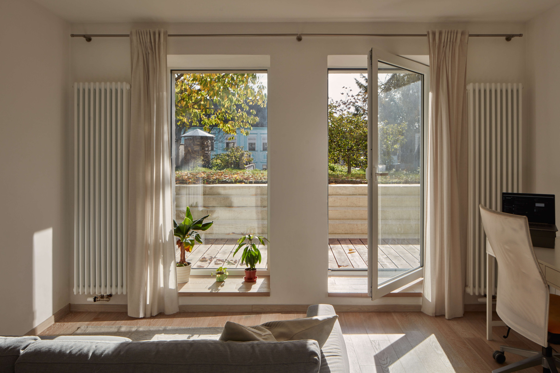 Řešení našel architekt v podobě přímého propojení dispozice bytu se zeleným dvorkem pomocí prosklených dveří vedoucích z obýváku na novou dřevěnou terasu s opěrnými schody, které lze pohodlně využívat k sezení.