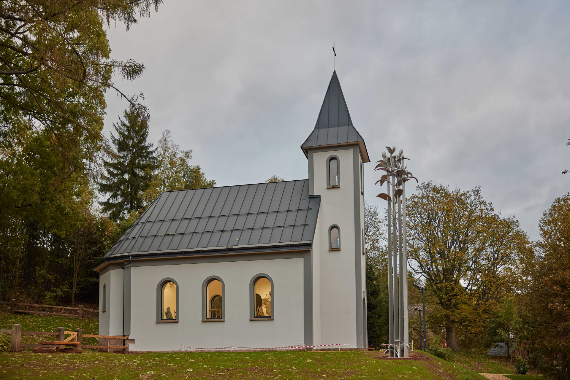 Nejvýraznějším novým prvkem se stal kůr umístěný nad vstupem do lodi kostela. Architekti ho navrhli z oceli a skla a zpřístupnili po vykonzolovaných schodech. Nová struktura tak v interiéru působí velmi nenápadně a nechává za sebou vyniknout průhledy do věže jejíž vnitřní zdivo je nově odhaleno a zakonzervováno. Byla to právě věž, ve které se během rekonstrukce objevilo překvapení. „V původní schránce ve tvaru koule pod křížem na věži byla při stavbě nalezena zaletovaná nádoba z doby vzniku kaple. Uvnitř byl vzkaz starosty Josefa Kaspera (neuvěřitelná náhoda shodného jména bez příbuzenského vztahu k rodině investora) pro budoucí generace. Kopie německy psané listiny s českým překladem a novým vzkazem manželů Kasperových do dalších staletí byl uložen v nerezové schránce do nepřístupného místa ve vrcholu krovu věže,“ vypráví architekti.