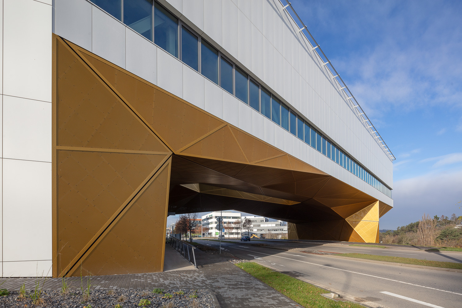 Za komplexním návrhem budovy stojí tým architektů z brněnské kanceláře AiD team a.s. Tvar stavby, připomínající bumerang, vyšel přímo z místní urbanistické situace. „Z urbanistického hlediska jsme cítili potřebu zakončit akademickou část kampusu důstojnou dominantou, která bude tvořit zároveň vstupní bránu do areálu od východu,“ říkají architekti o budově, která z části překlenuje celou ulici. „Objekt v jižní části tvoří kompaktní blok s vnitřním atriem, z něhož vybíhá smělé přemostění ulice Kamenice podepřené subtilní podnoží v severní části pozemku. Nad komunikací je v přemostění zakomponováno druhé atrium, které vylehčuje hmotu a umožňuje zajímavý průhled vnitřkem objektu,“ dodávají. Výtvarný akcent do přemostění vnesly perforované plechy zlaté barvy, které ho obalují a dodávají mu skulpturální vzhled. Fasády jsou pak pojaty racionalisticky, střídají se na nich prosklené části s plnými plochami se sklocementovým obkladem, za kterými se nacházejí specializovaná pracoviště, která vyžadují, aby se do nich nedostávalo denní světlo.