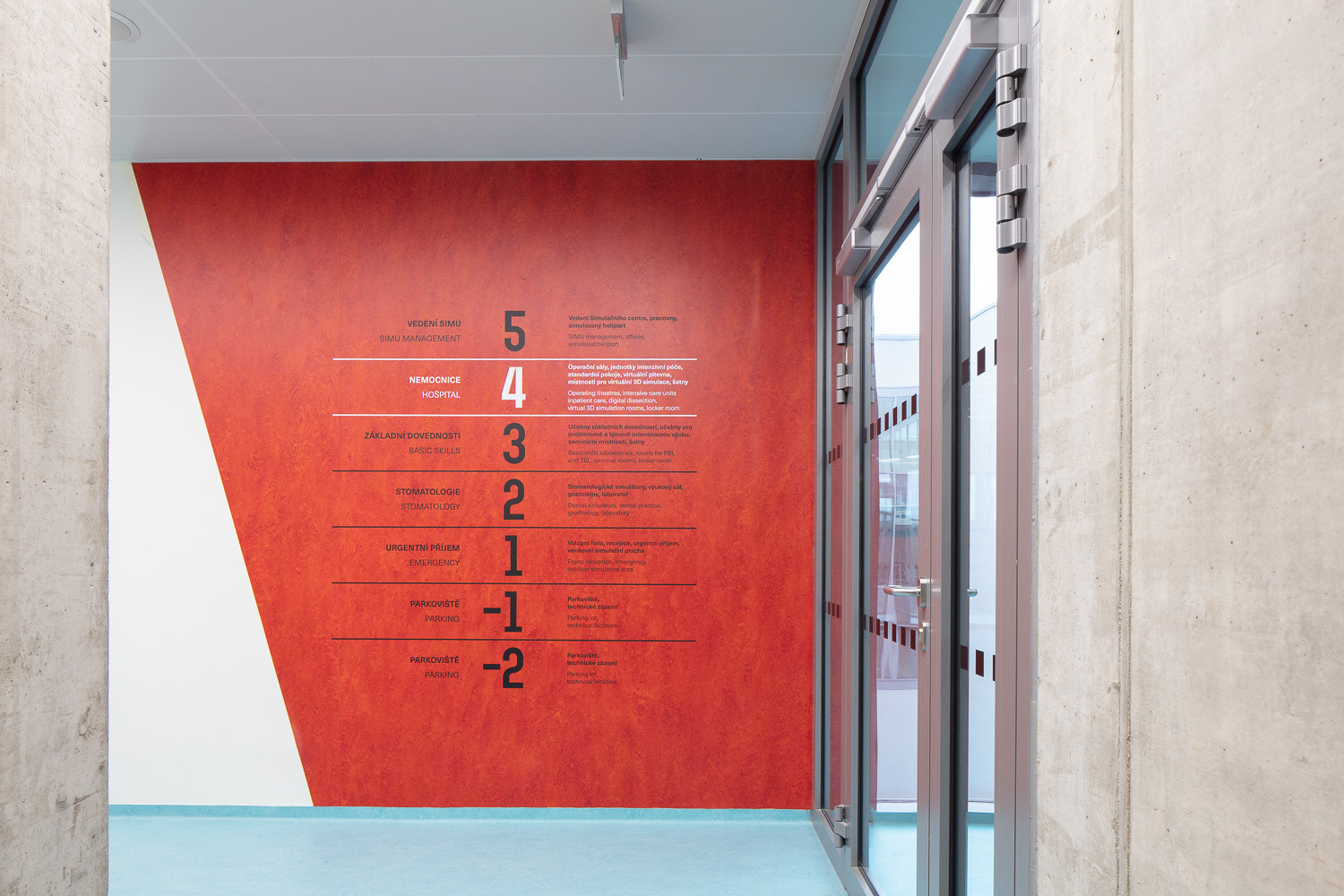 V interiérech SIMU se nachází hned několik barevných variant Marmolea. Ve výukové části bylo použito zlaté Marmoleum z řady Splash od firmy Forbo Flooring Systems, které tak navazuje na barvu perforovaných plechů z exteriéru. Kromě tohoto odstínu se v SIMU uplatnil také světle modrý odstín krytiny Marmoleum Fresco. Prostory určené pro zubní lékařství zase provází žlutá barva podlahy. Barevnost podlah jednotlivých pater koresponduje s orientačním systémem budovy. Na ten navazují stěnové aplikace krytiny Marmoleum, do které byla technologií vodního paprsku aqujet vyřezána čísla pater i jednotlivých místností.
