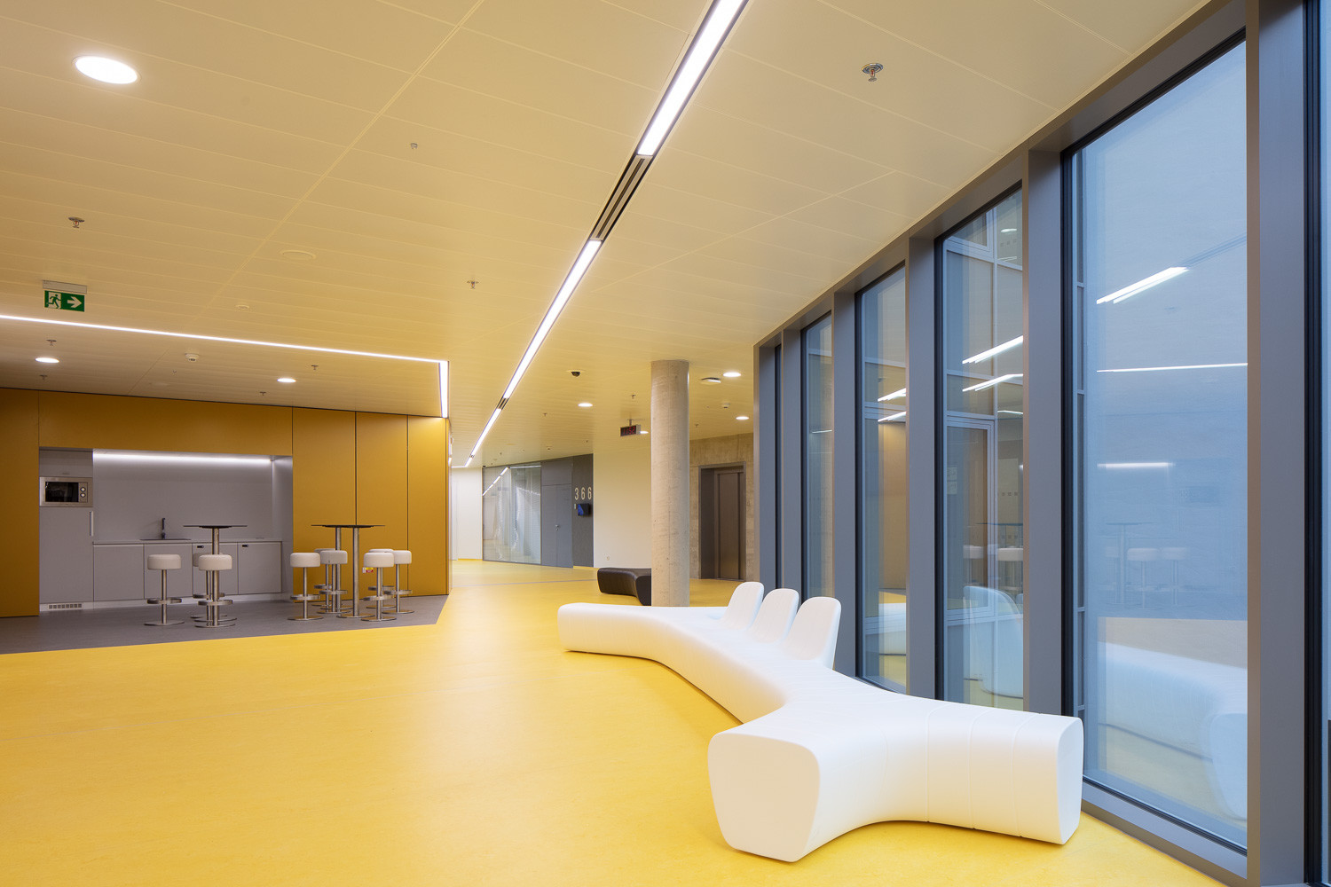 - Podlaha: Forbo Marmoleum v odstínech Splash 3431; Fresco 3251; Fresco 3267; Fresco 3131; Fresco 3137 celkem 8500 m² včetně aplikace na stěnách