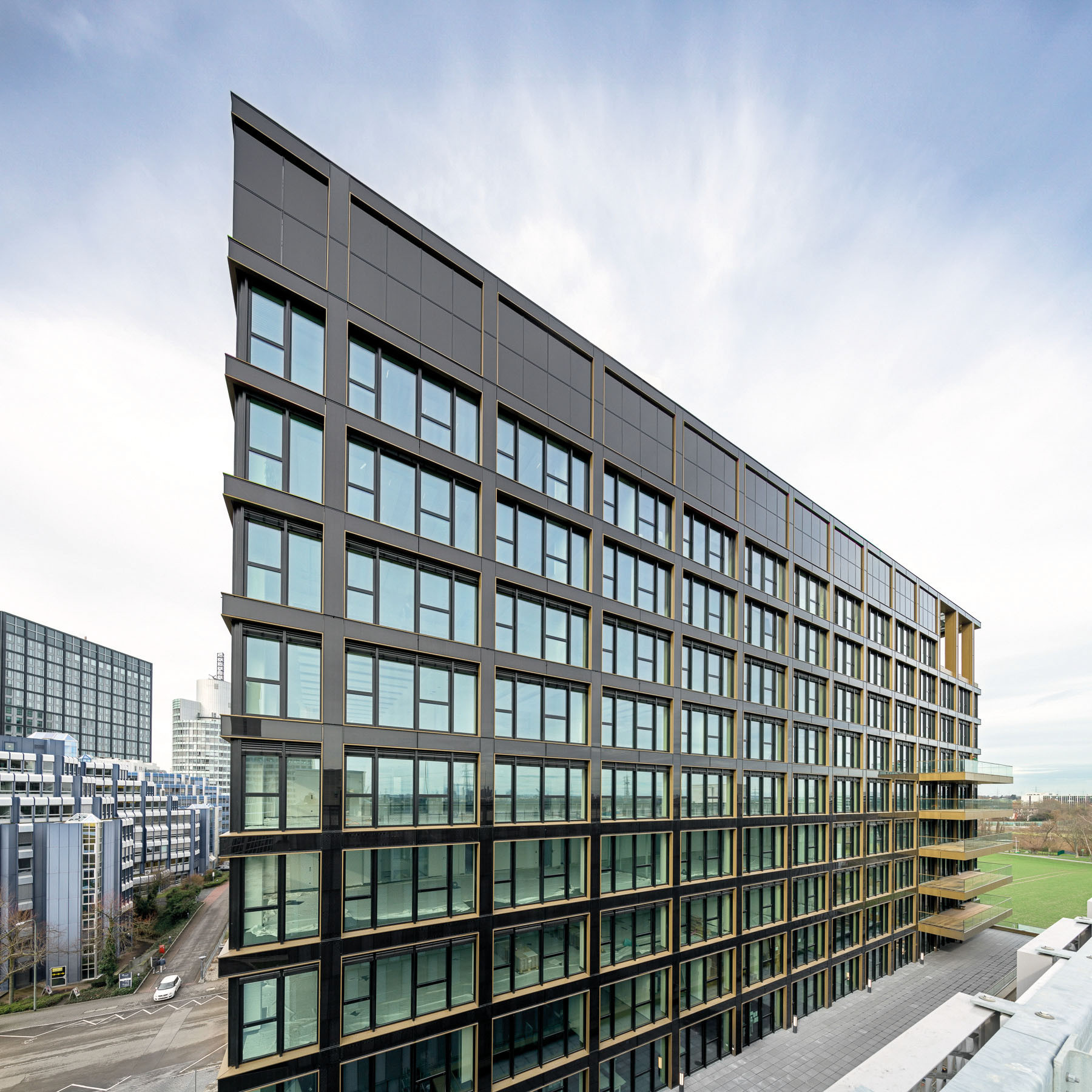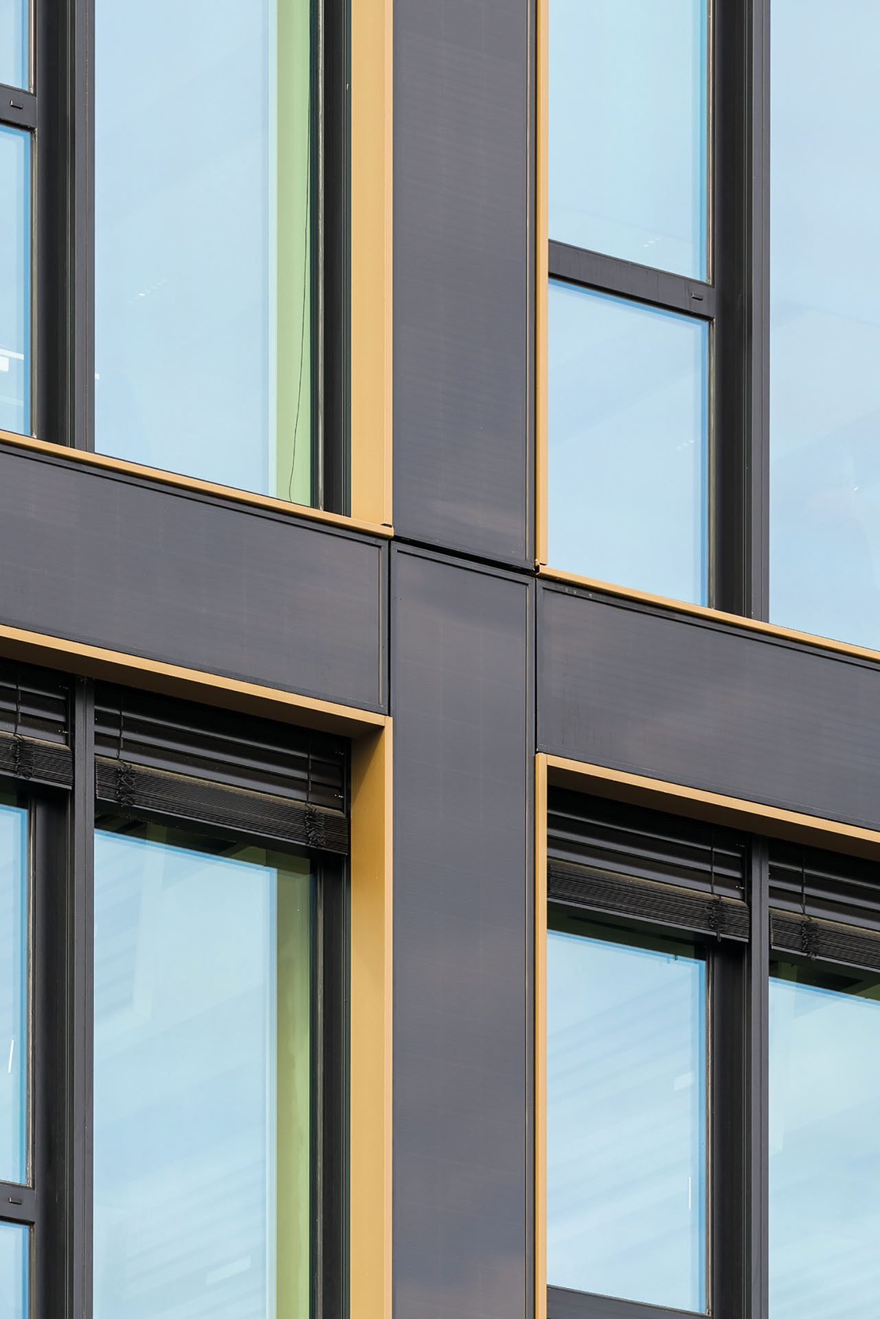 Architekti si pochvalovali podporu ze strany společnosti Schüco při realizaci projektu. „Společnost vystupovala nejen jako dodavatel systému, ale stála při nás i jako partner pro projektovou realizaci fasády,“ rekapituluje Nicolas Schrabeck. „Využili jsme možnosti individuálního nastavení odstínu FV jednotek, abychom fasádu navrhli v monochromatickém, téměř černém odstínu. Bronzově zbarvené profily oken k tomu vytvářejí jemný kontrast.“ Skleněný plášť, který sestává z oken a FV prvků, díky tomu získal příjemný rytmus. Rušivým odrazům, např. slunečního světla, je zabráněno. To jasně ukazuje, že špičkový design a použití BIPV se v žádném případě nevylučují.