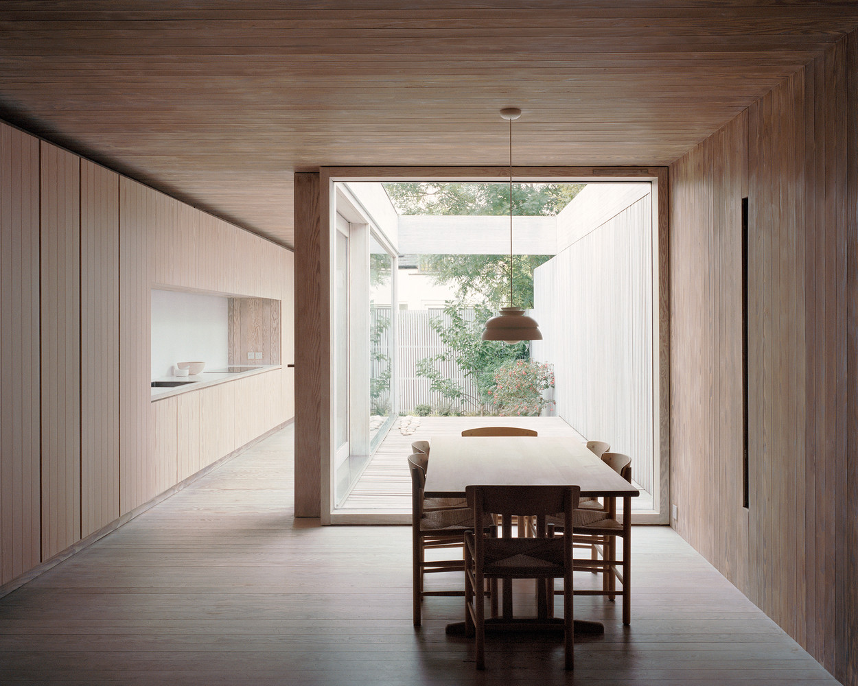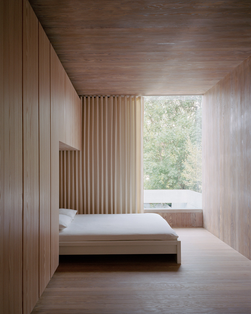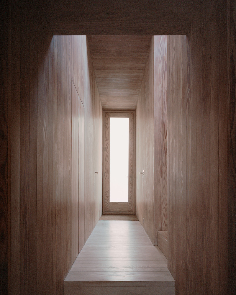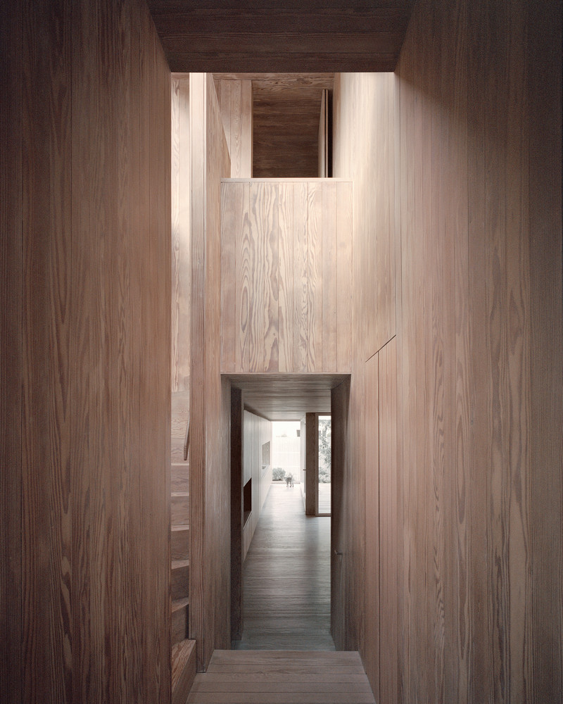 Obytné místnosti domu jsou uspořádané kolem asi dvacet metrů dlouhé chodby, která prochází od vstupních dveří až na opačný konec domu. Součástí je také ateliér v suterénu, který je osvětlený shora skrze prosklení na hlavní fasádě. Největší místností v úzkém domě je obývací pokoj s kuchyní, který se skrze posuvná okna propojuje se zahradou a opticky se tak zvětšuje. „Nábytek včetně stolů, postelí, polic, skříní a dveří je vyroben ze stejných desek z douglasky jako vnitřní obložení. Naproti tomu pracovní plochy v kuchyni, nízké stolky v koupelně a výklenky jsou obloženy matným bílým porcelánem,“ popisuje Russell Jones.