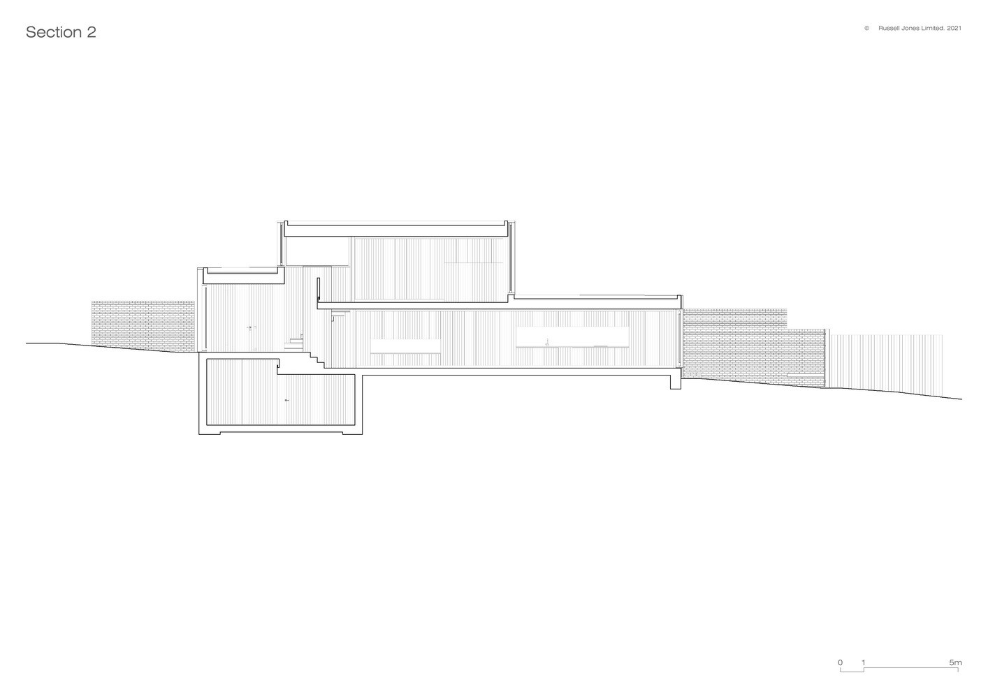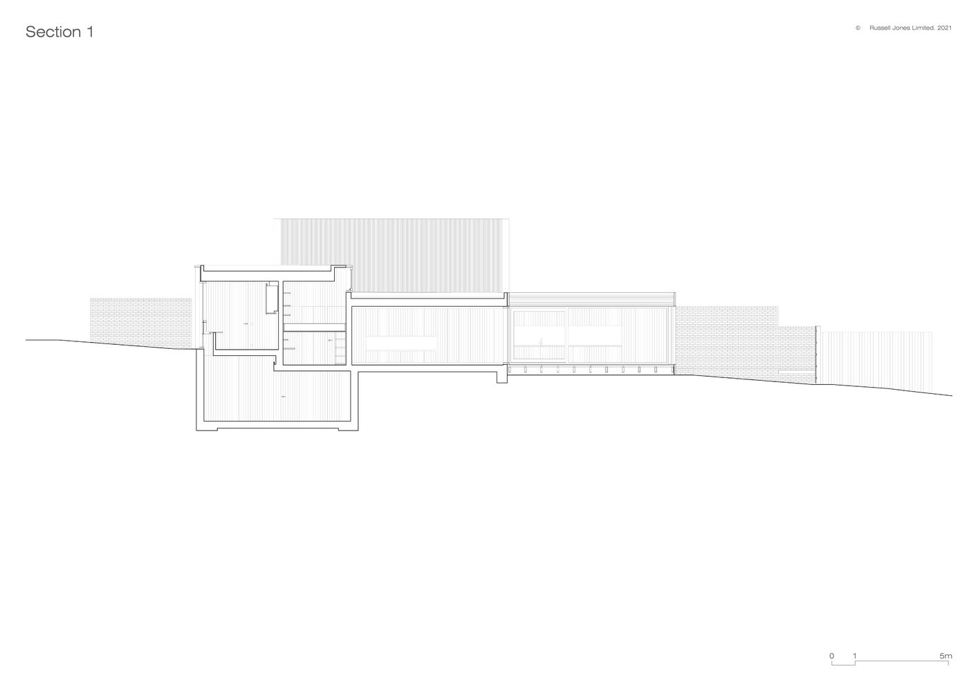 Nový rodinný dům má dřevěnou rámovou konstrukci s vyzdívkami z cihel. Vše nakonec vizuálně sjednotil dřevěný obklad, a to zvenčí i zevnitř. V exteriéru je dům obložený dřevem ze sibiřského modřínu, v interiéru zase deskami z douglasky, které pokrývají podlahu, stěny i strop. Monochromatického účinku bylo nakonec dosaženo i na zahradě, do které se schází z prostorné venkovní terasy. Pod tou se nachází velká akumulační nádrž na srážkovou vodu pro zahradní použití. „Projekt kombinuje vysokou úroveň izolace, tepelné čerpadlo, podlahové vytápění, LED osvětlení, indukční vaření a rezervu pro budoucí fotovoltaické pole,“ dodává k technickým aspektům rodinného domu Russell Jones.