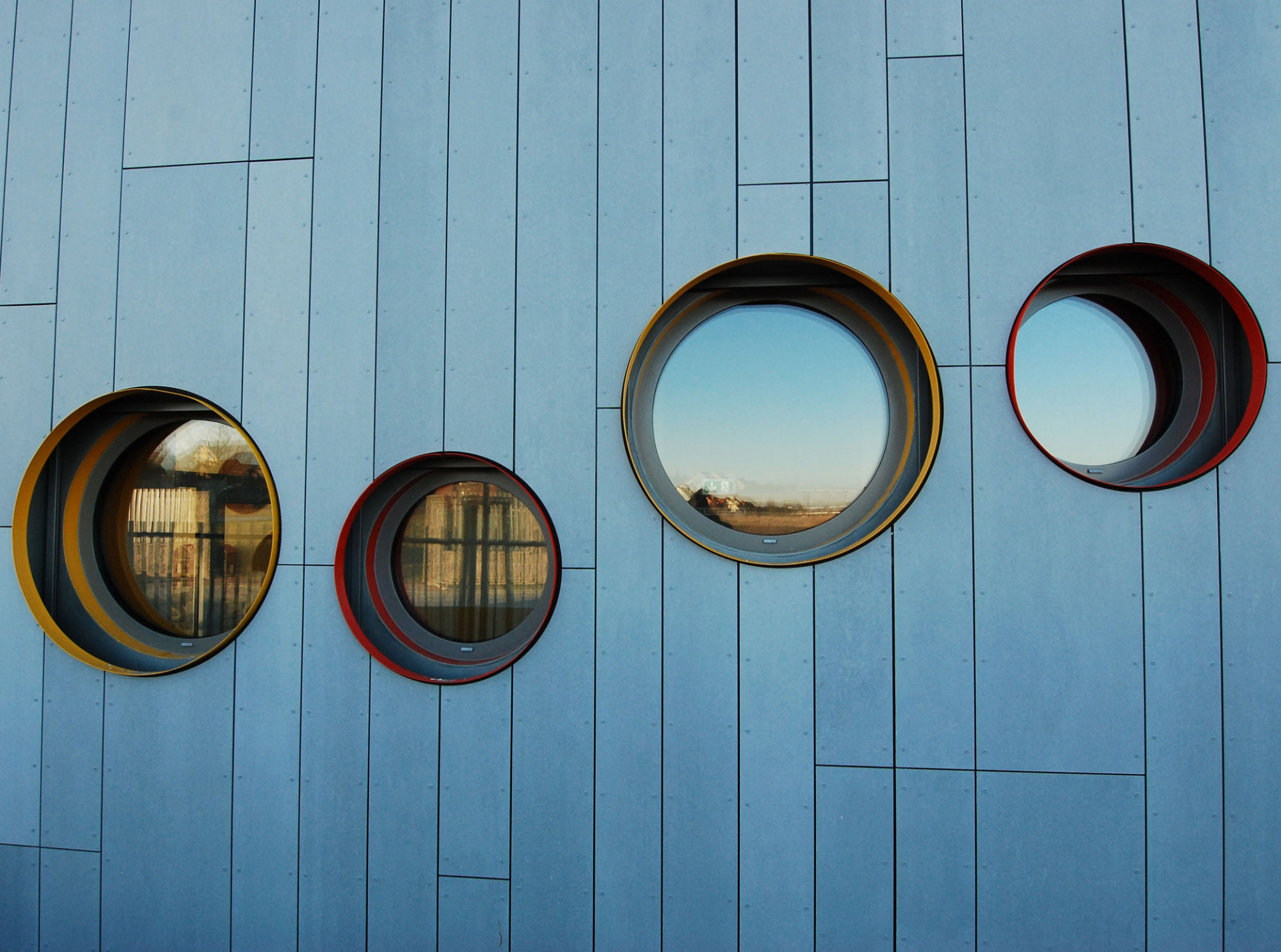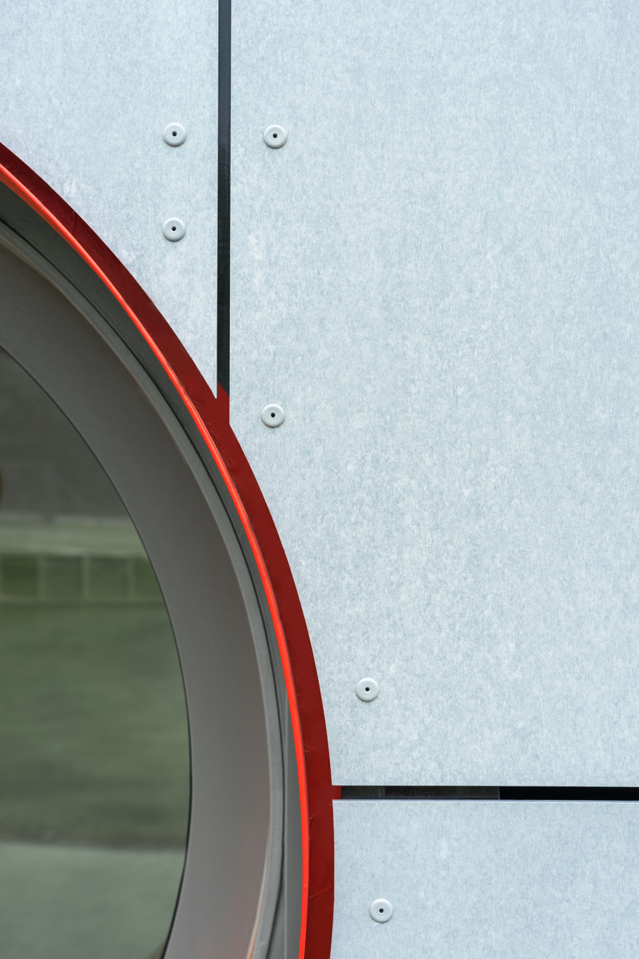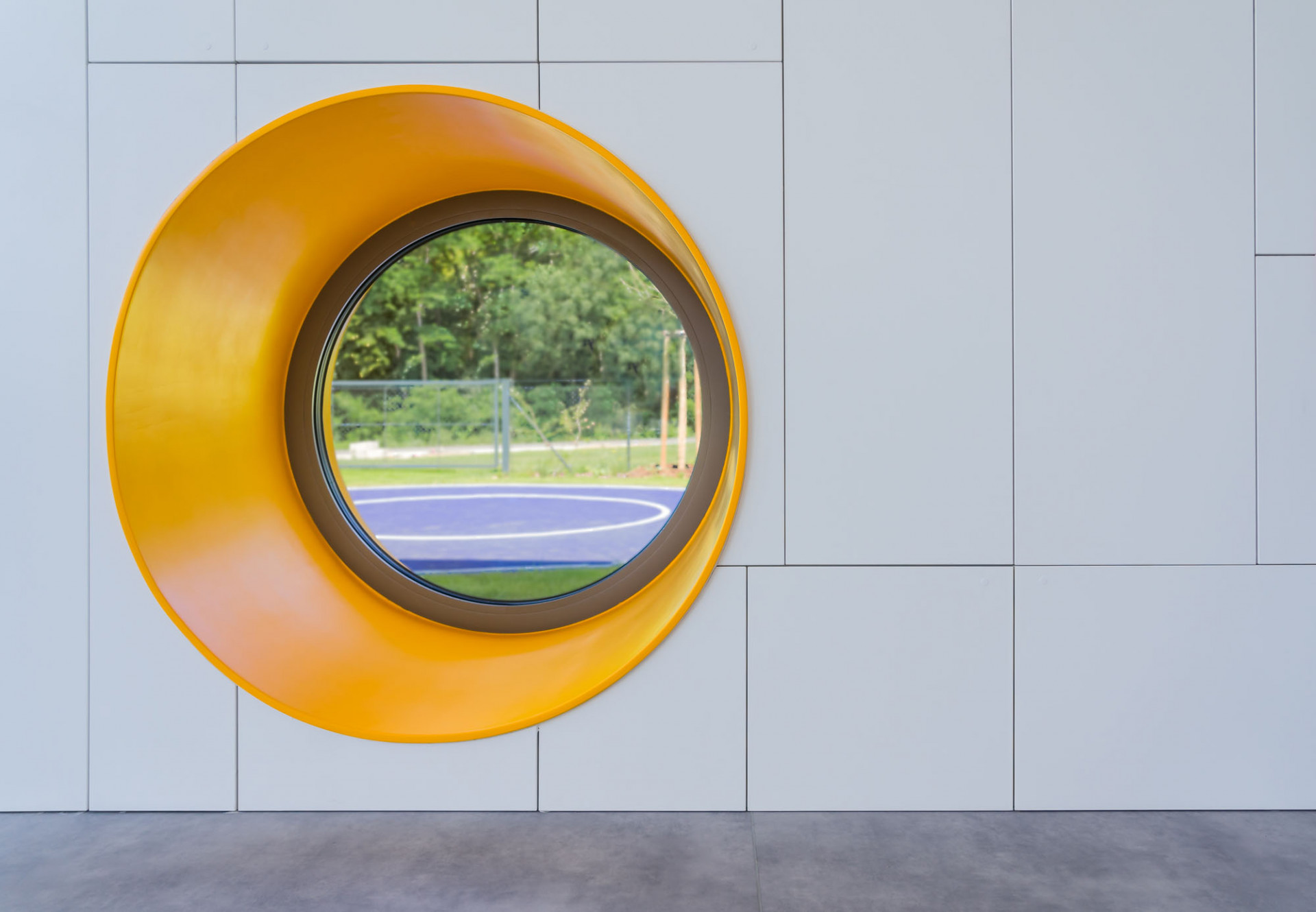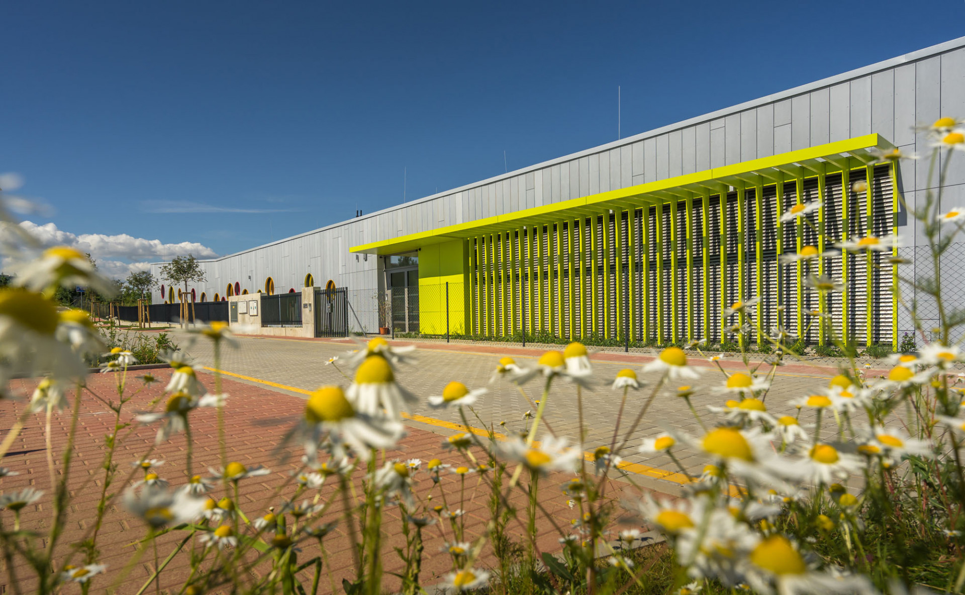 Výrazným architektonickým prvkem budovy jsou kruhové okenní otvory, nepravidelně rozmístěné na podélných fasádách tubusů. Vedle nepravidelné kompozice v ploše fasády pracovali architekti i s různou hloubkou osazení vůči líci fasády, čímž vznikly různě hluboké válcovité prostory. Ostění kruhových otvorů navíc autoři zvýraznili kombinací žluté, červené a oranžové barvy. Stejné odstíny použili na fasádním obkladu z HPL laminátových desek v čelech tubusů a to včetně podlah teras, kde se uplatňují desky s 3D dekorem pro zajištění požadovaných protiskluzných parametrů. S výrazně barevnými čely kontrastují šedé boční fasády s obkladem z vláknocementových fasádních desek Cembrit v šedém odstínu Patina Original. Fasádní obklad v místech heren na stěnách orientovaných do zahrady navrhli autoři v podobě dvojité fasády. Tím vznikly důmyslné úložné prostory pro hračky, sportovní náčiní a další pomůcky jak pro děti, tak pro údržbu objektu a zahrady.