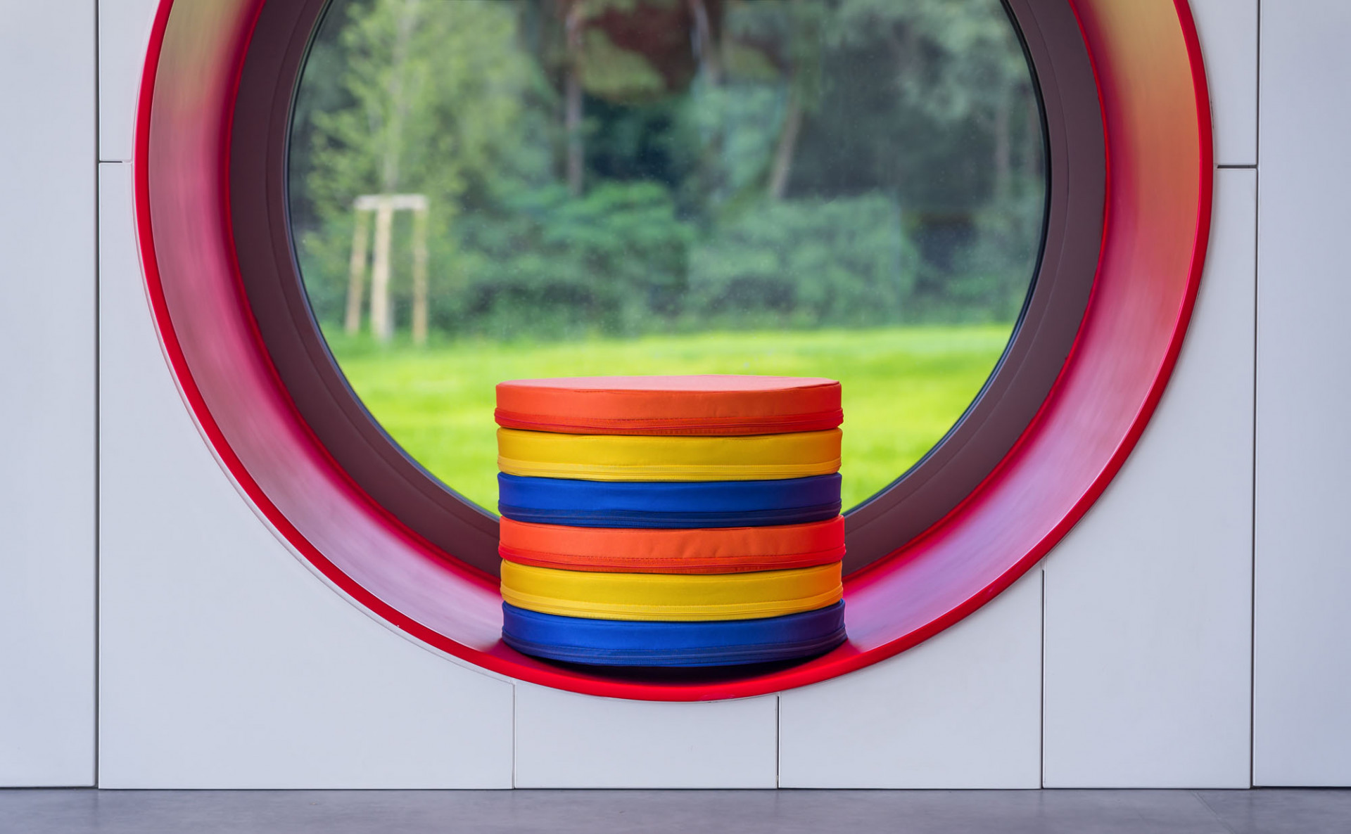 Na samém okraji středočeské obce Dolní Břežany dokončilo loni studio S.H.S architekti novou budovu mateřské školy. Jednotlivé třídy umístili autoři do tubusovitých hmot s barevně rámovanými kruhovými okenními otvory.