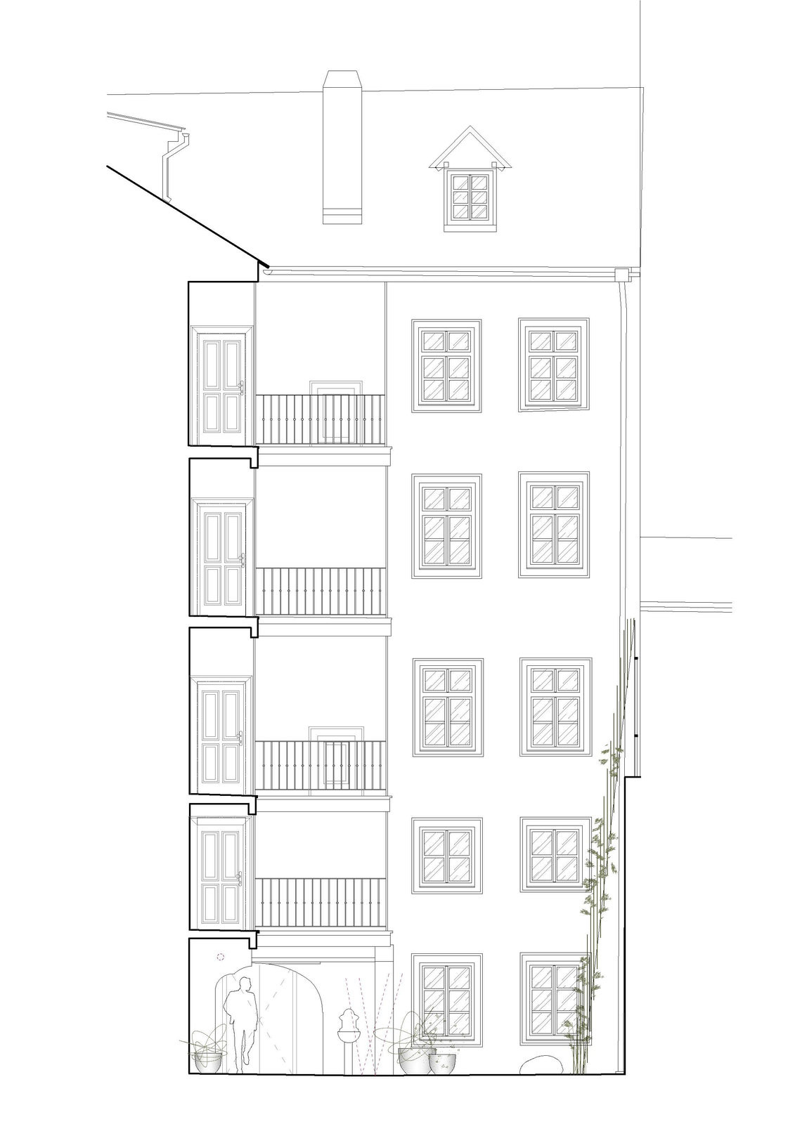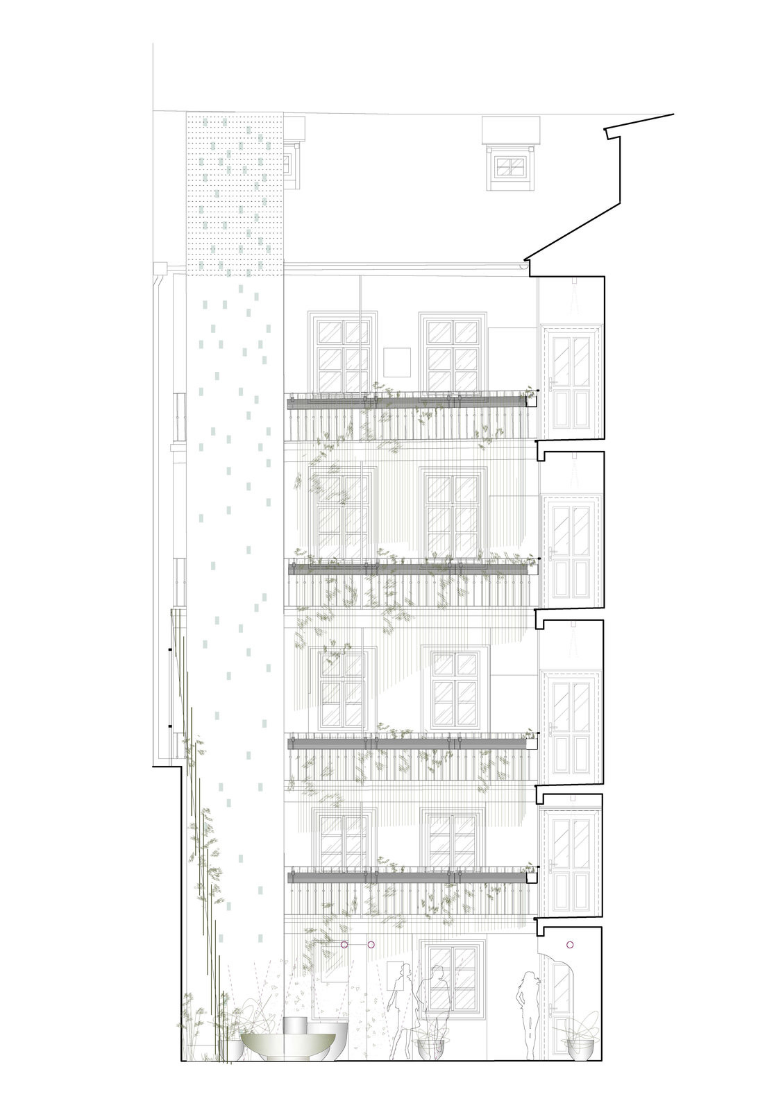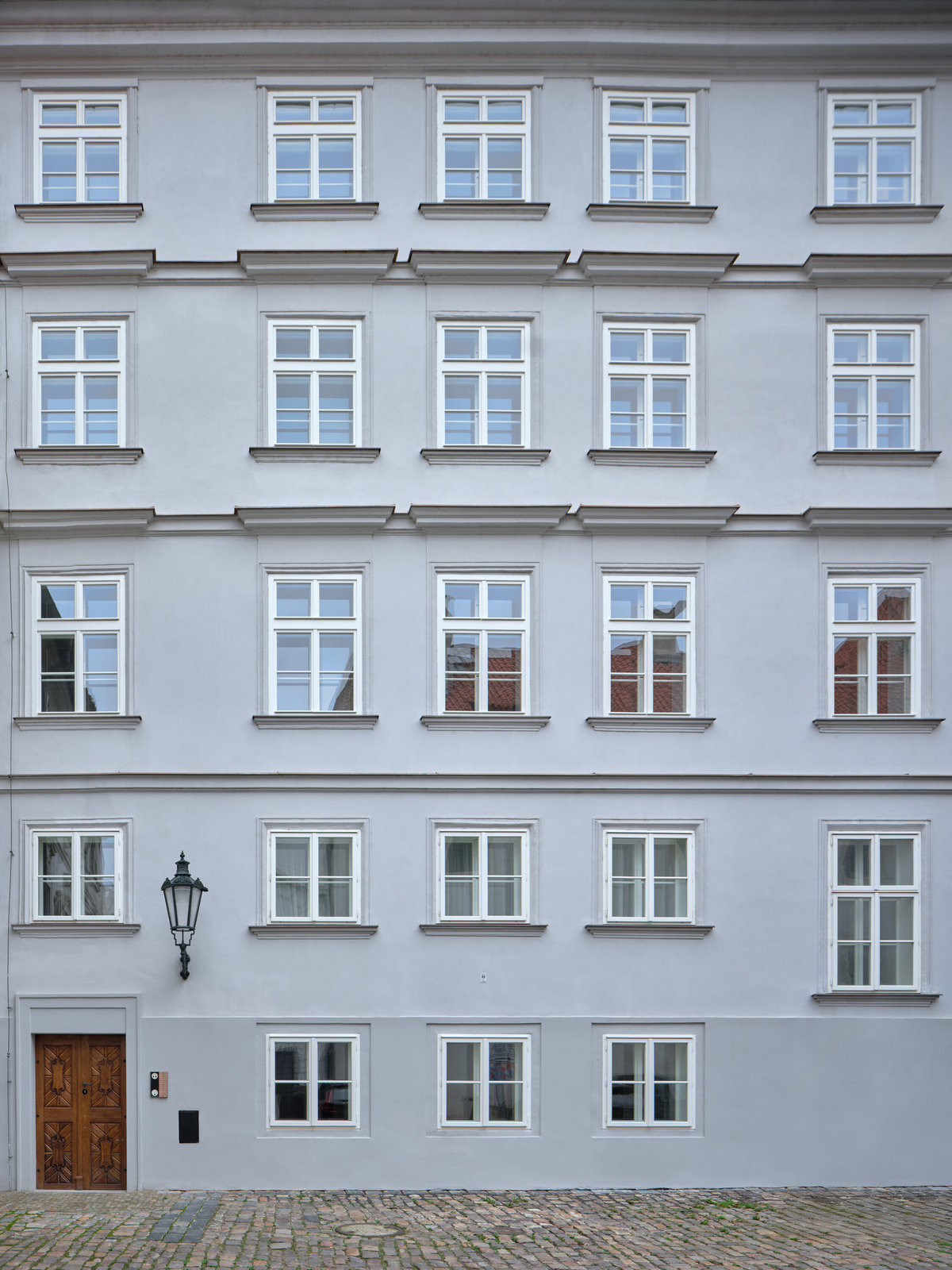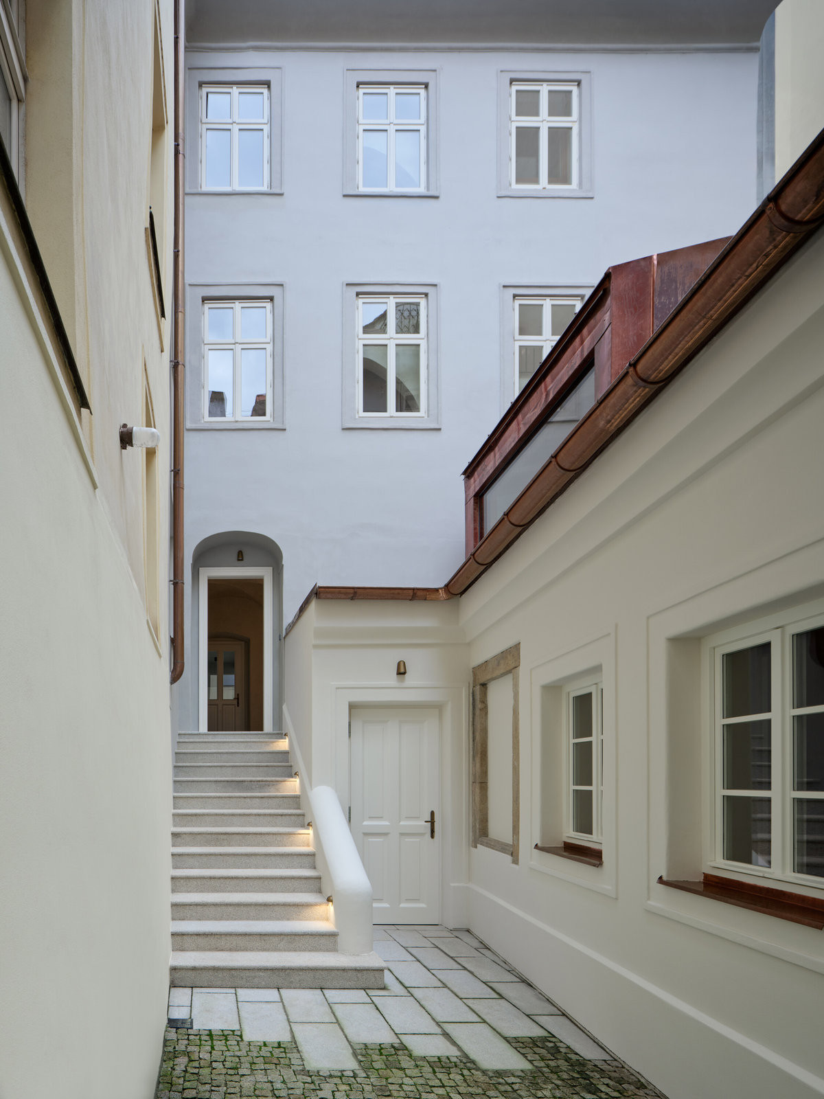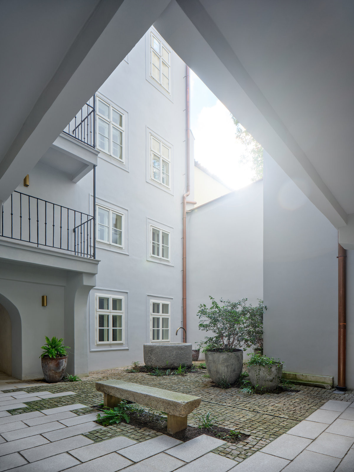 Jedinečný genius loci Malé Strany – od chrámu sv. Mikuláše po Valdštejnský palác – byl pro autory a autorky závazkem. „Snažili jsme se vyslechnout historii domu a doplnit ji jemností a detaily. Tvoříme současně, ale respektujeme historii,“ říká architekt Jan Roučka, který měl na starosti návrh exteriérů, interiérových standardů a společných prostor.