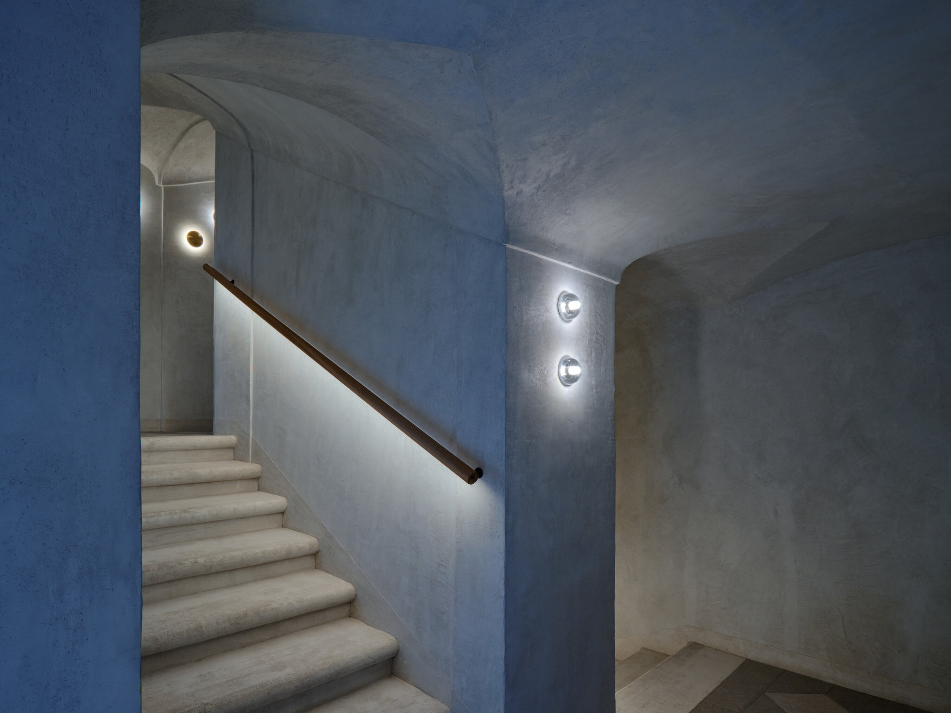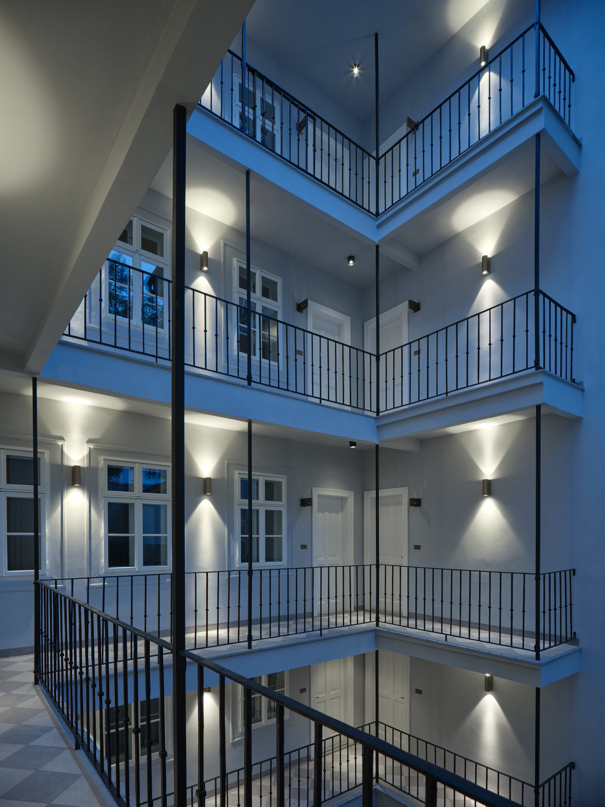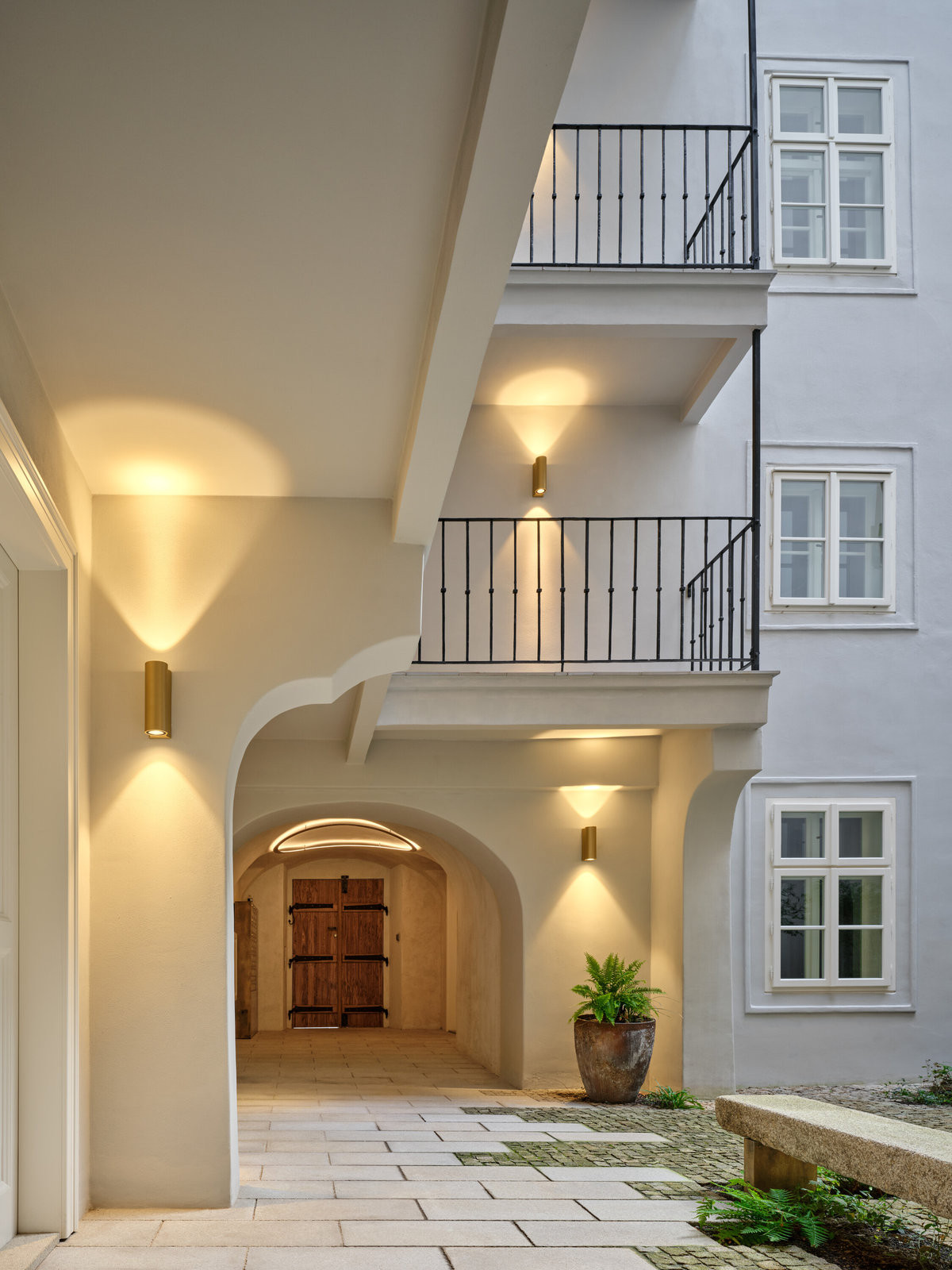 Zvláštní pozornost architekti věnovali i schodišti, které se stalo nositelem astrální a alchymistické atmosféry projektu VII. Dům - název hravě spojuje číslo popisné a astrologický význam Sedmého domu jako domu partnerství. Osvětlení připomíná vesmírná tělesa, světelné linie evokují dráhy meteorů a poštovní schránky z patinované mosazi dotvářejí obraz místa, kde se historie potkává s fantazií.