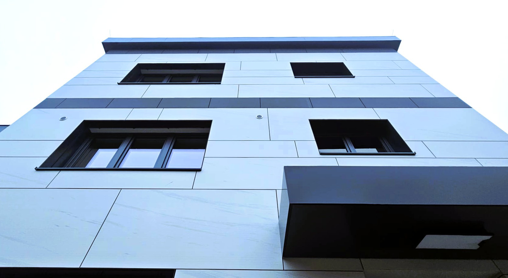 Původní břízolitová omítka, která po desetiletí vytrvale chránila stěny, již nevyhovovala moderním požadavkům na tepelný komfort a estetiku. Vzhledem k drsnému podnebí Českomoravské vrchoviny, kde jsou extrémní výkyvy teplot a silné srážky běžné, bylo třeba zvolit technologicky pokročilé řešení: systém odvětrané fasády s velkoformátovou keramikou FRONTEK.