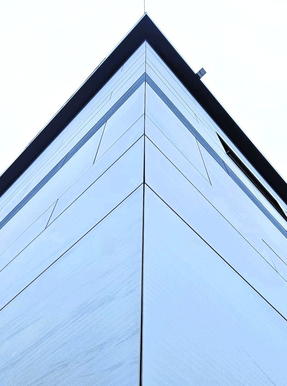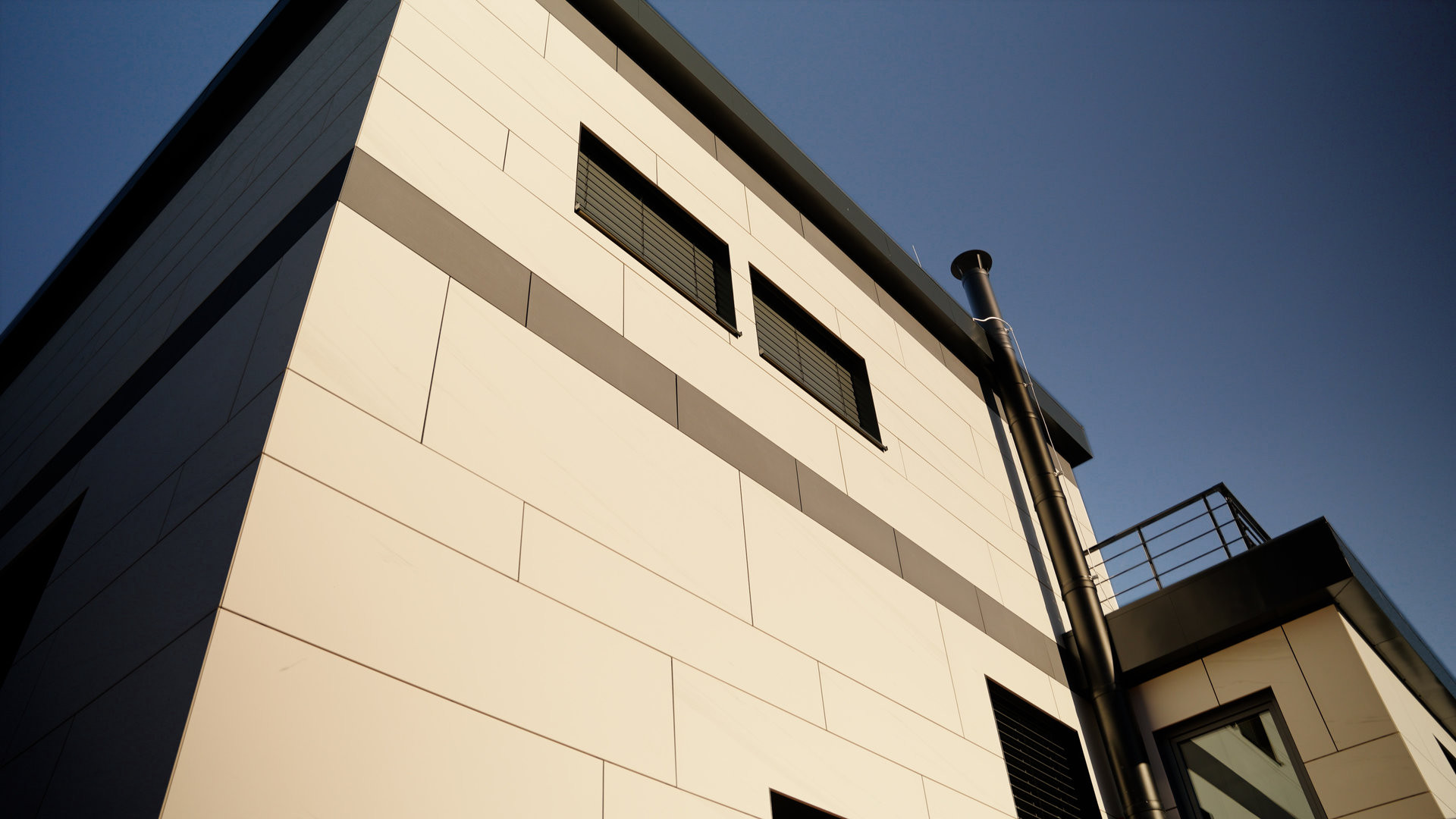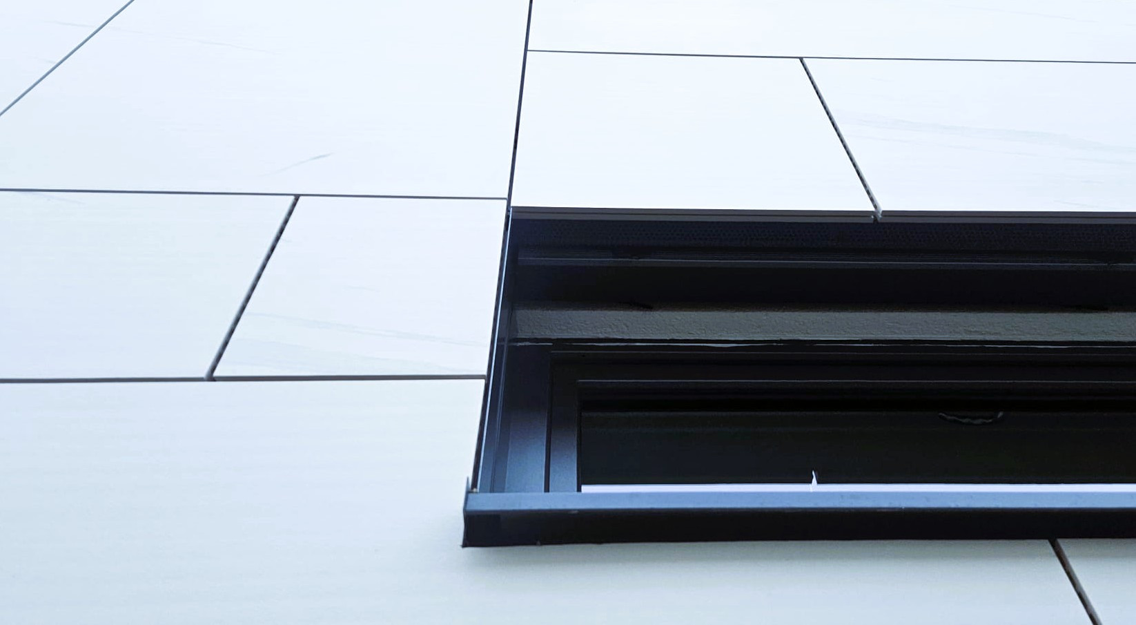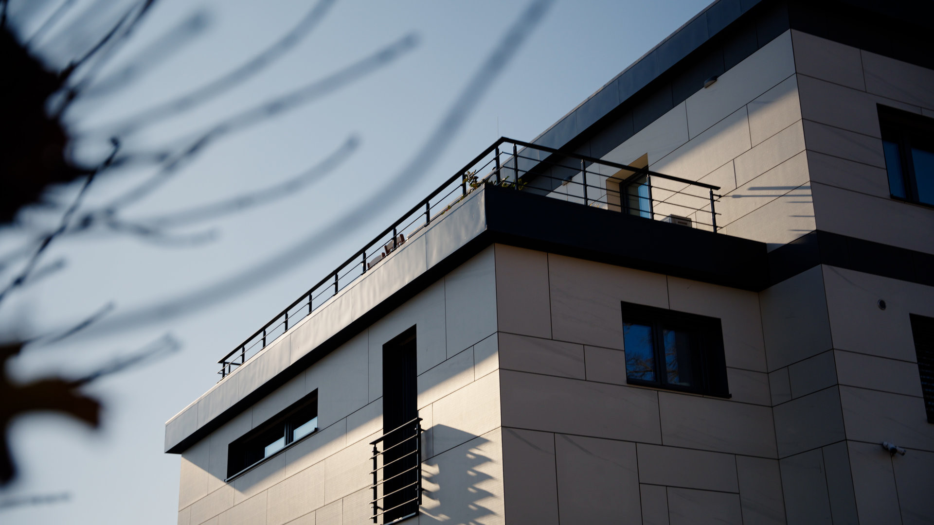 Zajímavostí tohoto řešení jsou precizní spáry a návaznost keramických panelů na tmavé prvky fasády. Dokonale navržený spárořez je důležitý pro výsledný vzhled a zároveň je typickým estetickým detailem pro konkrétní stavbu. Systém FRONTEK umožňuje neviditelné kotvení, což podtrhuje monolitický a jednotný výraz domu. Nároží jsou řešena čistě, bez rušivých profilů, což je u velkoformátové keramiky vždy obtížné.
