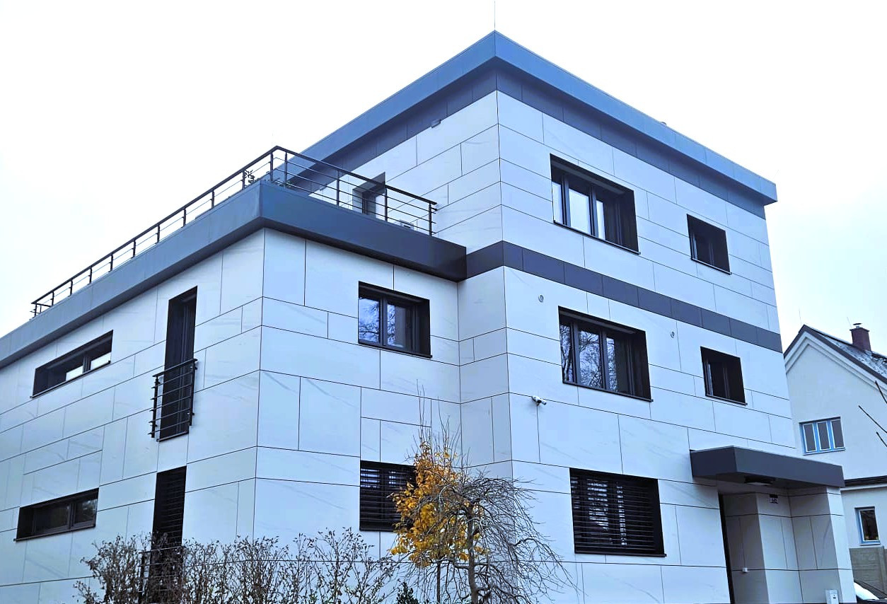 Tato keramika se díky jemnému mramorovému dekoru stává charakteristickým designovým prvkem celého domu a zároveň funguje jako ochranný krunýř. Její neporézní povrch je nenasákavý, mrazuvzdorný a odolný vůči UV záření. Odvětraná mezera mezi novou fasádou a původním zdivem navíc zajišťuje, že konstrukce dýchá, a v interiéru tak vzniká optimální mikroklima po celý rok.