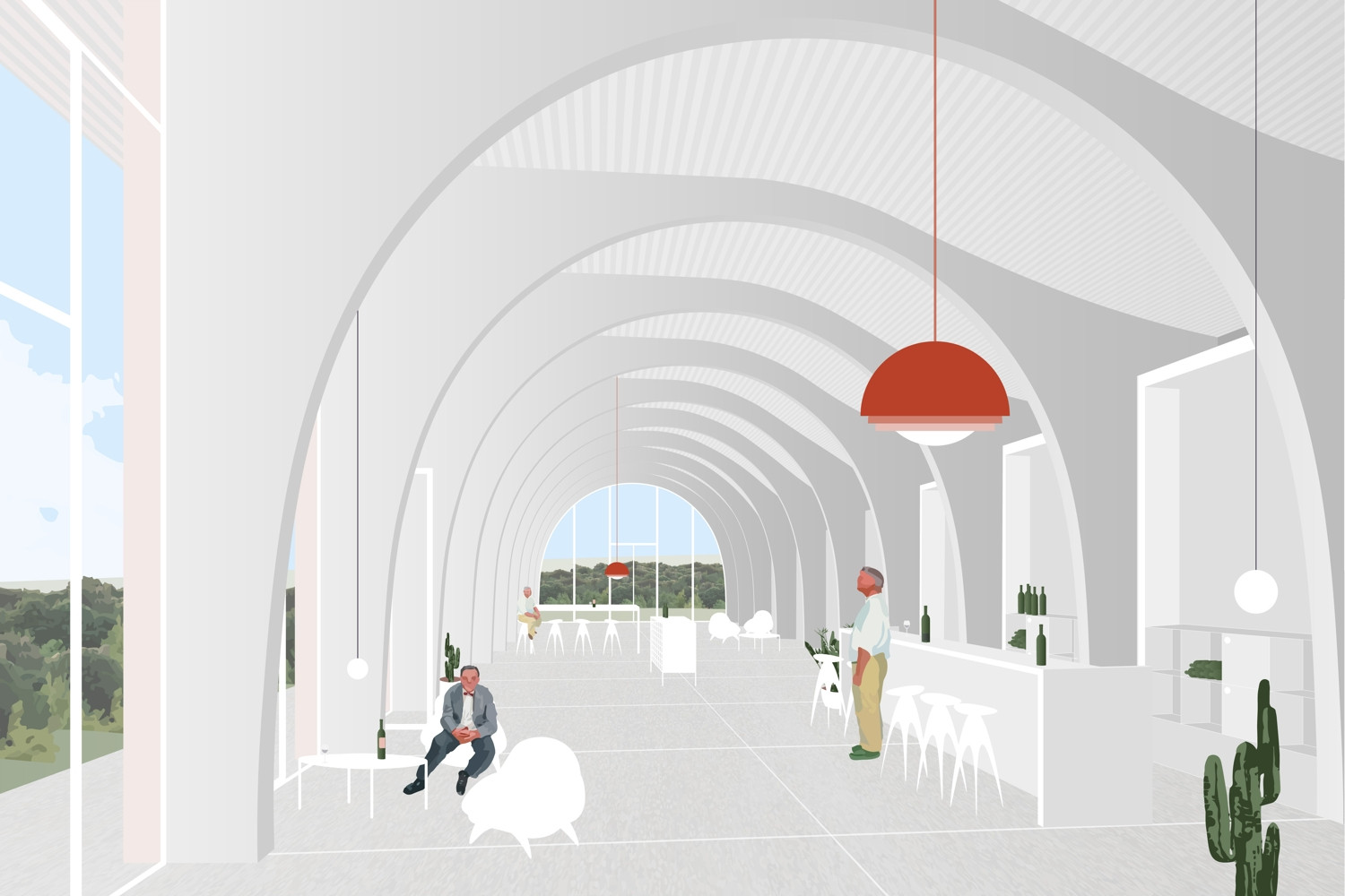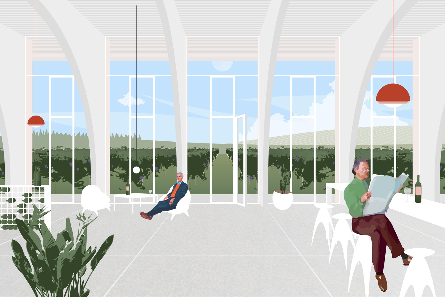 Prezentační místnost bude pohledově propojena s prostorem pod prohnutou střechou, kde přes navržené prosklení zůstane patrný průběh žeber i střechy. Celý prostor bude maximálně otevřen směrem na jih do klesajícího svahu a z každého pole bude výhled mezi řádky vinice. V interiéru se ve větší míře uplatní dřevo, beton a sklo. Venkovní amfiteátr na střeše návštěvnického centra bude možné využít na pořádání různých kulturních a společenských akcí, jako jsou vinobraní, svatby, letní kina a další.