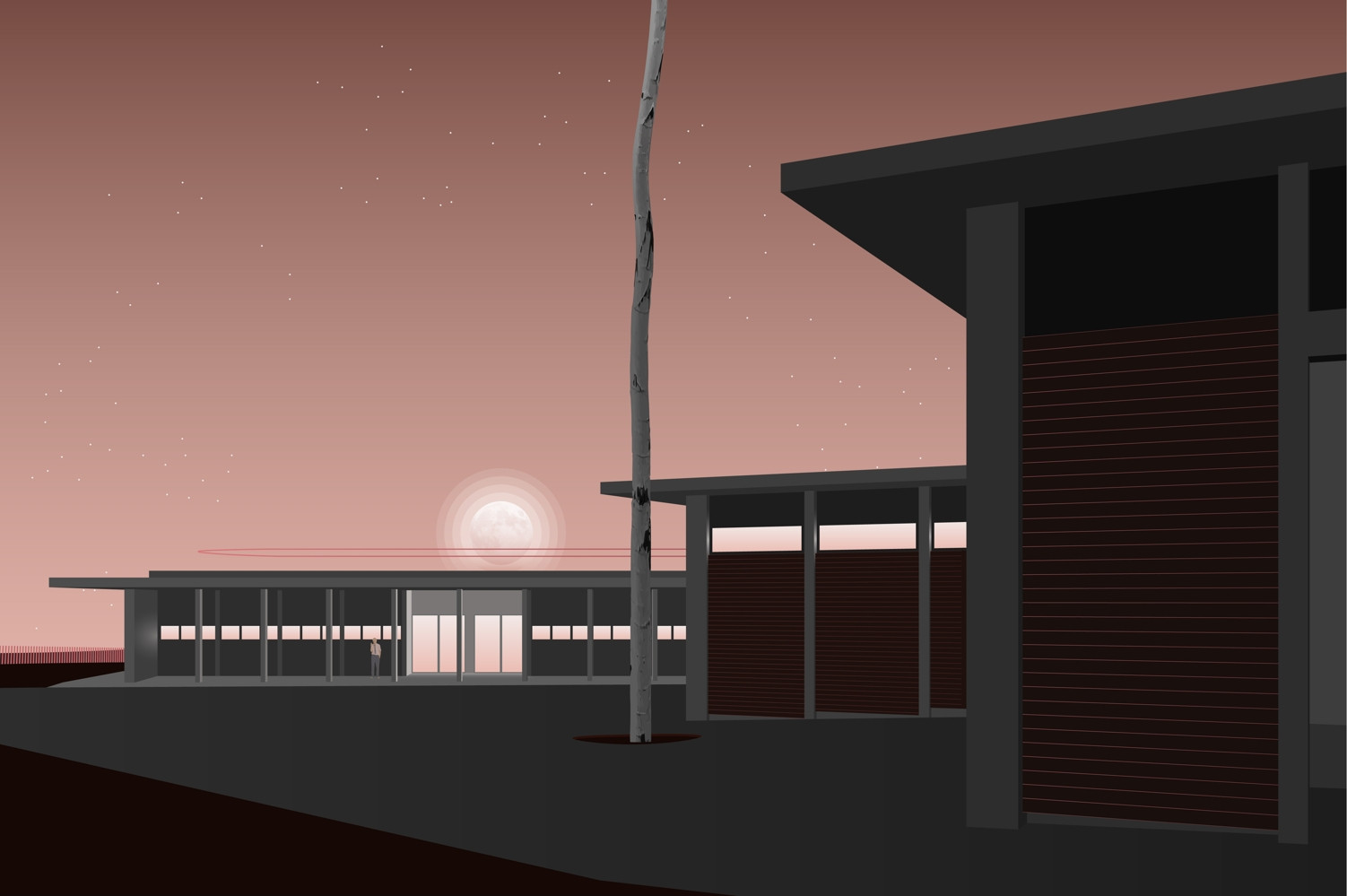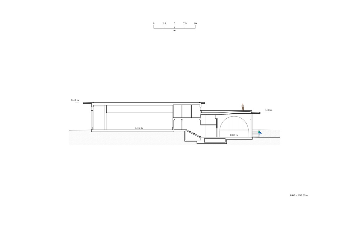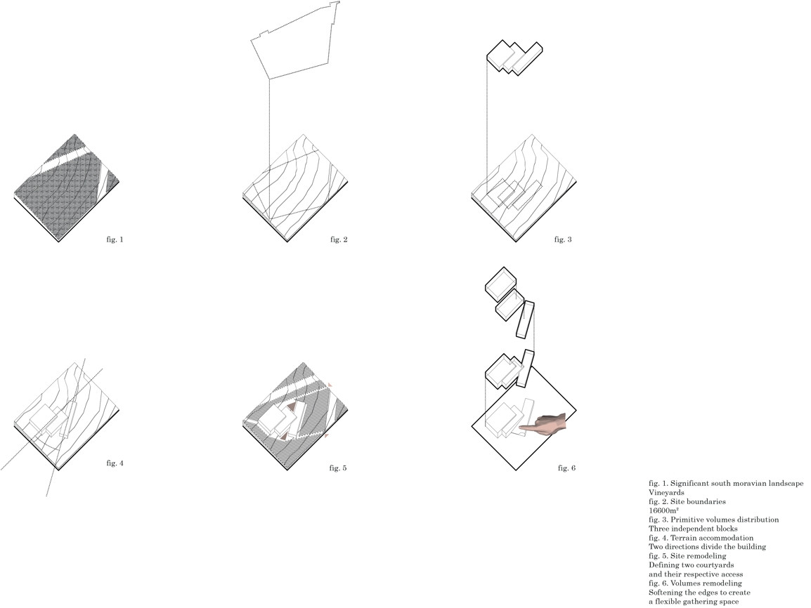 Stavba je zasazena do stávající vinice a stavební program je rozdělen do tří objemů s rozdílnou konstrukční výškou, jejichž umístění přirozeně reaguje na mírný sklon terénu. „Nechtěli jsme do krajiny vstupovat s příliš velkým měřítkem. Rozdělením do tří hmot se celkový objem domu odlehčí,“ popisují koncepci architekti Chybík a Krištof.