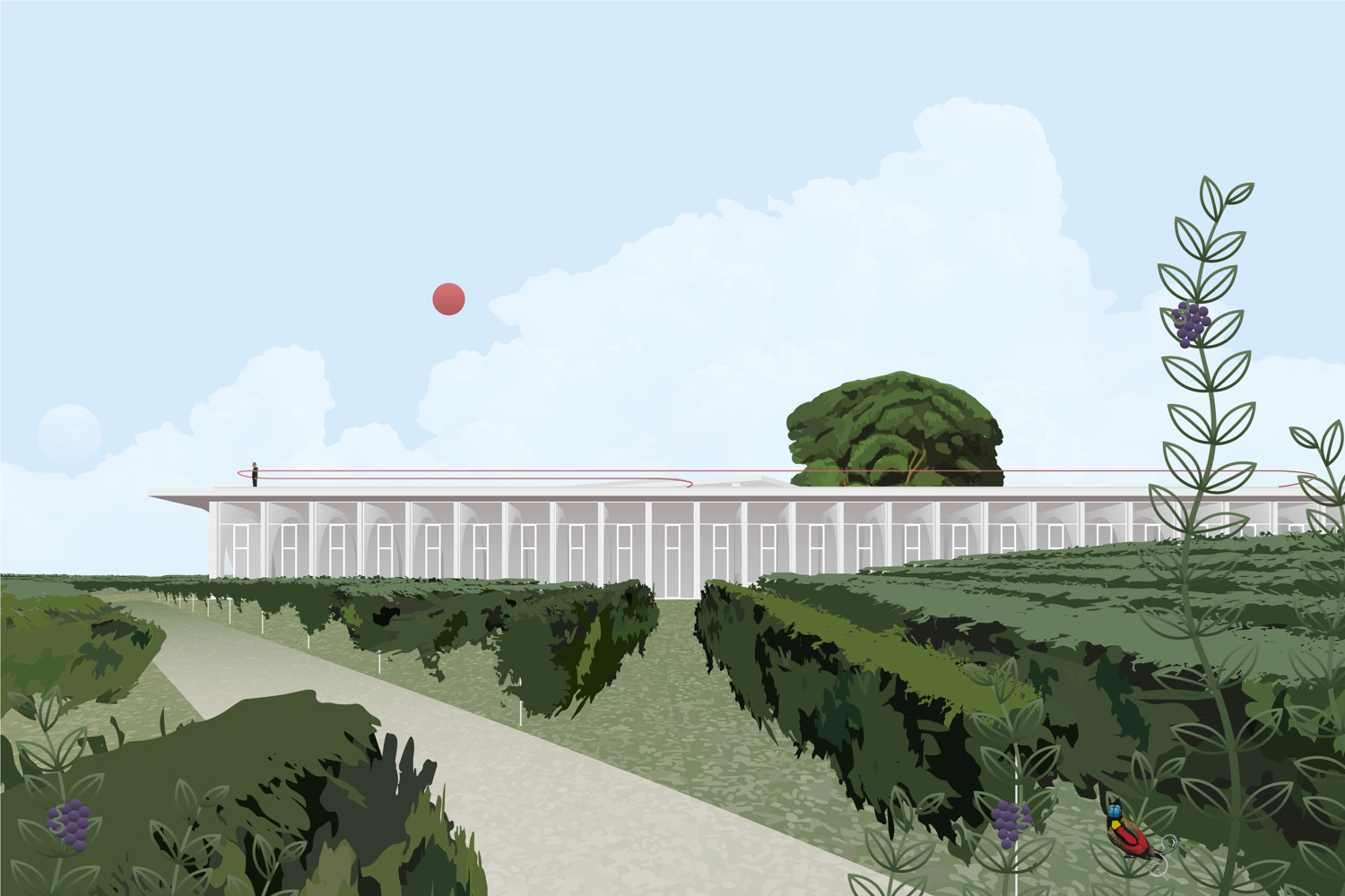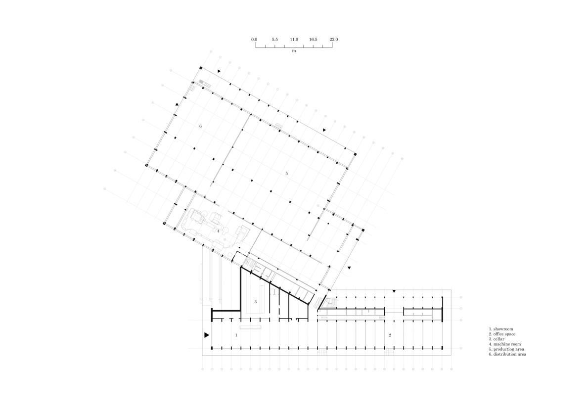 V průsečíku obou funkcí se bude nacházet vstup do výrobní části rozdělené do dvou samostatných hmot. První, nižší hala v sobě zahrne provozy a zázemí výroby i zaměstnanců s přirozeným vnitřním prostředím a přirozeným osvětlením pásovými okny pod střechou objektu. Druhá hala pokryje provozy s požadavkem na nižší teplotu – lisovnu, sklep a sklady lahvovaného vína.