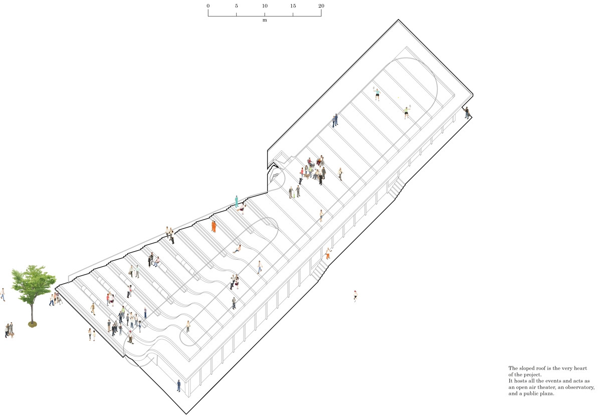 Střecha budovy bude plochá, v části pobytového amfiteátru je navržena jako zborcená plocha. Její monolitické železobetonové přesahy jsou od interiérové části oddělené pomocí prvků pro přerušení tepelných mostů. V jedné části zborcené plochy – nad vinným sklepem – je stropní deska koncipovaná jako prostorová skořepina tvořená kombinací zakřivených rámů a střešní železobetonové desky.