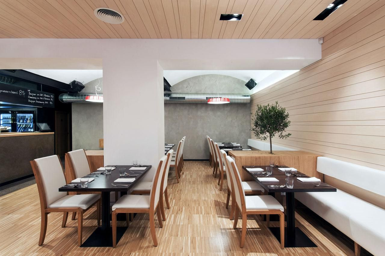 Z hlediska materiálů jsme se rozhodli pro kartáčovaný dub v kombinaci se světlým jasanovým obkladem a cementovou stěrkou. Tmavý „box“ hygienického zázemí jsme omítli probarvenou utaženou cementovou stěrkou a na podlahu jsme položili nerezový protiskluzný plech v kombinaci s polyuretanovou stěrkou, do které jsou přimíchány barevné „chipsy“. Restaurace s kapacitou 45 míst byla otevřena v listopadu 2012.