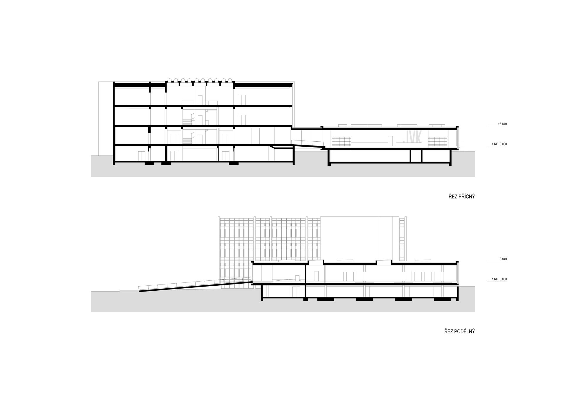 „Propojení obou budov knihovny zajišťuje rampa v proskleném tubusu. Po straně budovy se otevírá průchod parkem směrem k řece Malši, kam jsou umístěny výtvarné prvky – Novohradský valoun a stávající památník padlým u Zborova,“ upřesňují architekti.