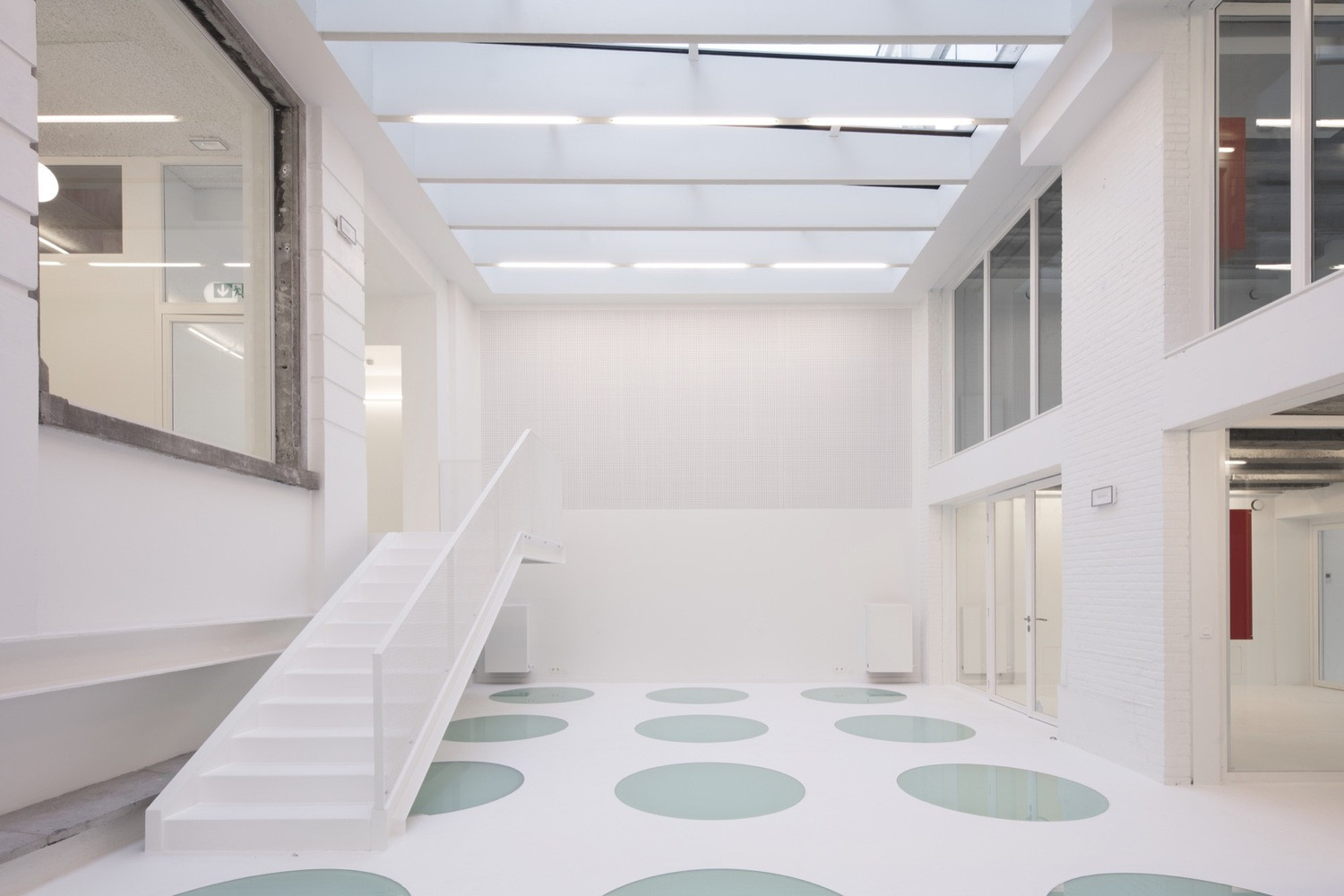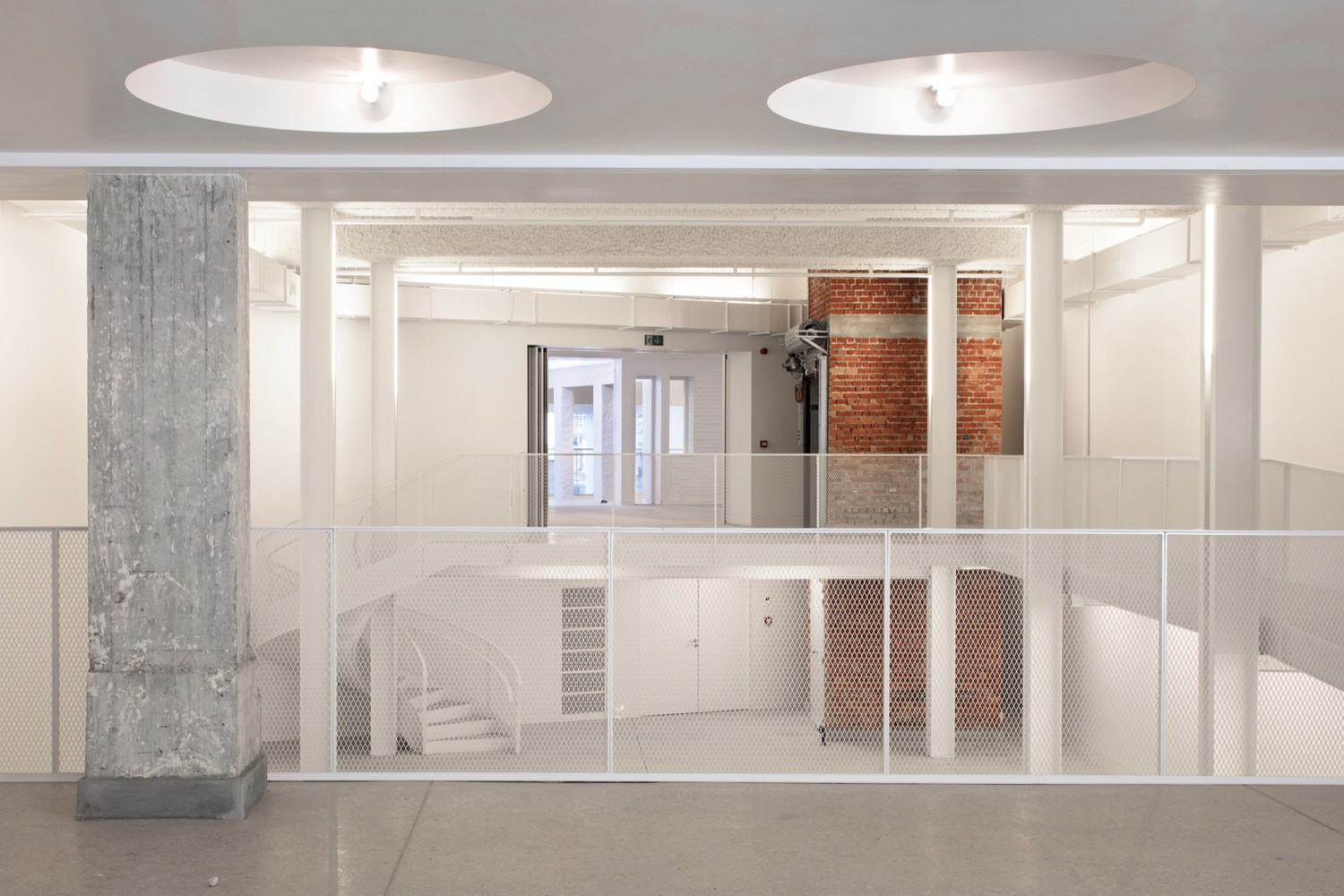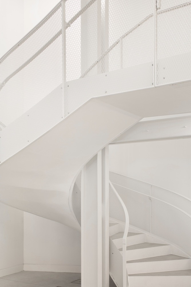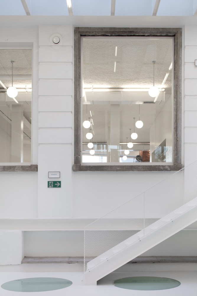 Interiéry sceluje bílá barva stěn, stropů i podlah. Pouze lokálně autoři očistili části původní konstrukce a nechali je v odhalené podobě – ať už jde o železobeton či pálené cihly. Při bourání některých stěn postupovali velmi opatrně s pečlivou přesností. Vnitřní prostory pak doplnili pestrou paletou materiálů a detailně řešených prvků.