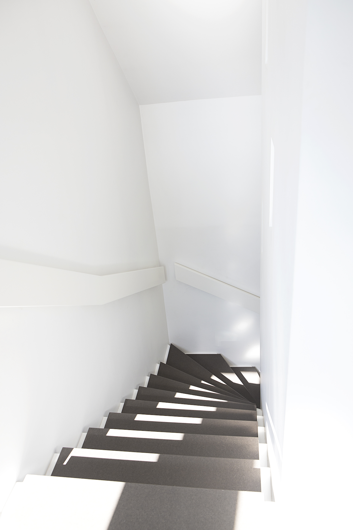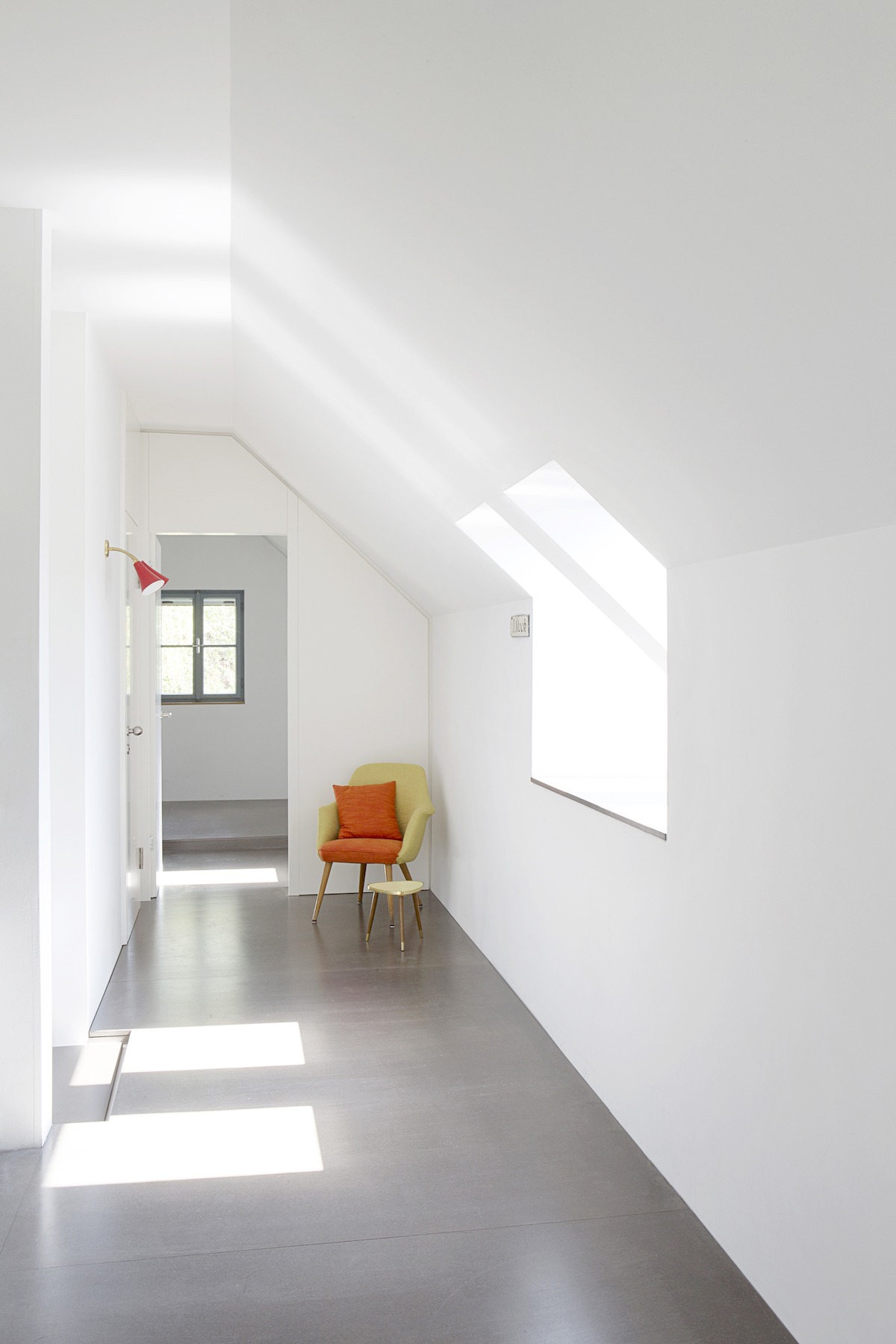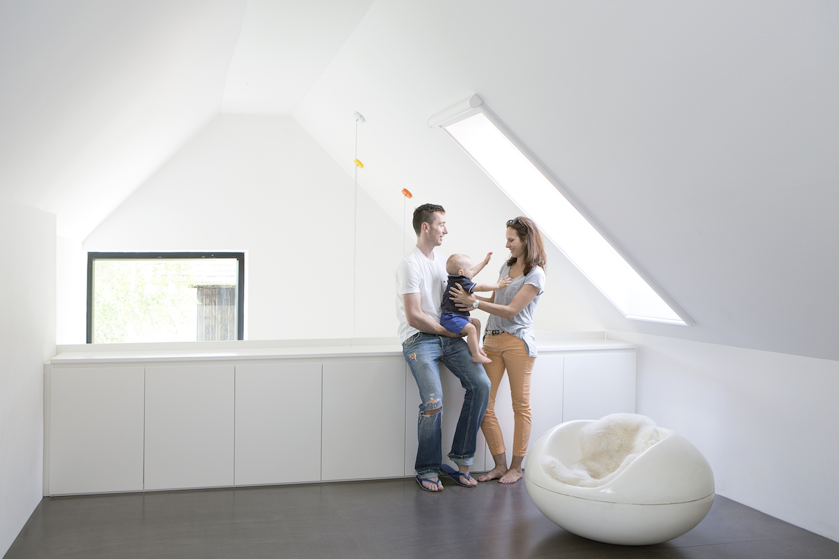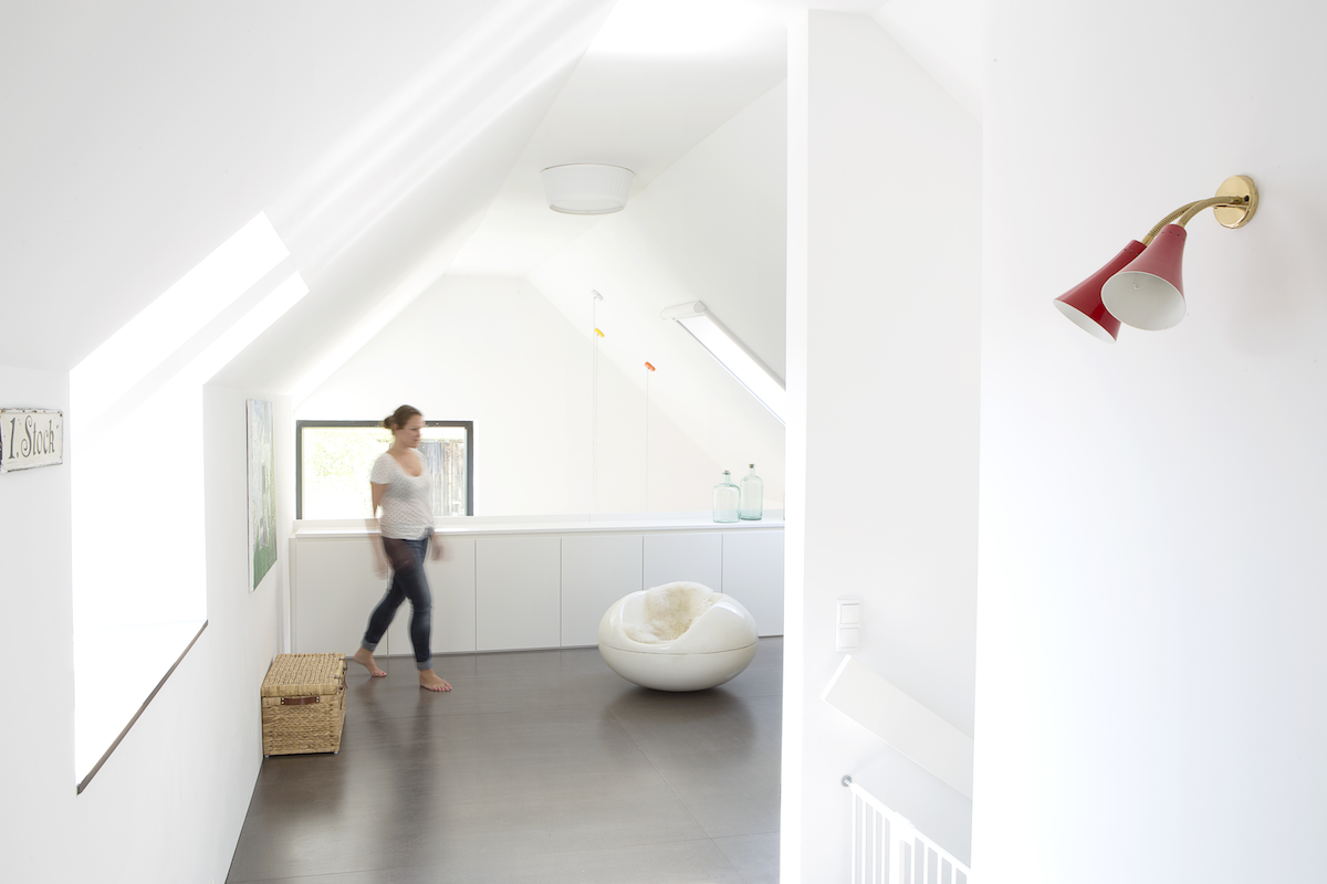 Světlý interiér vyniká čistotou a otevřeným přízemím, kde se propojuje kuchyň a jídelna s přímým vstupem na západní terasu skrz obývací pokoj s krbem. Z jídelní zóny je možné vystoupat nahoru po dřevěném schodišti do prostorné galerie. Obě patra také propojuje dvoupodlažní pás oken, díky nimž je hezky vidět do zahrady. Dvouúrovňový pás oken rovněž doplňují nově osazená střešní okna VELUX. Prostor neoddělují žádné zbytečně rušivé příčky, proto se denní světlo rovnoměrně rozlévá do celého interiéru. Světlo procházející střešními okny navíc přímo dopadá na některé důležité zóny, jako jsou vstup na schodiště či galerie. V horním podlaží se dále nachází východně orientovaná ložnice a koupelna.