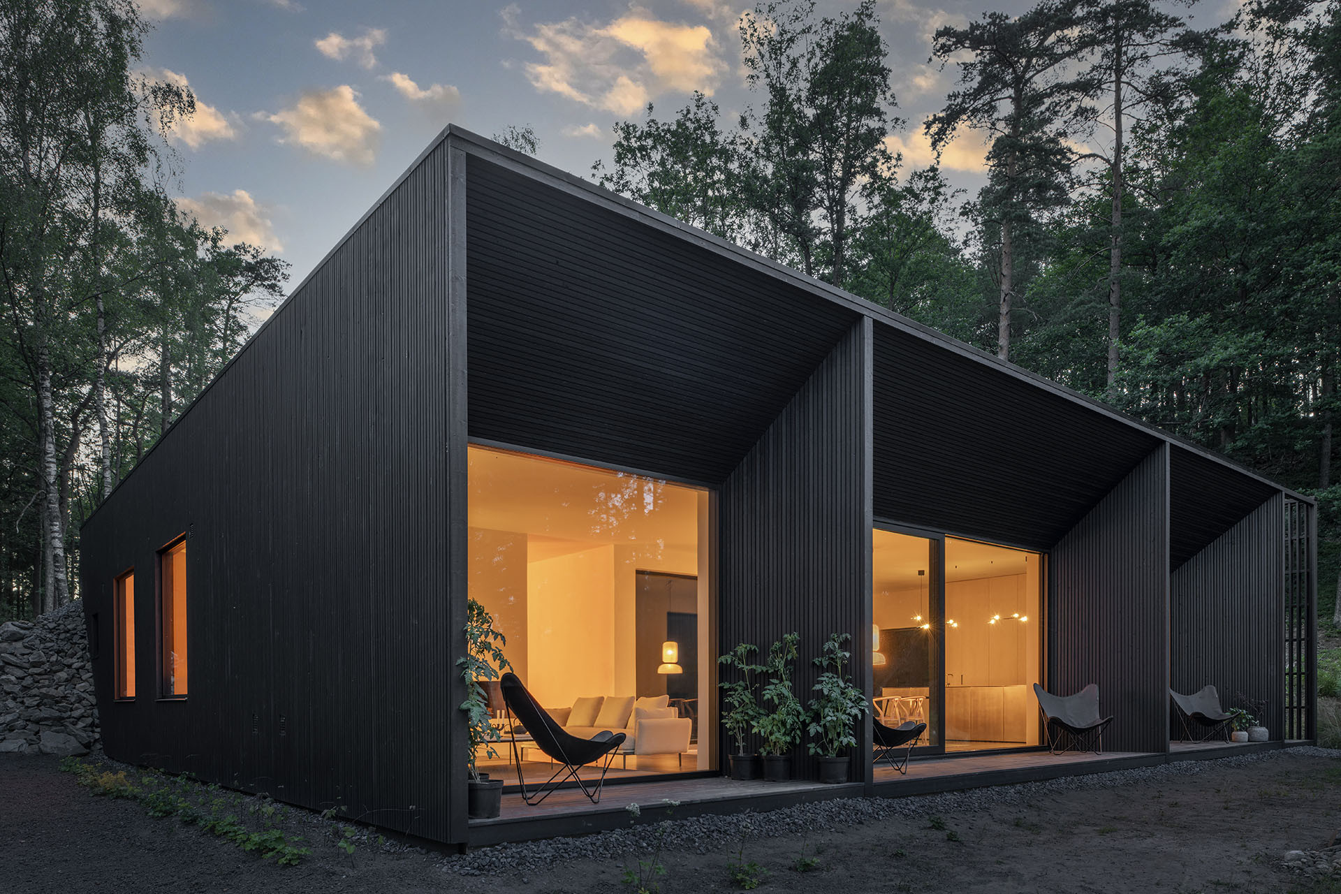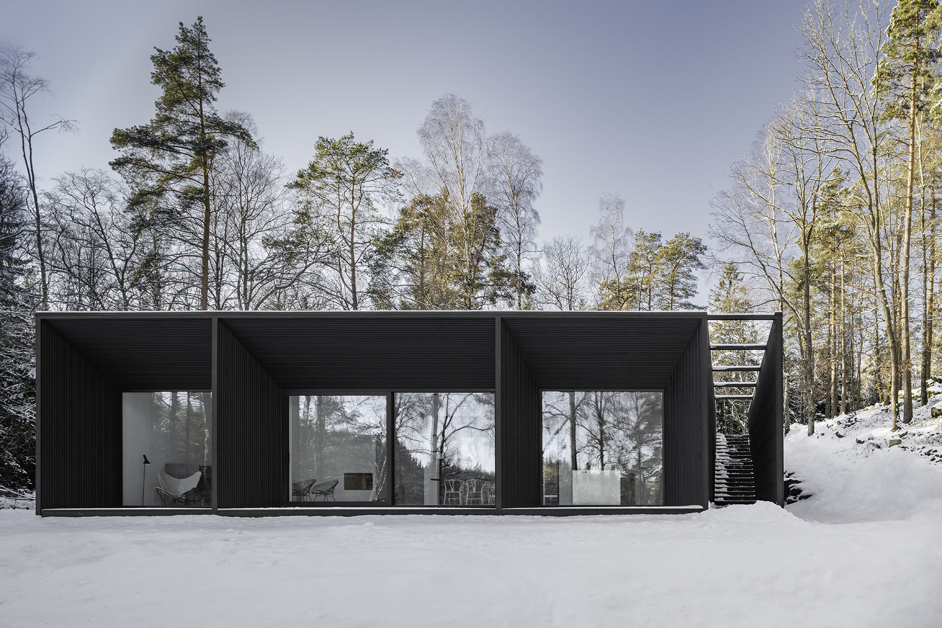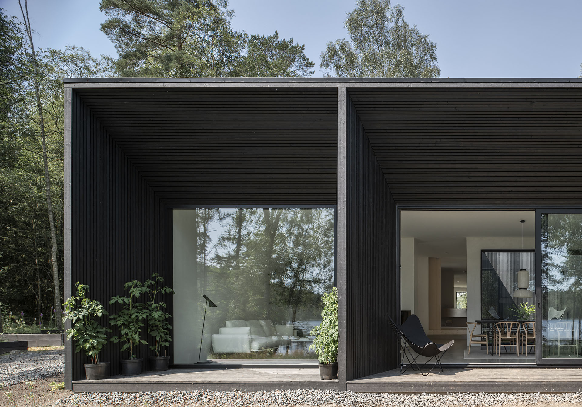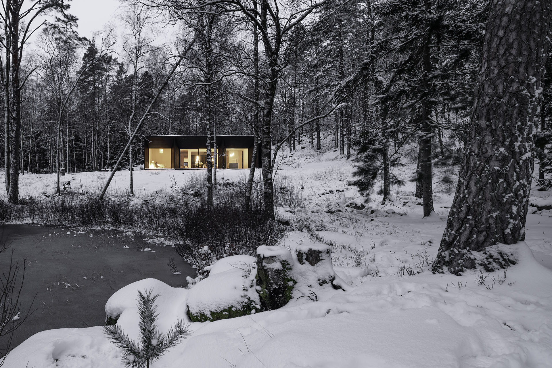 Najít dům u jezera a zároveň poblíž města je výzva, a to i ve Švédsku, které oplývá mnoha jezery. Ale mladá dvojice architektů měla štěstí. Místo skleněného domu si však nakonec navrhla „introvertní stavbu“ – impulsem ke změně byla noc strávená venku po shlédnutí hororu... V domě uprostřed divočiny si nyní místo obrazů užívá soukromou galerii – okny orámované výhledy na jezero z pohodlí domu.