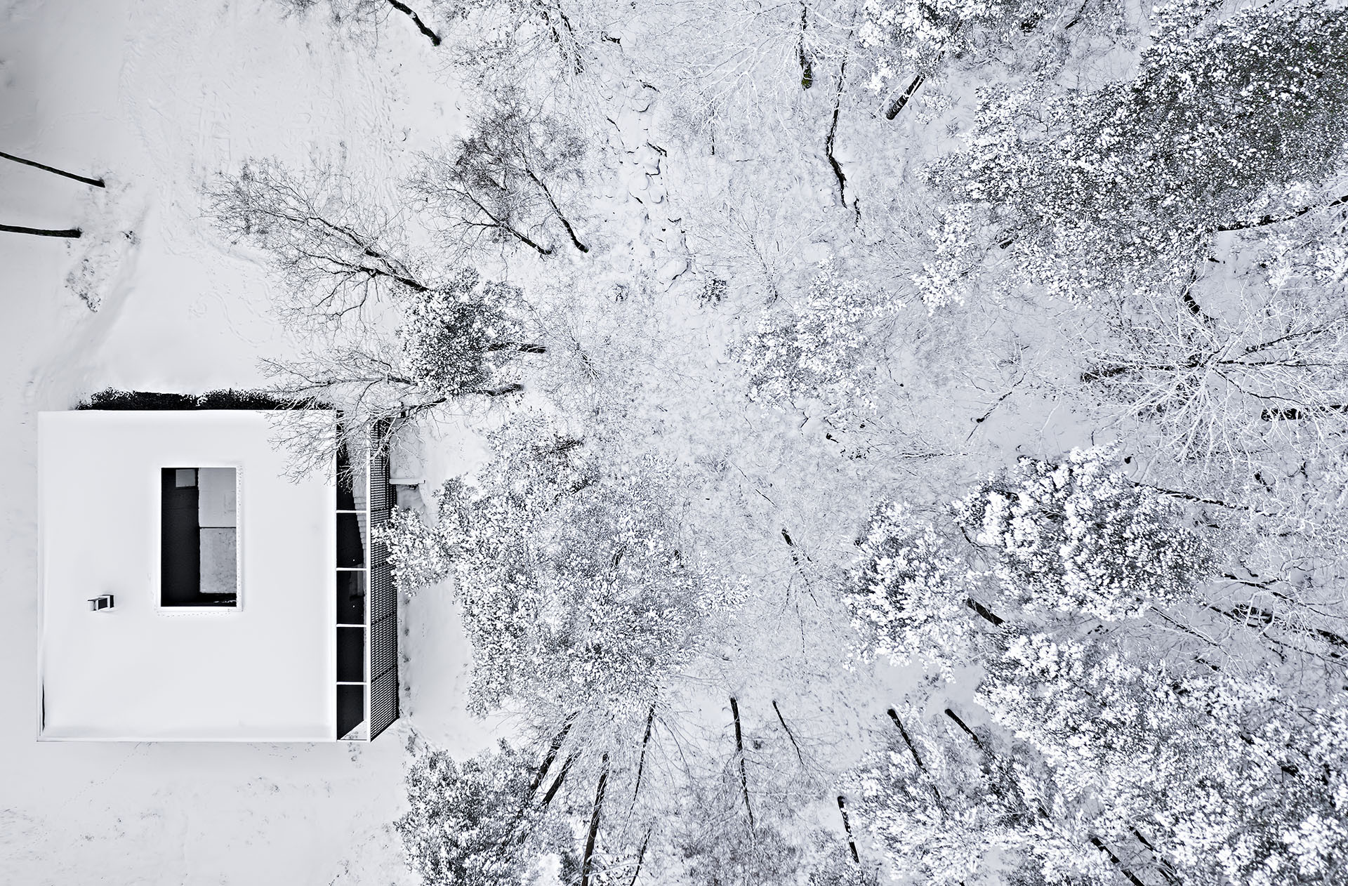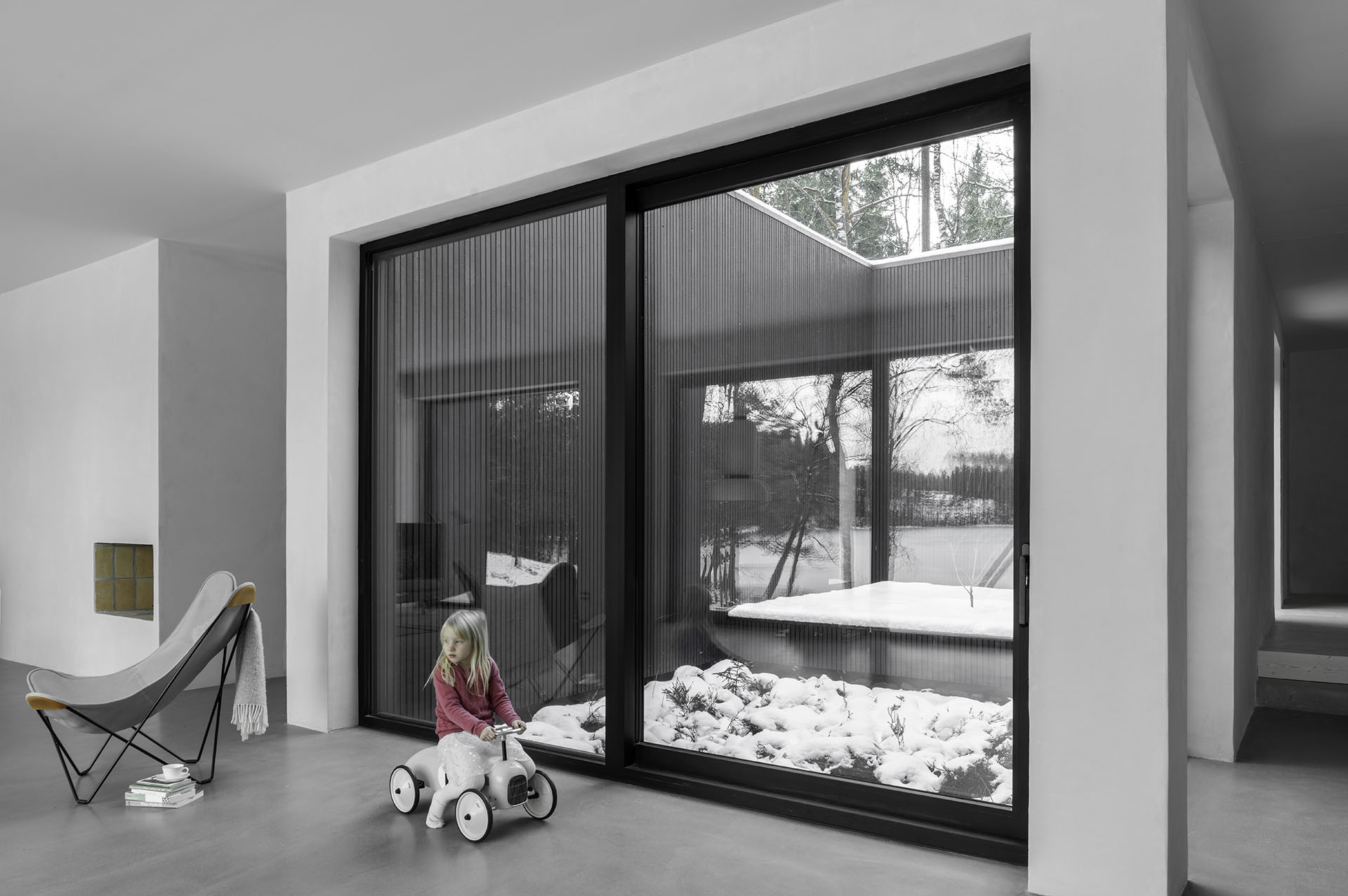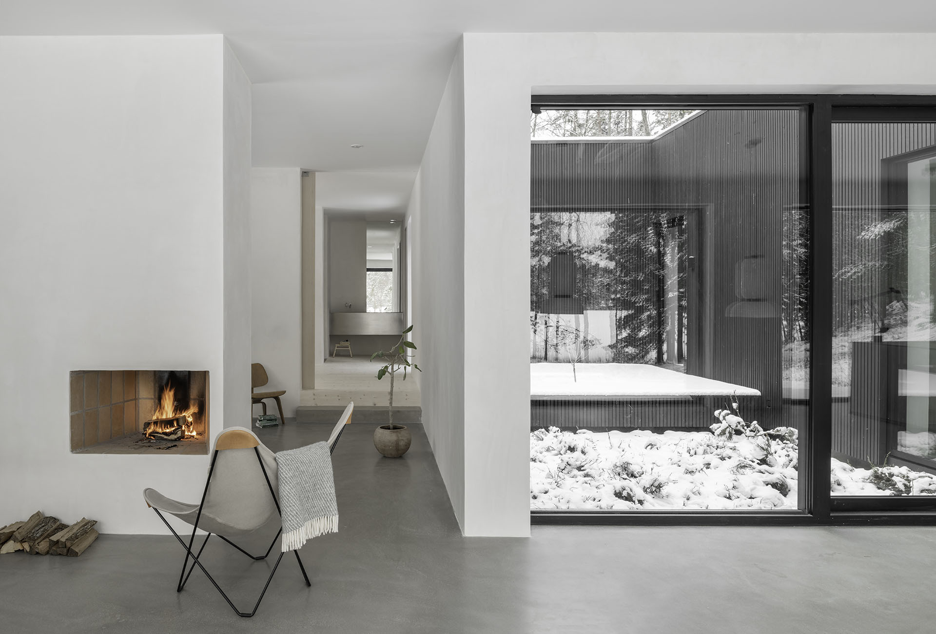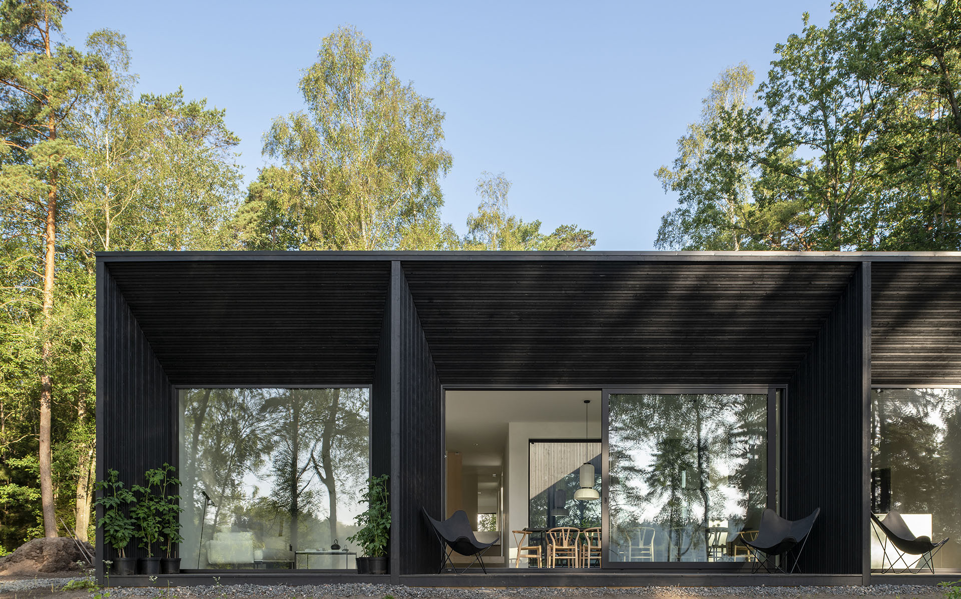 Najít dům u jezera a zároveň poblíž města je výzva, a to i ve Švédsku, které oplývá mnoha jezery. Ale mladá dvojice architektů měla štěstí. Místo skleněného domu si však nakonec navrhla „introvertní stavbu“ – impulsem ke změně byla noc strávená venku po shlédnutí hororu... V domě uprostřed divočiny si nyní místo obrazů užívá soukromou galerii – okny orámované výhledy na jezero z pohodlí domu.