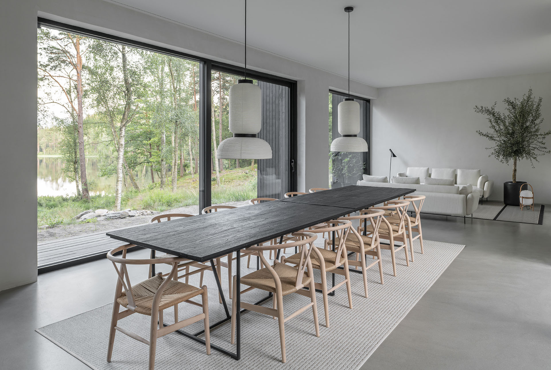 Při pohledu od břehu jezera má dům přísnou geometrickou formálnost se třemi vnějšími lodžiemi rozdělenými trojúhelníkovými pilíři, uvnitř kterých jsou skryty okapové roury pro rozložitou střechu. „Dopravit sem okna a dveře byla výzva, především kvůli jejich velikosti a izolované poloze domu,“ říká Thomas Harbom z realizační firmy Alufront. Hliníkový blokový okenní systém Schüco AWS 70 BS.HI, certifikovaný podle Cradle to cradle, splňuje ty nejvyšší energetické nároky a zároveň poskytuje maximální možnou transparentnost. Tmavé vnější rámy oken navíc vizuálně splývají s dřevem obloženou venkovní stěnou domu.