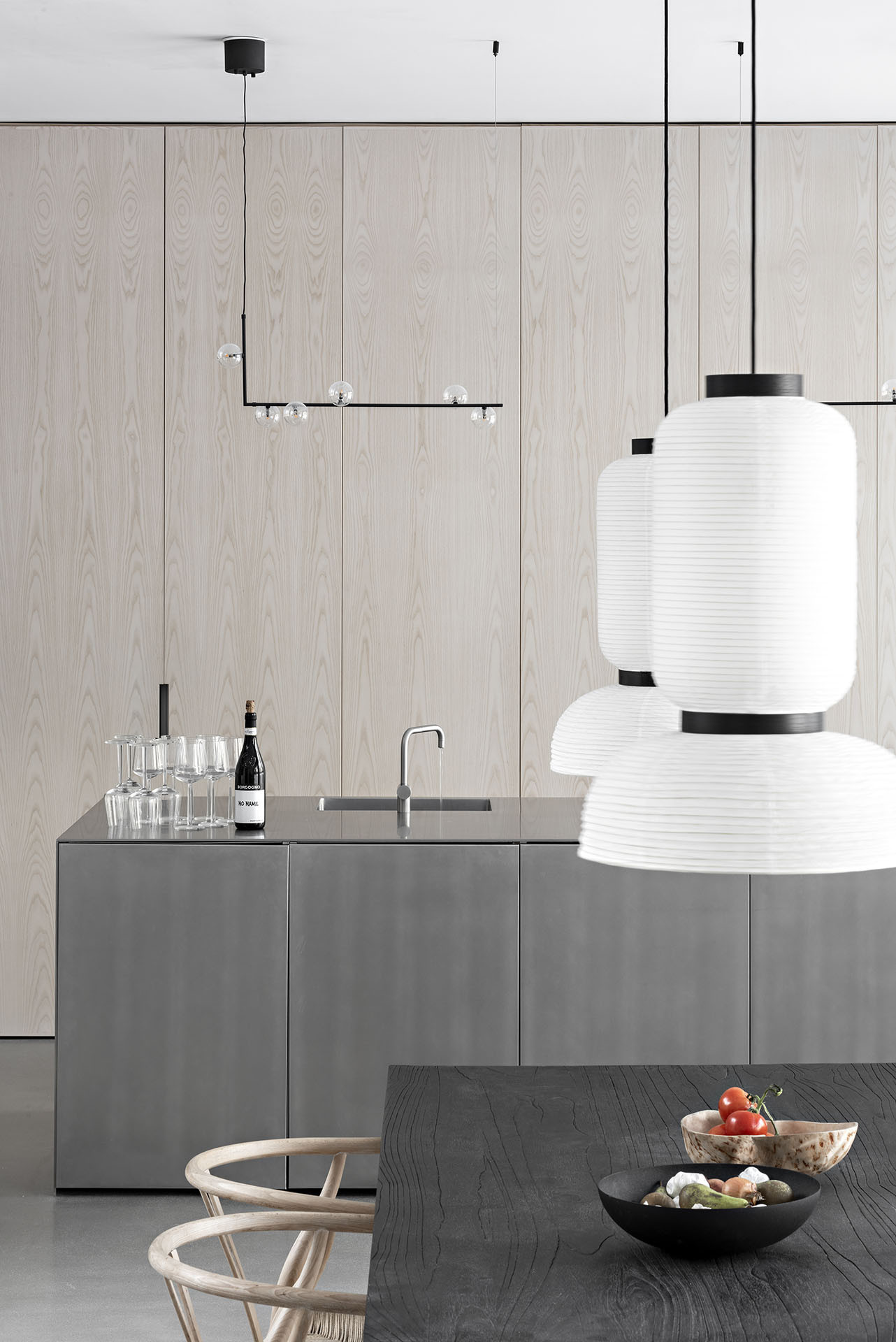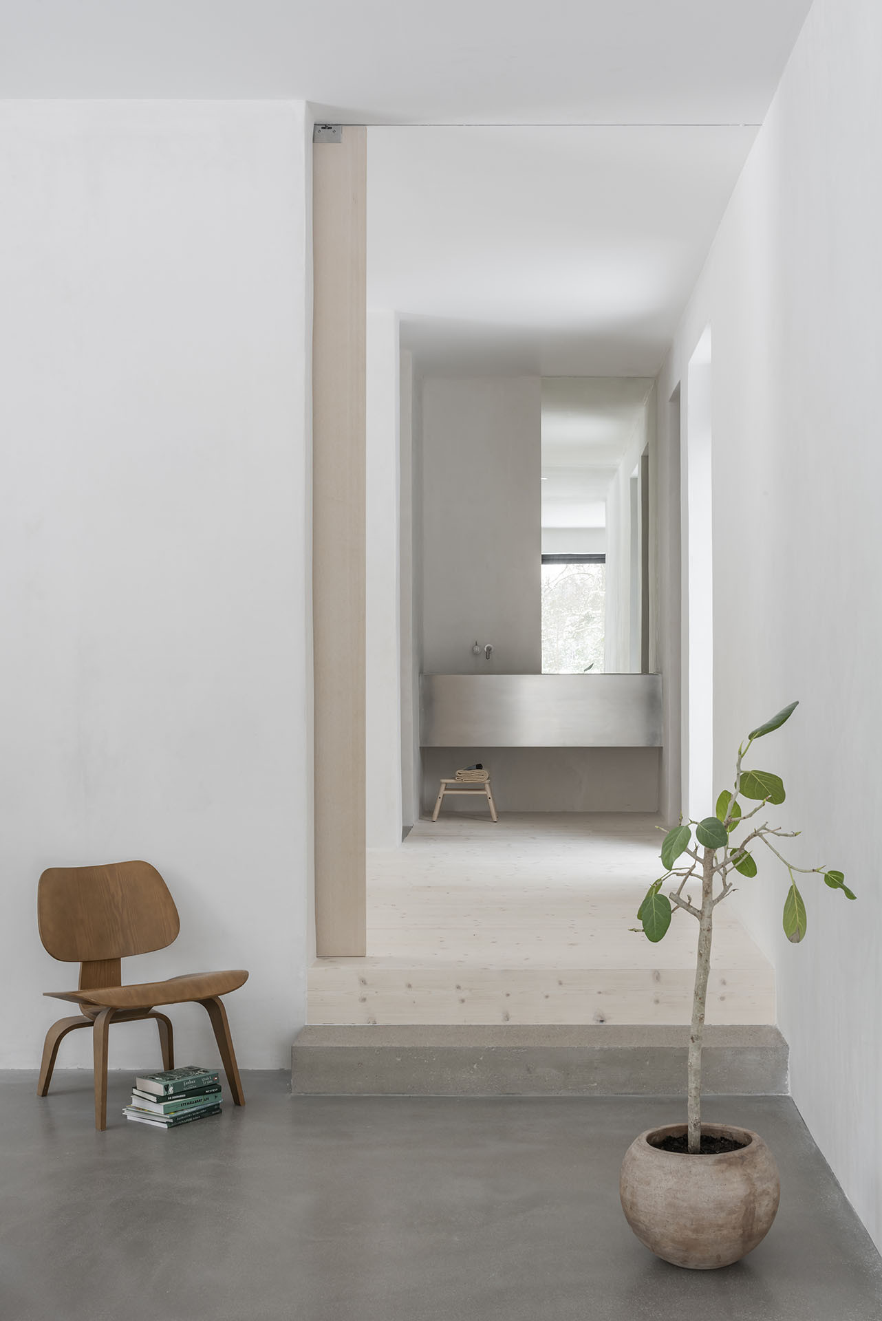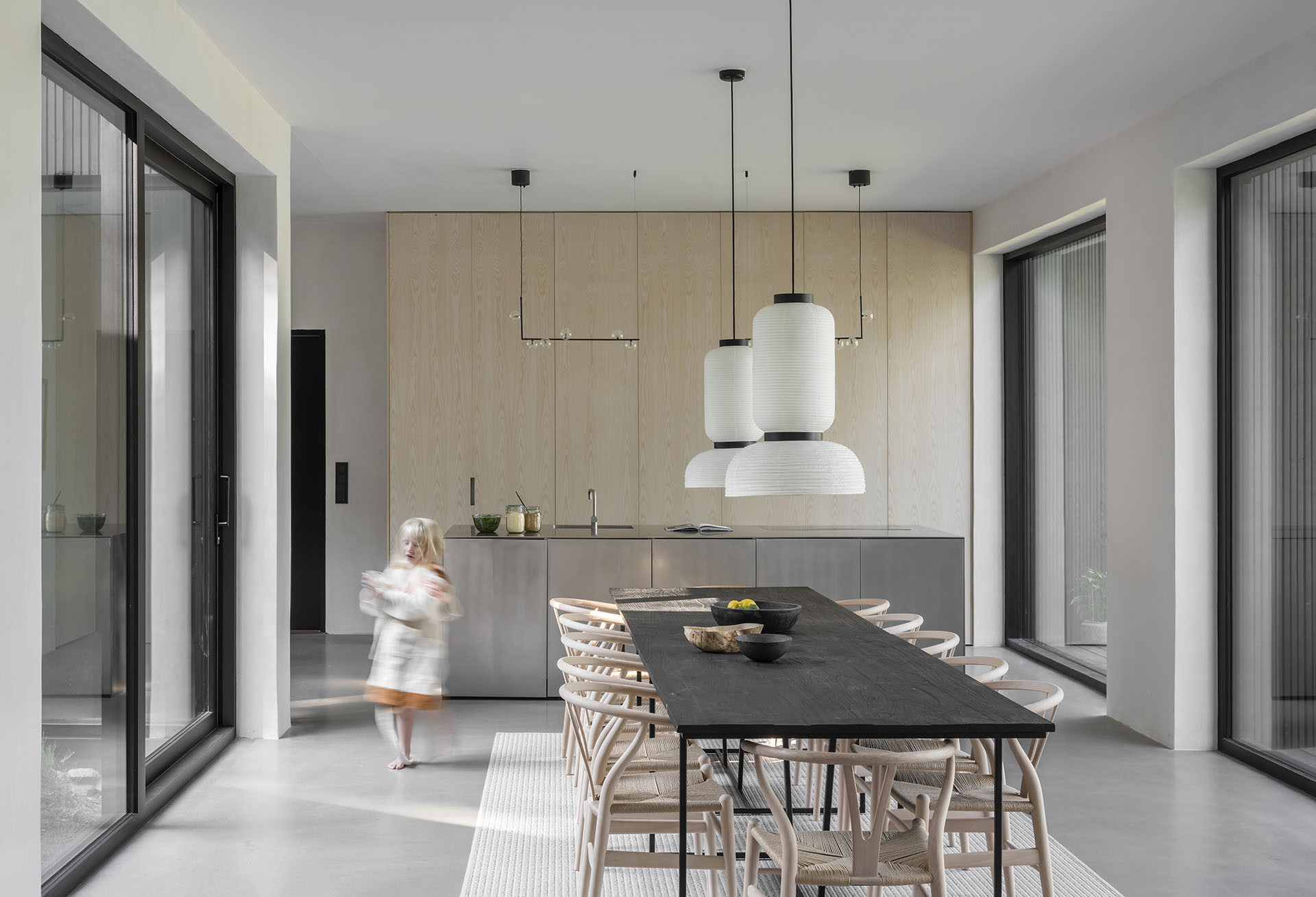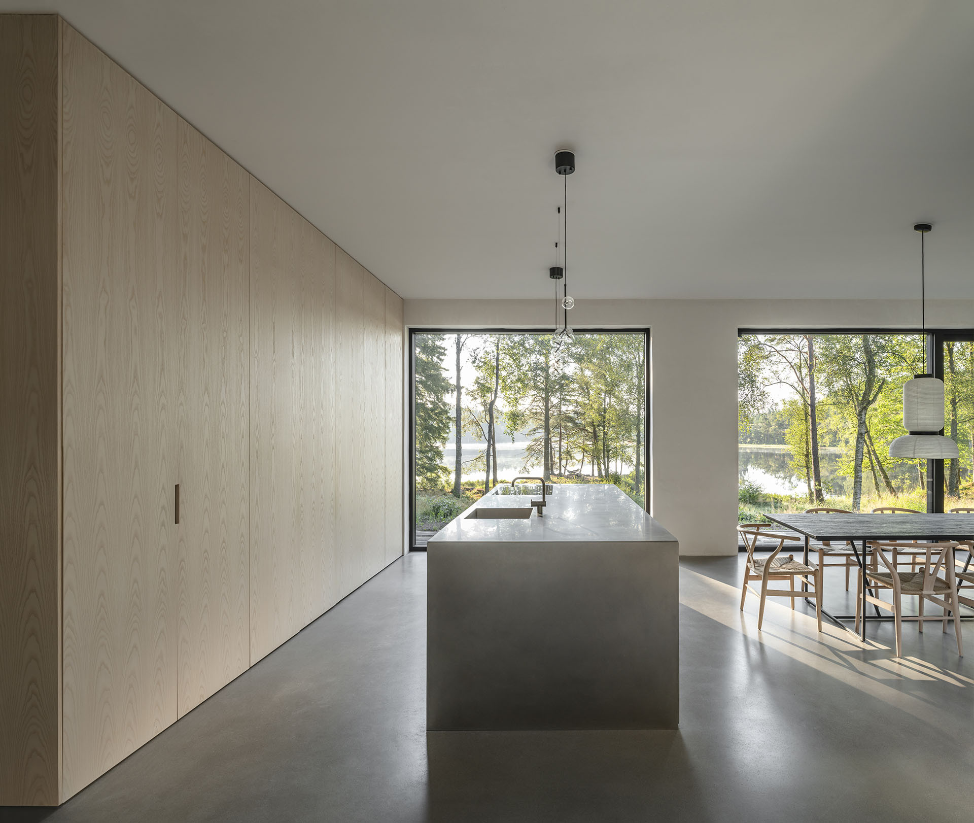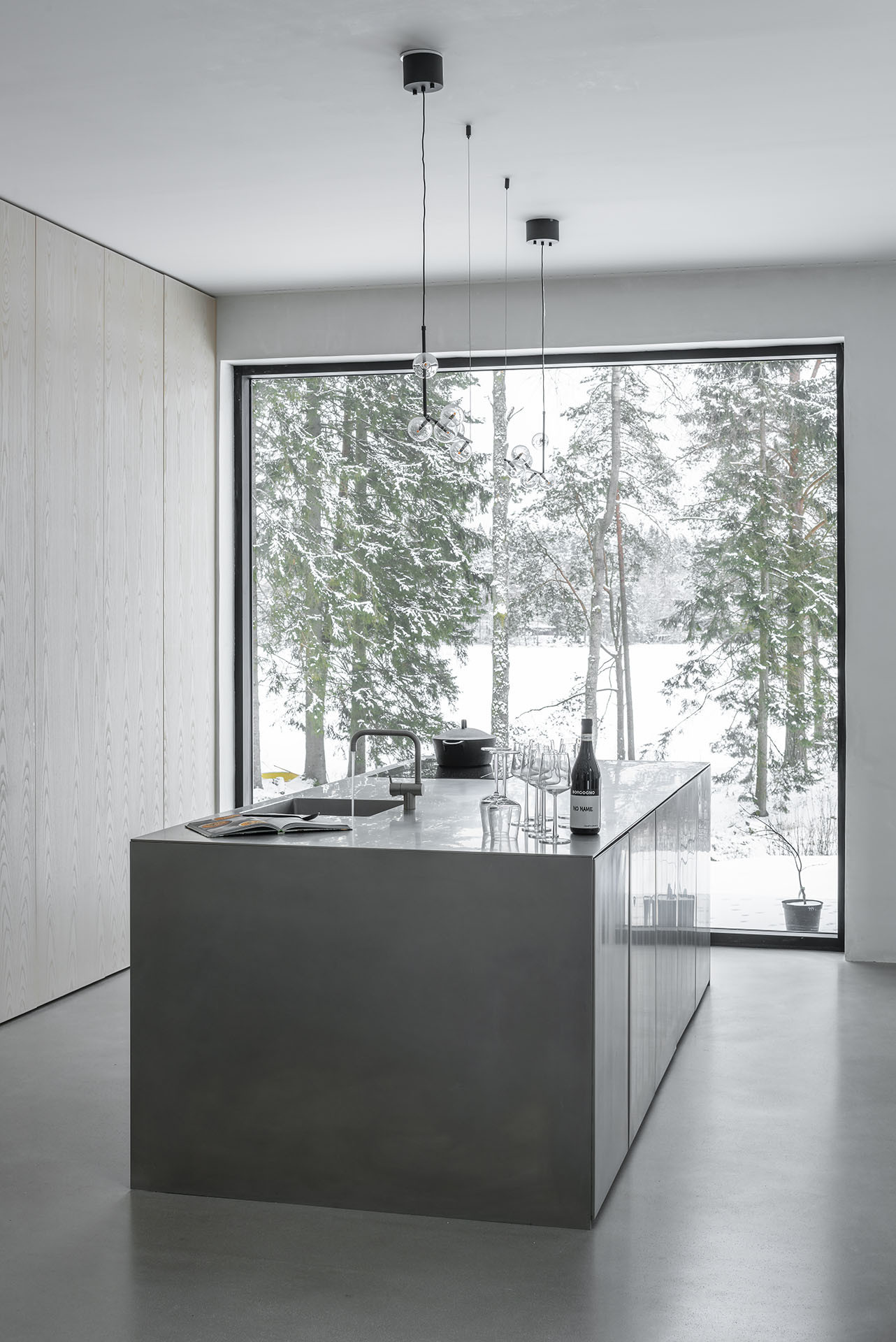 Leštěné betonové podlahy sjednocují prostor a zároveň pomáhají odrážet světlo. Středem kuchyně je samostatně stojící nerezový ostrůvek, který Boisse popisuje jako „materiál, jenž žije s počasím – některé dny vypadá šedě, jindy září.“ Stojí před řadou dřevěných skříní od podlahy ke stropu, které evokují okolní les. Kuchyňská baterie je nadčasový KV1 od společnosti VOLA, minimalistická baterie navržená Arne Jacobsenem, s povrchovou úpravou z broušené nerezové oceli, aby ladila s okolím.