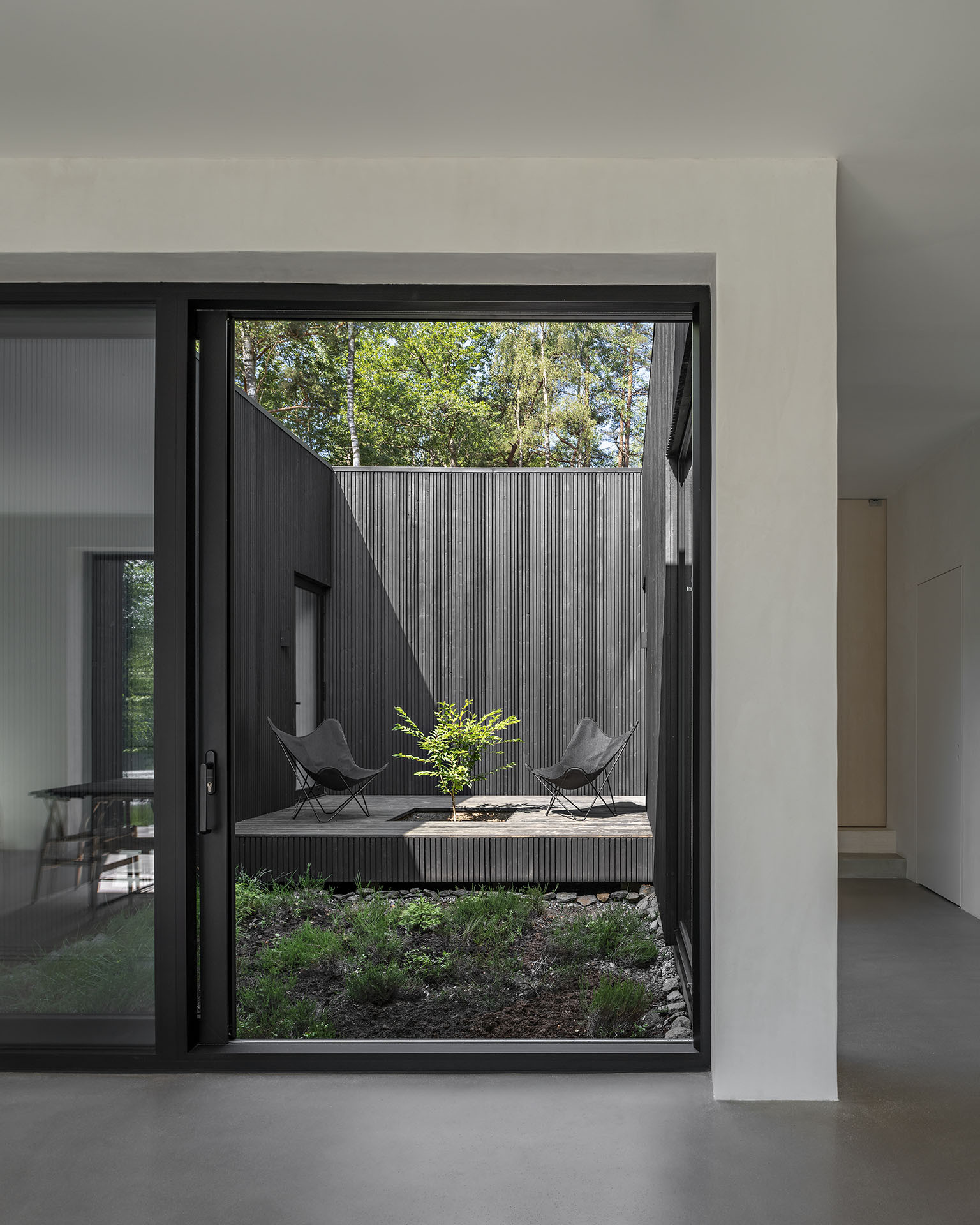Přestože rodinný dům pro čtyři osoby má obytnou plochu pouhých 162 m², vypadá mnohem větší. Je tomu tak především proto, že pokoje přecházejí jeden do druhého, aniž by se drahocenným prostorem plýtvalo na chodby. Atrium, které je integrováno do domu ve tvaru obdélníku, je geniální nápad. Otevírá dům do nebe a zaplavuje obytné i odpočinkové prostory světlem v každou denní dobu. Slouží také estetickému účelu: V závislosti na poloze slunce dochází k animované hře světla a stínů. Navíc se celá krajina odráží ve velkoplošných oknech a posuvných dveřích (hliníkové systémy Schüco), takže les a jezero vypadají dostatečně blízko na dotek.
