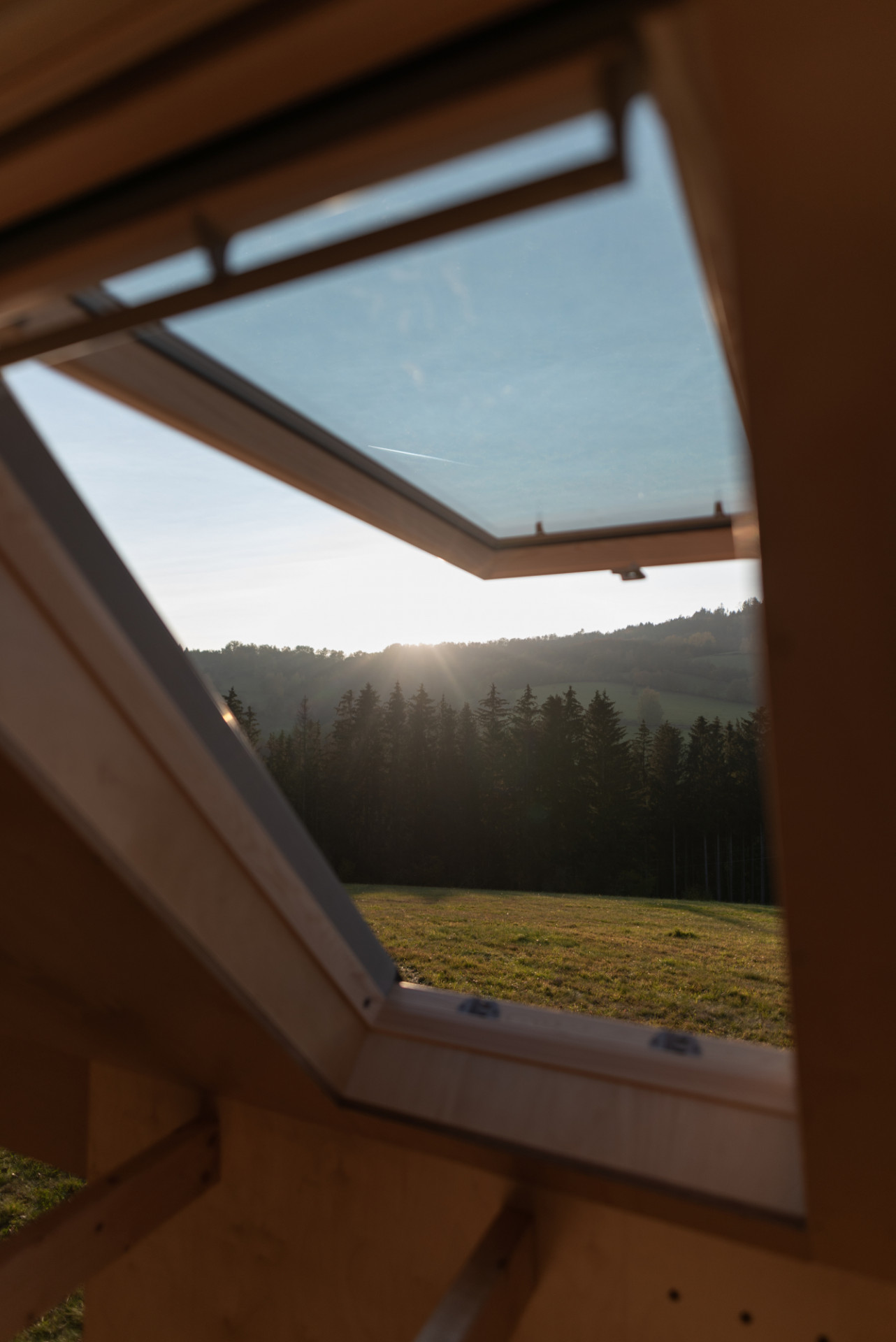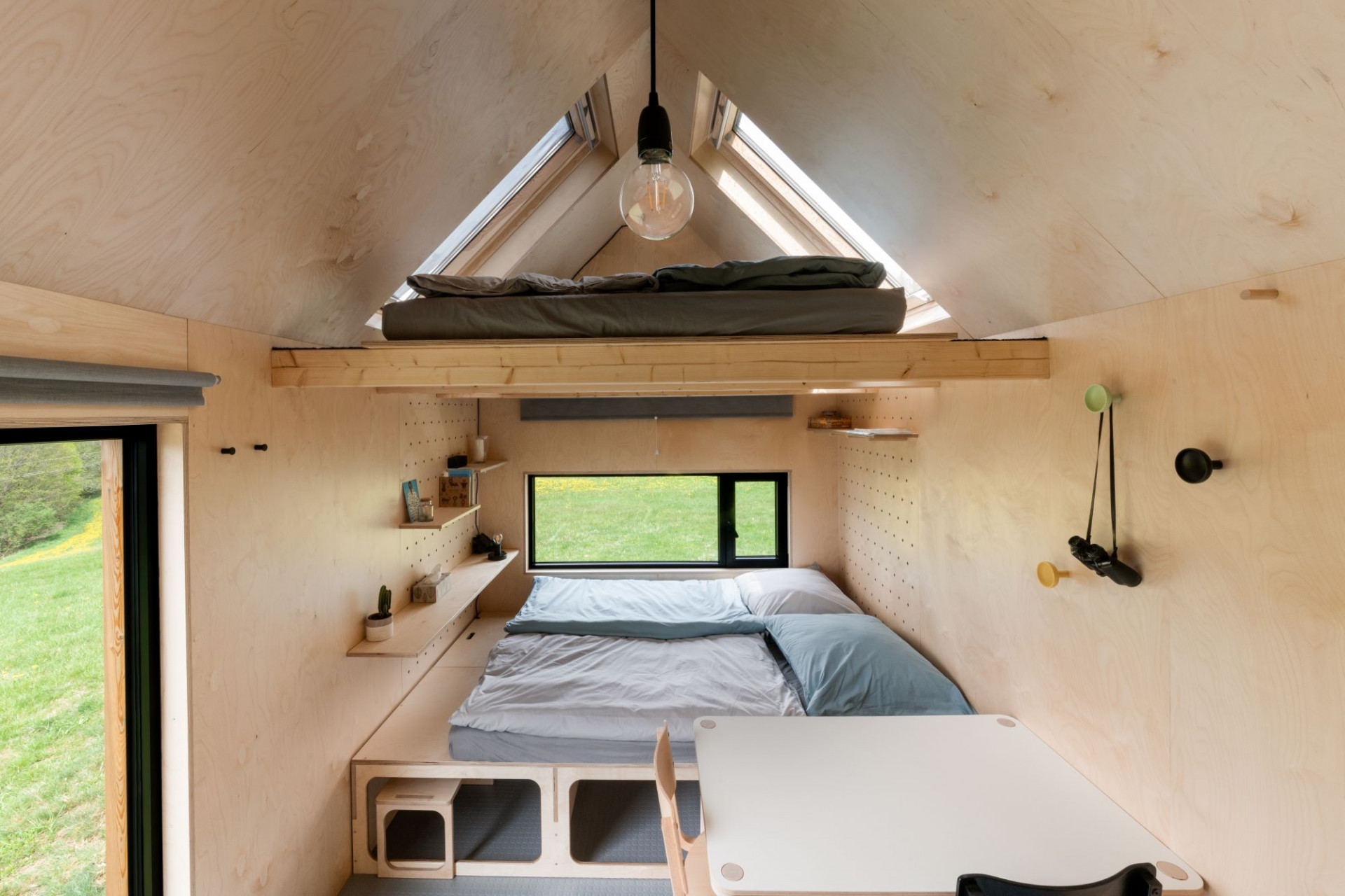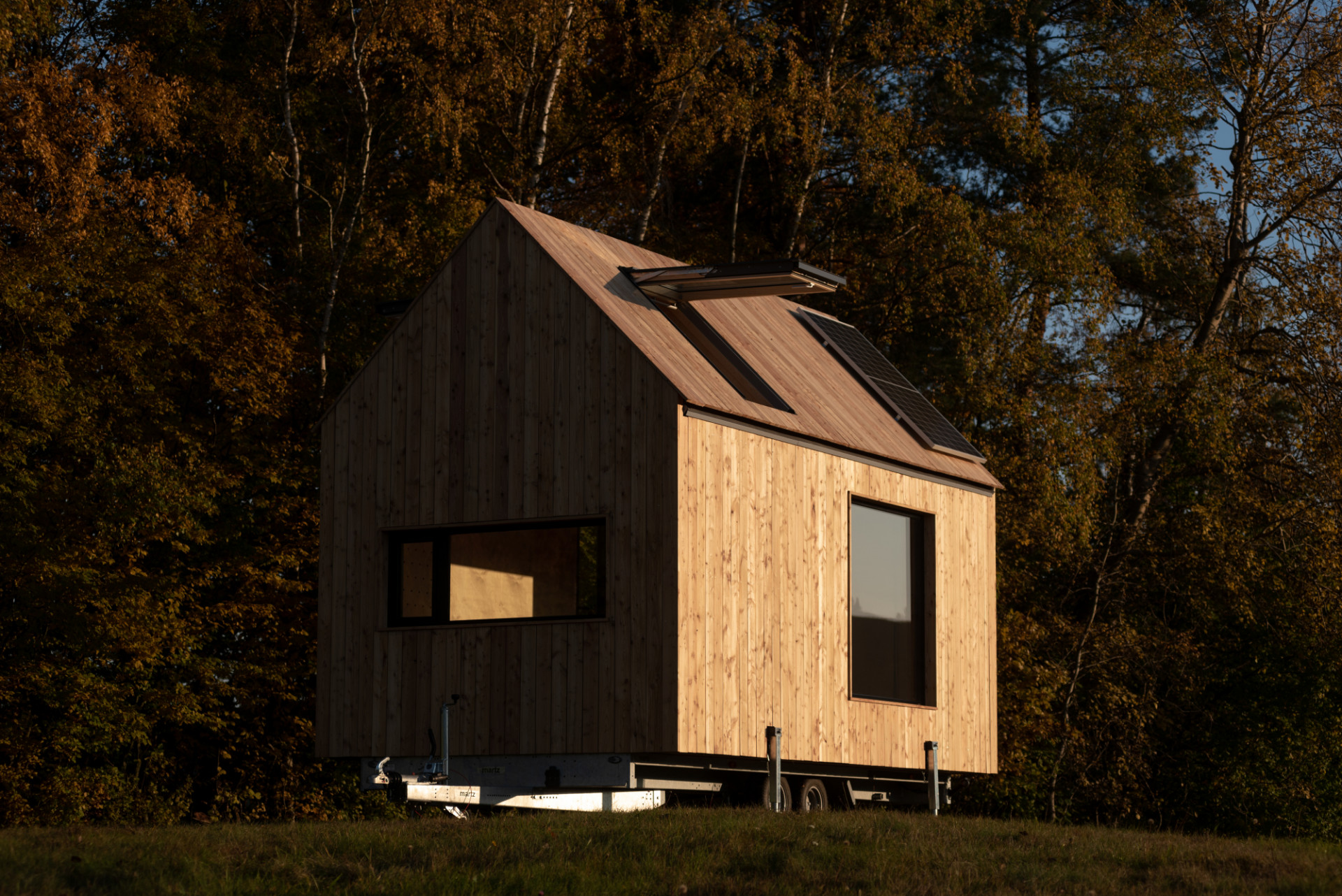 Fasádu a šikmou střechu chaty pokrývá obklad ze sibiřského modřínu, do kterého jsou zasazena různě velká okna. Bezprostřední kontakt s okolní krajinou zaručuje velkoplošné čtvercové okno, o něco intimnější výhled si lze vychutnat díky horizontálnímu oknu umístěnému u spodního spacího dvoulůžka. O vizuální kontakt s přírodou ale nepřijdete ani při pobytu v posteli – díky střešním oknům VELUX totiž střecha slouží jako jedinečná vyhlídka do korun stromů i na noční oblohu plnou hvězd. Můžete se tak spolehnout, že si v tomto mobilním domečku zaručeně odpočinete ve dne i v noci.