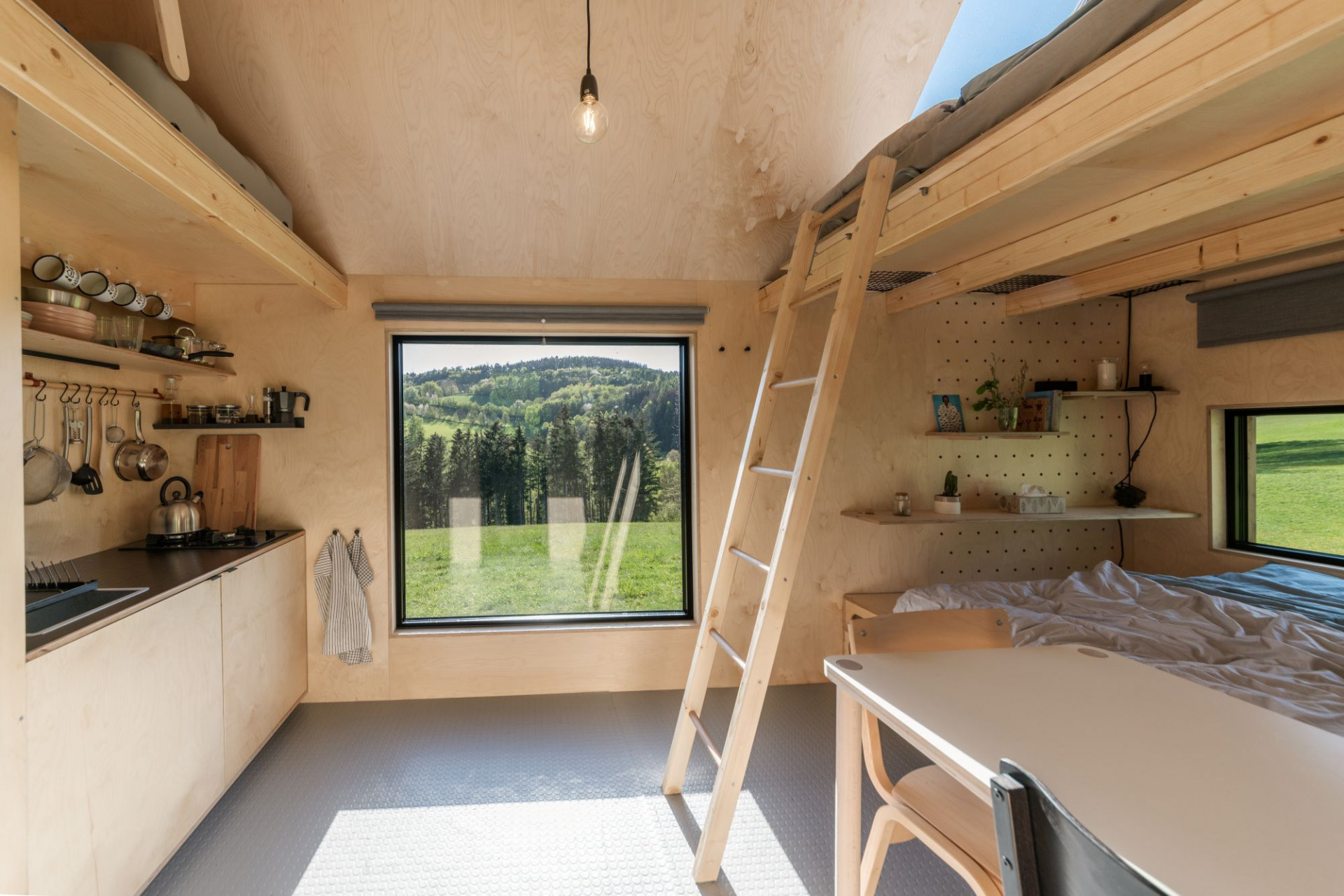 Interiér chatky je s ohledem na maximální efektivnost využití prostoru vyroben na míru. Architekti rádi experimentují se dřevem, do interiéru volili prvky z březové překližky. Díky spacímu patru může domek ubytovat až čtyři osoby, tak aby měli dostatek komfortu i místa pro spánek. V kuchyňce si hosté mohou uvařit na plynovém vařiči, přičemž plyn je také zdrojem vytápění objektu.