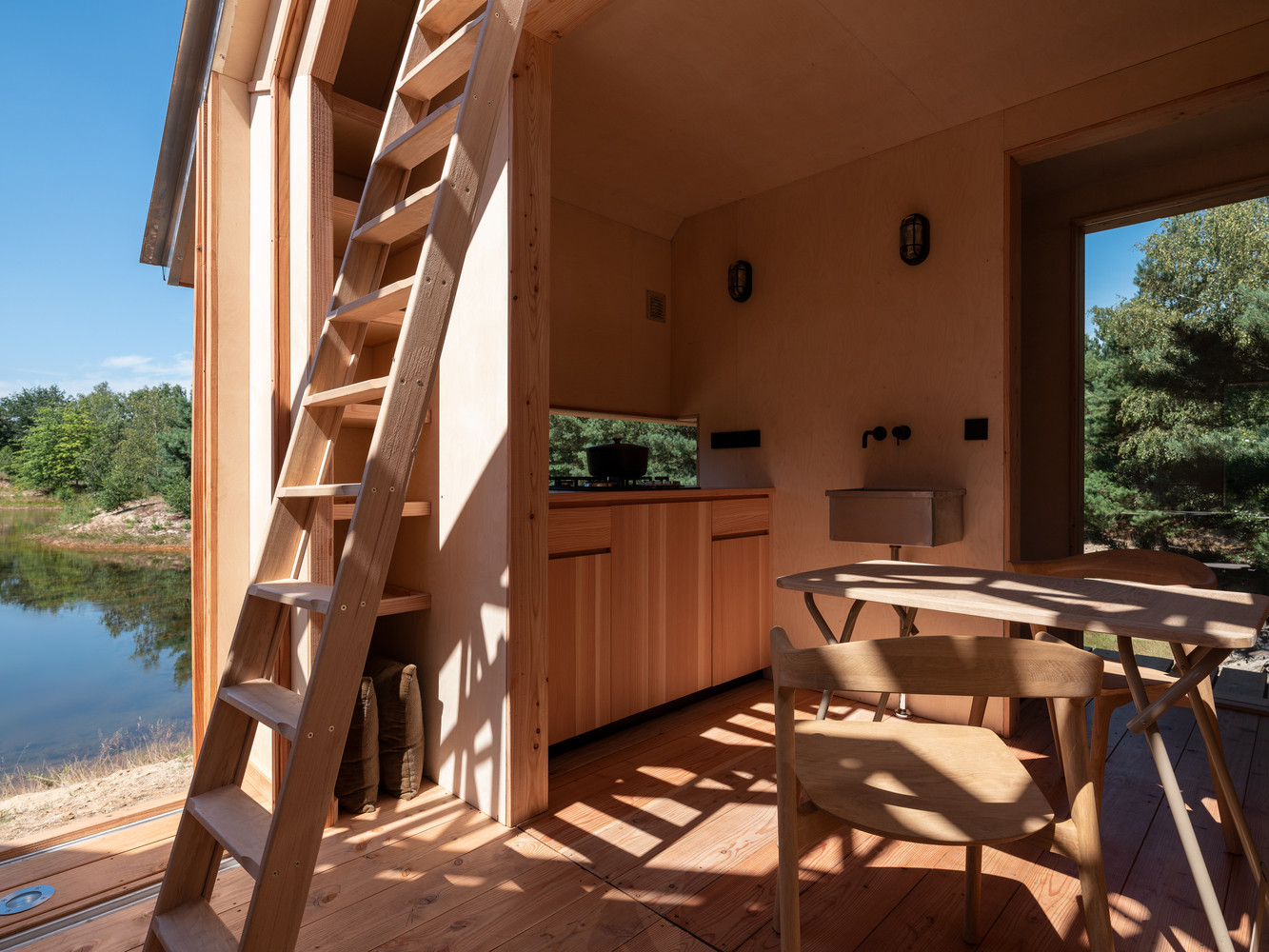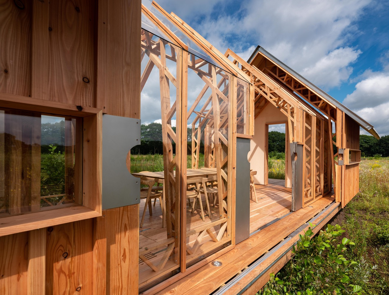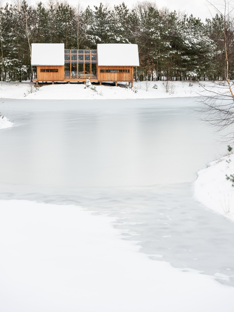 Základním materiálem je modřínové dřevo, a jelikož je celý koncept silně ekologicky zaměřený, je ponechané ve své přírodní podobě. Vnitřek je možné vytápět kamny nebo elektrickým topením. V porovnání s vertikálními okny u zahradního domu se architekti tentokrát rozhodli pro horizontální. Díky jejich umístění hned pod okrajem střechy se dovnitř dostává sluneční záření jedině nepřímo, což brání přehřívání v letním období.
