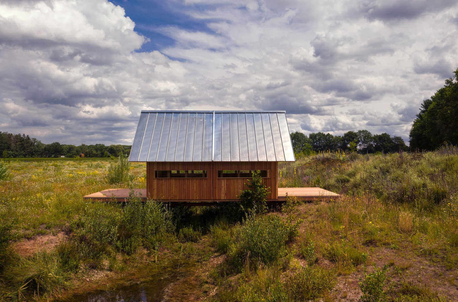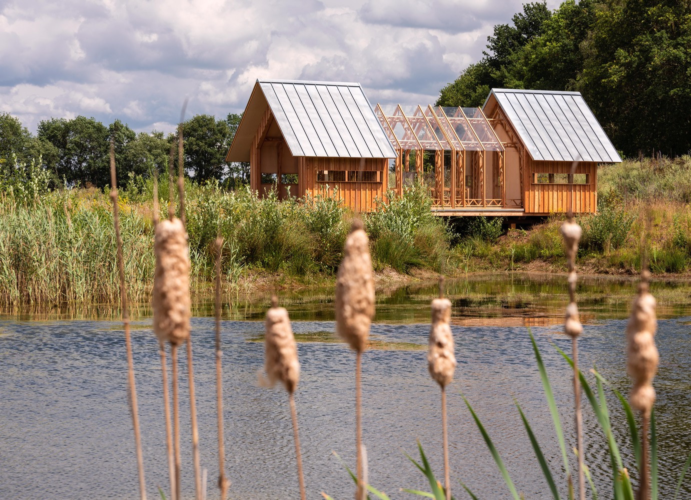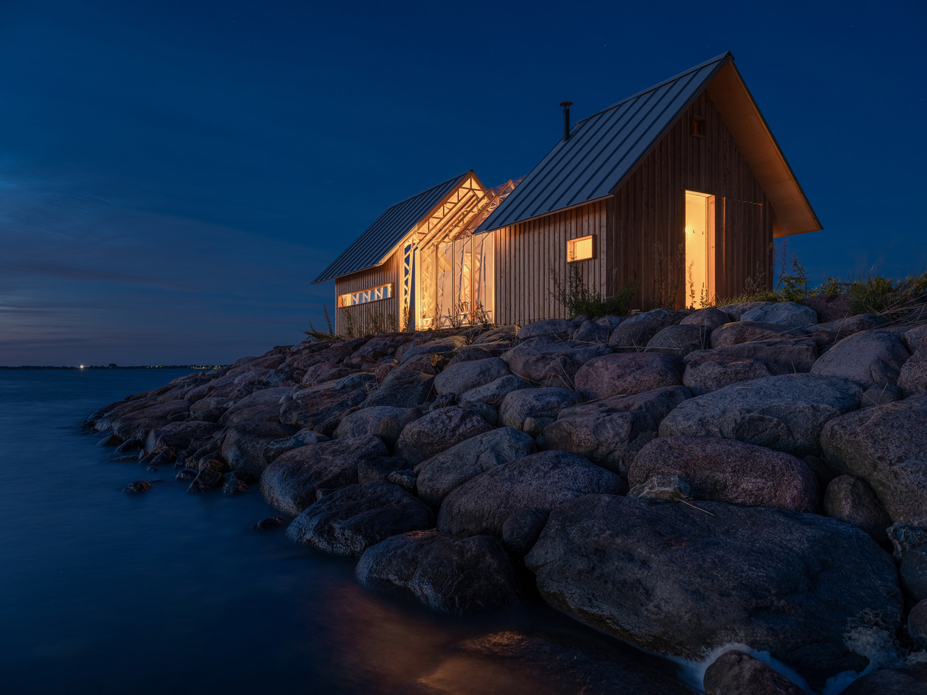 Základním materiálem je modřínové dřevo, a jelikož je celý koncept silně ekologicky zaměřený, je ponechané ve své přírodní podobě. Vnitřek je možné vytápět kamny nebo elektrickým topením. V porovnání s vertikálními okny u zahradního domu se architekti tentokrát rozhodli pro horizontální. Díky jejich umístění hned pod okrajem střechy se dovnitř dostává sluneční záření jedině nepřímo, což brání přehřívání v letním období.