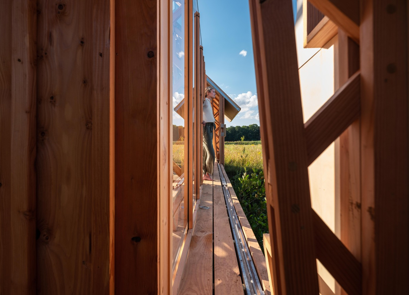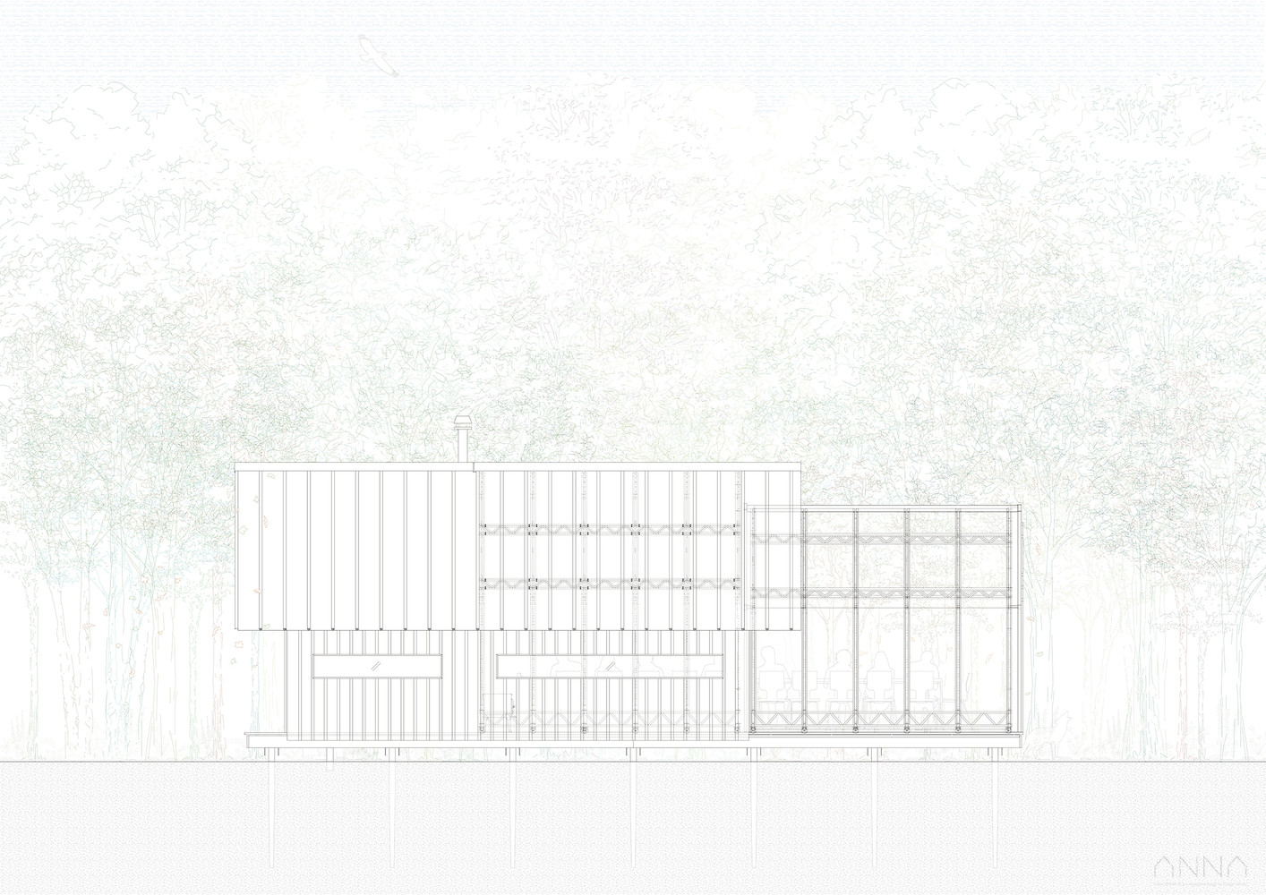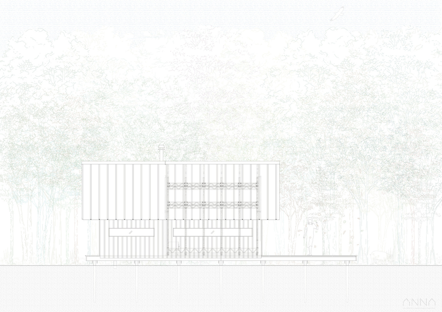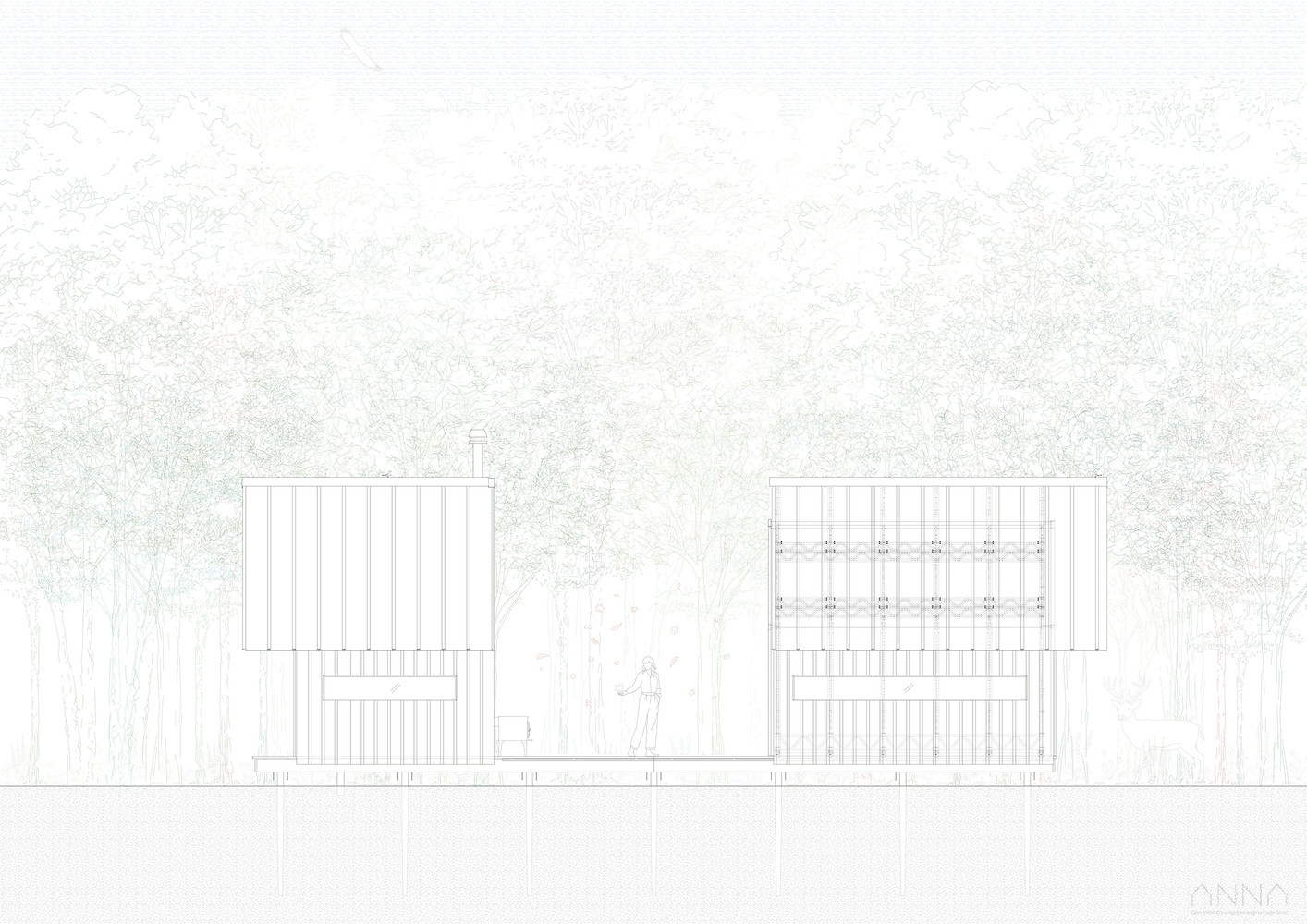 ANNA je dřevěná chatka s posunovatelnými stěnami. Podobně jako si oblékáme různé vrstvy oblečení, můžeme volit jednotlivé vrstvy tvořící fasádu tak, aby celkové uspořádání vyhovovalo dané situaci. Otevřenou terasu pak lze zastřešit proskleným štítem, kde lze trávit čas v kontaktu s okolní přírodou i v případě nevlídného počasí.