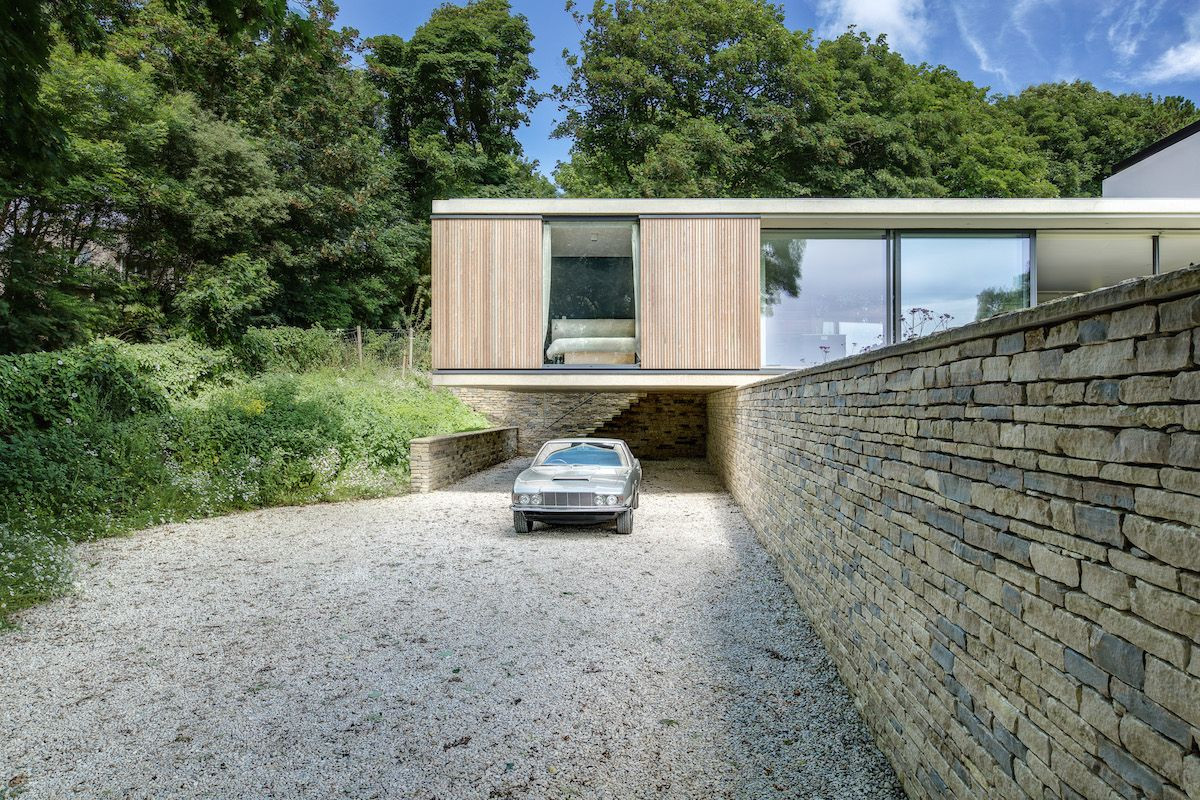 Dům na anglickém venkově v pobřežním městě Swanage částečně přesahuje přes mohutnou kamennou zeď. Architekti použili střešní a podlažní plochu z betonu, které společně fungují jako konzolový nosník. Přečnívající část objektu potom slouží jako parkovací přístřešek pro veterán Aston Martin.